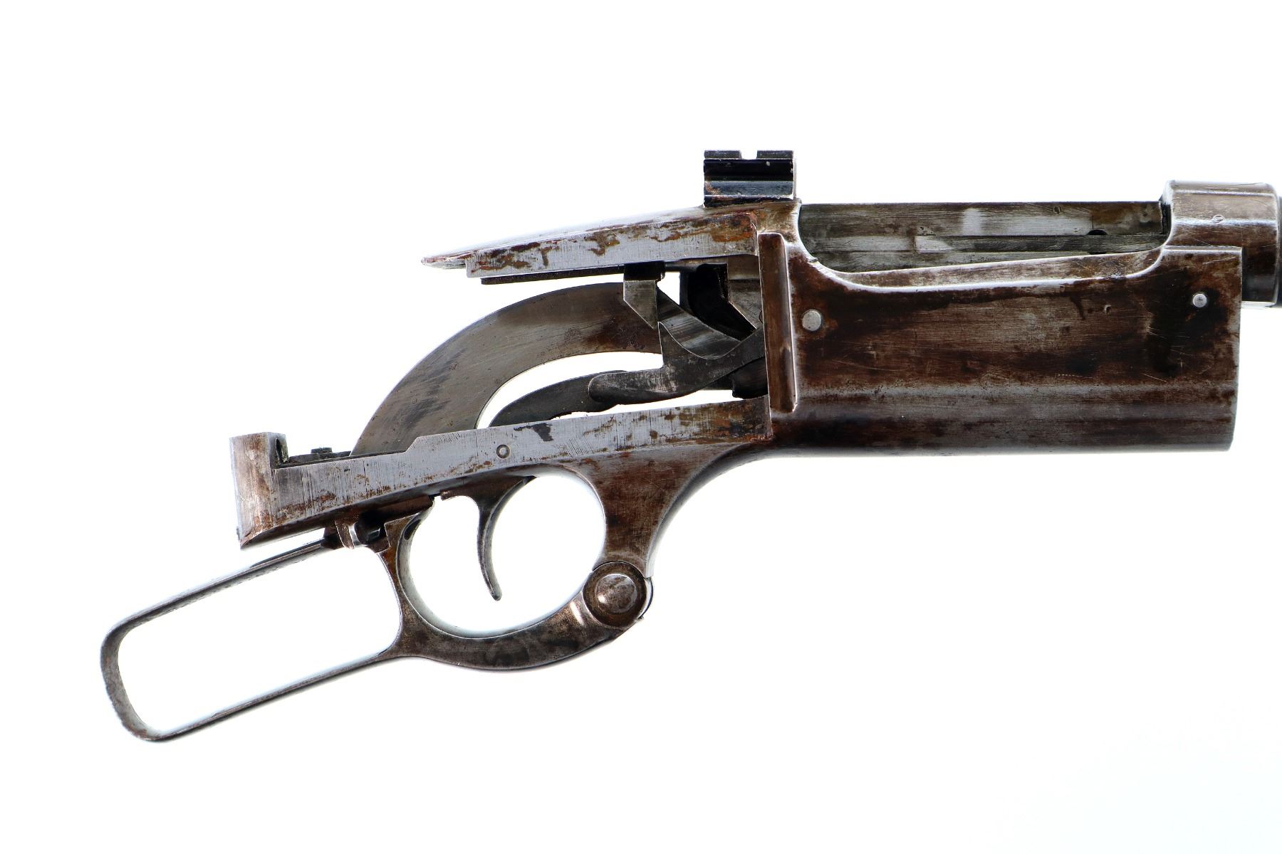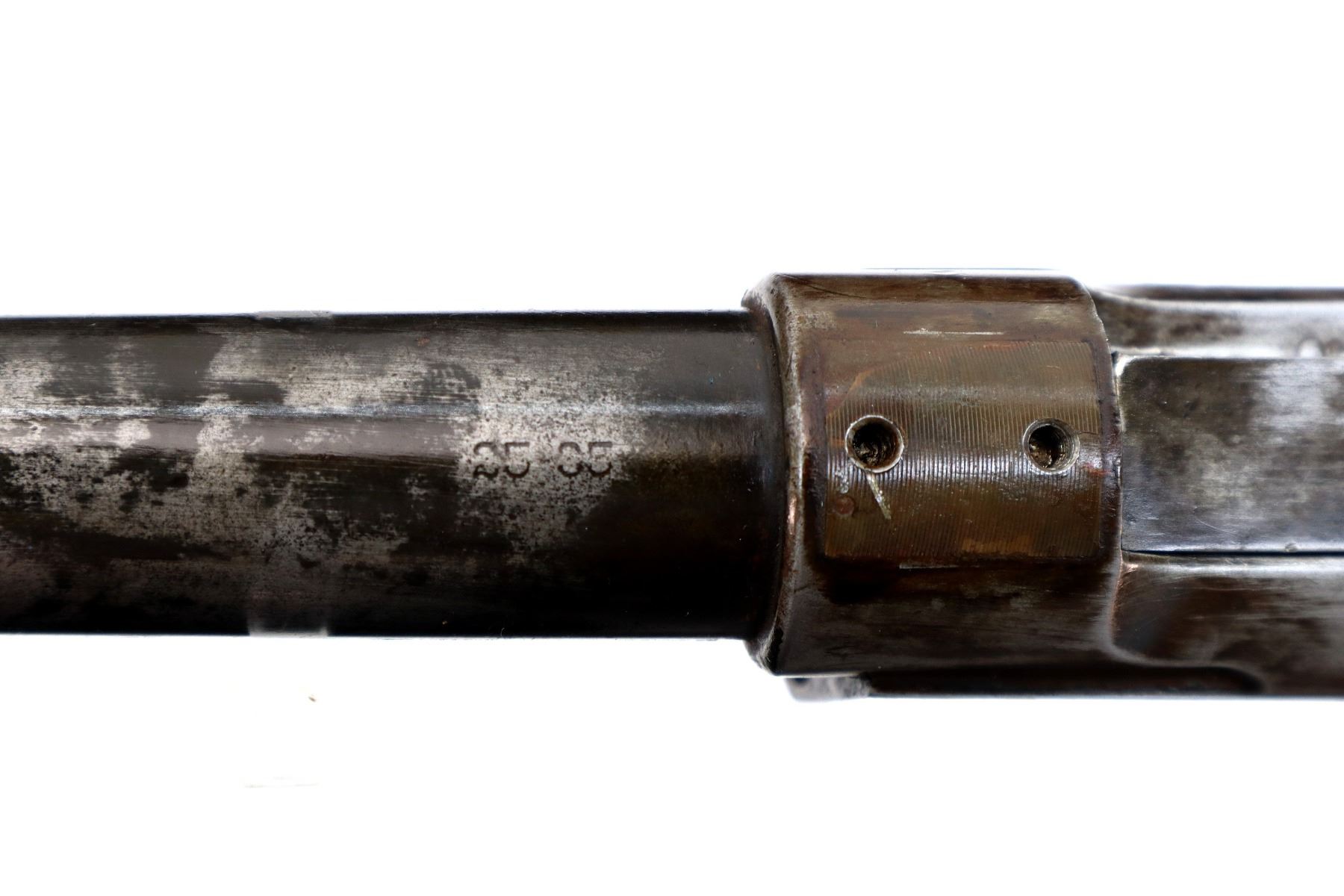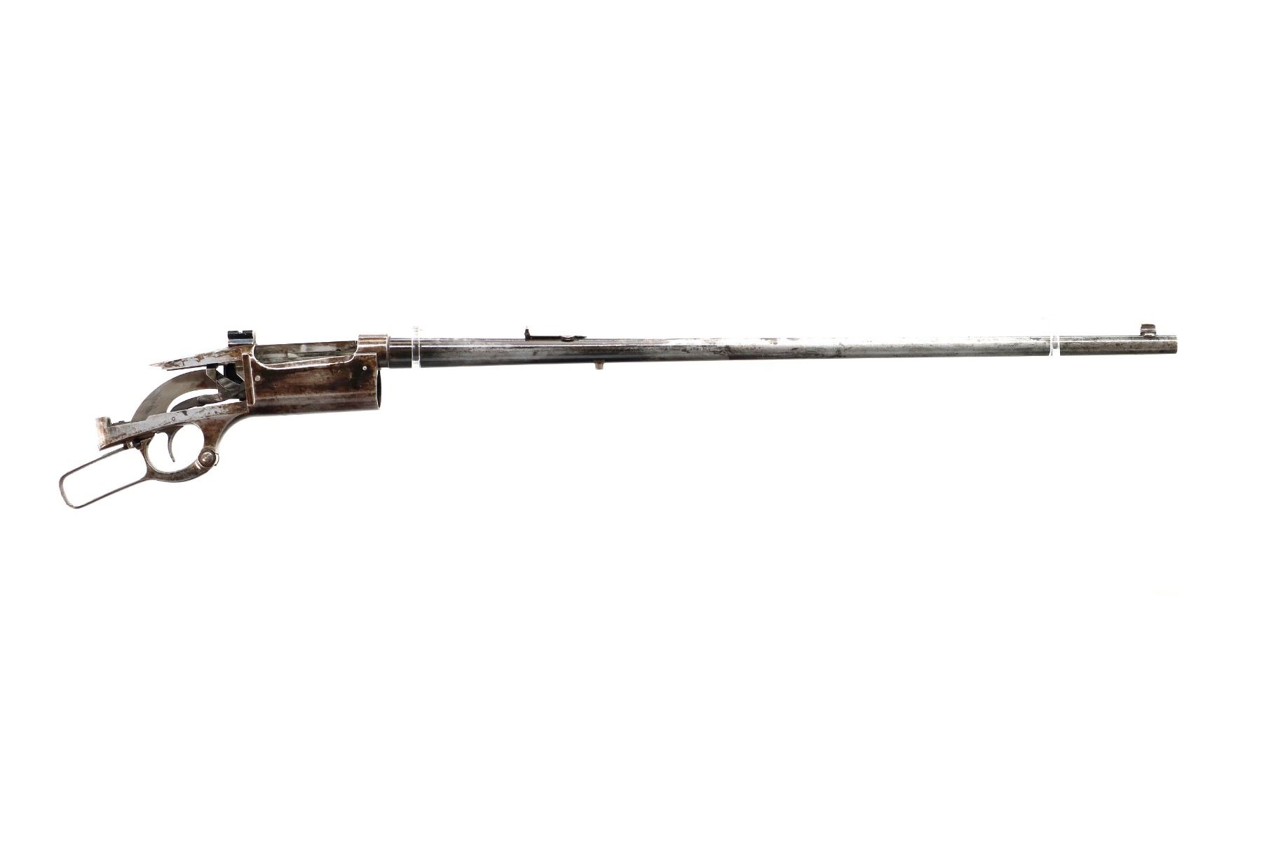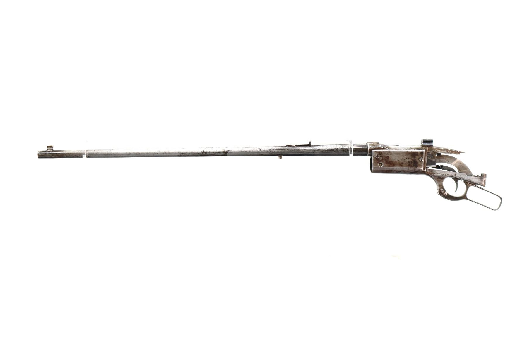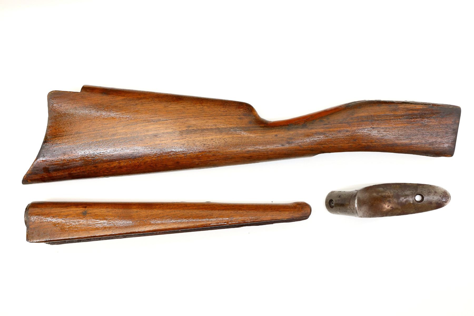 Main Description: Blade front sight, adjustable folding u notched rear sight, receiver drilled and tapped with a rear base only installed, square cocking indicator, includes bolt, lever, trigger parts, smooth curved steel butt plate, and two piece wood stocks, forearm is chipped and cracked, straight grip chipped and cracked behind receiver, stock cracked at toe, missing swivel holes is present. Does not include some small screws and possibly other parts.