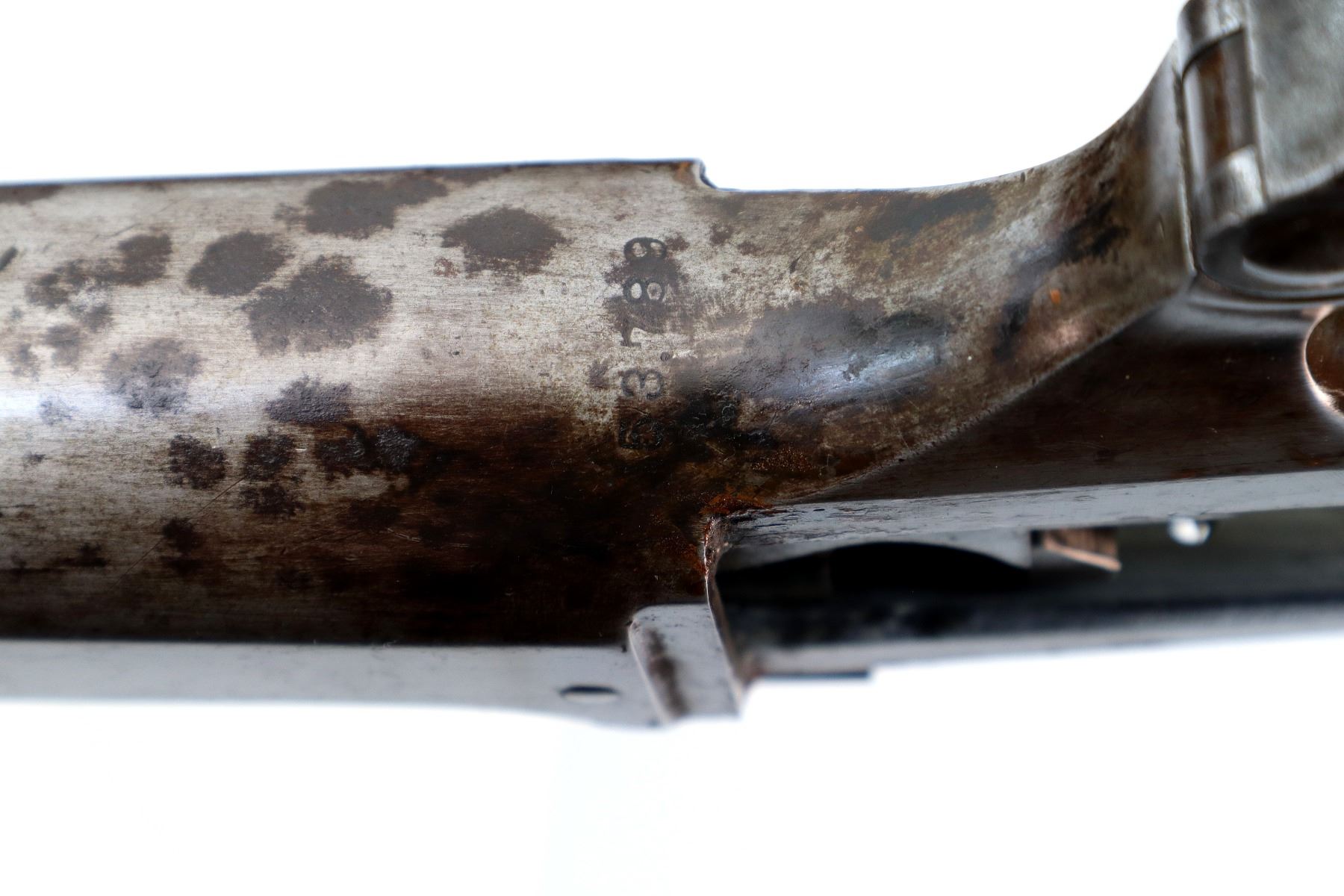 Wear: Metal finish turning silver grey with pitting, rust, scratches, handling marks and wear. Stock shows marks, scratches and wear.