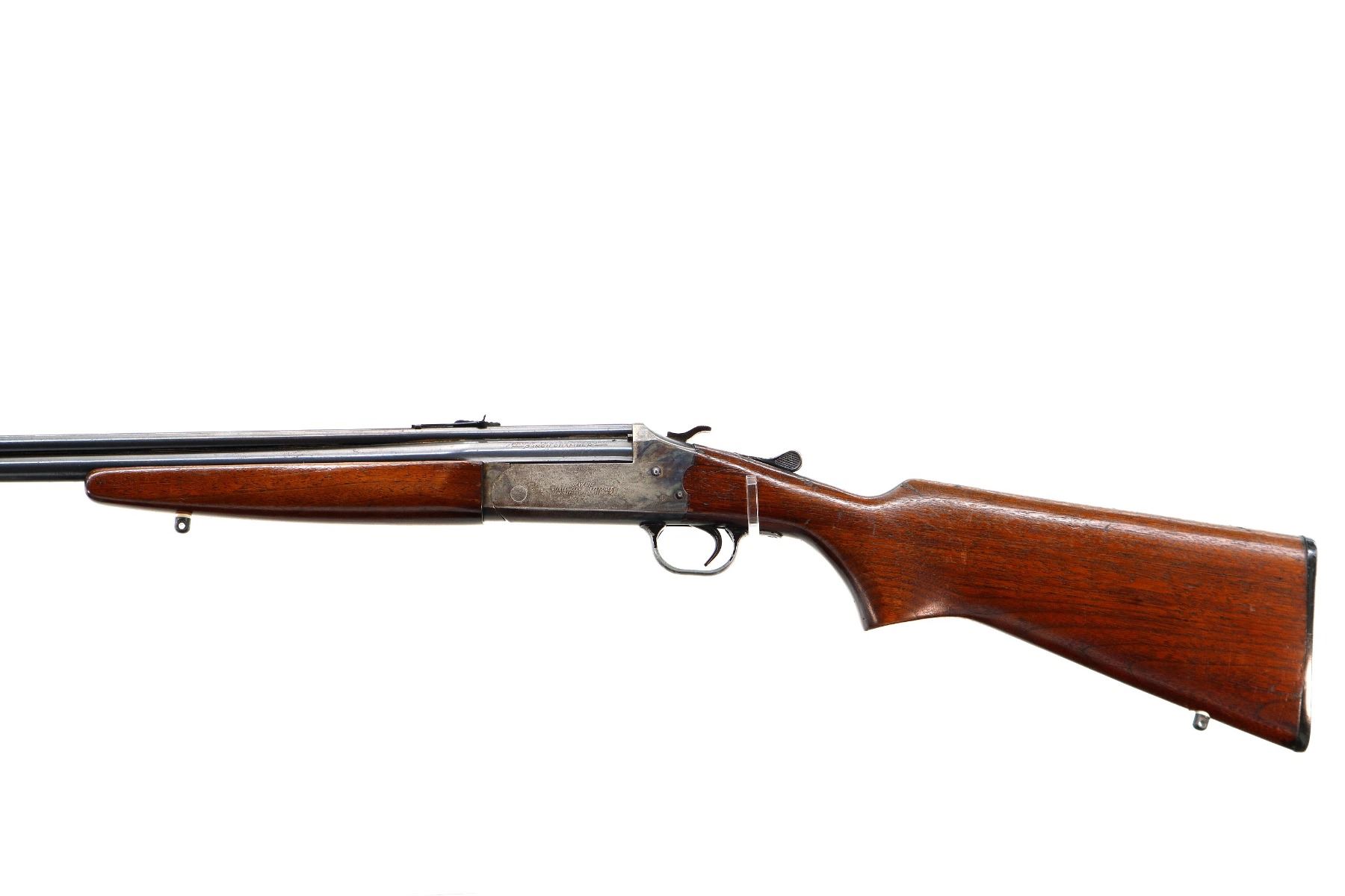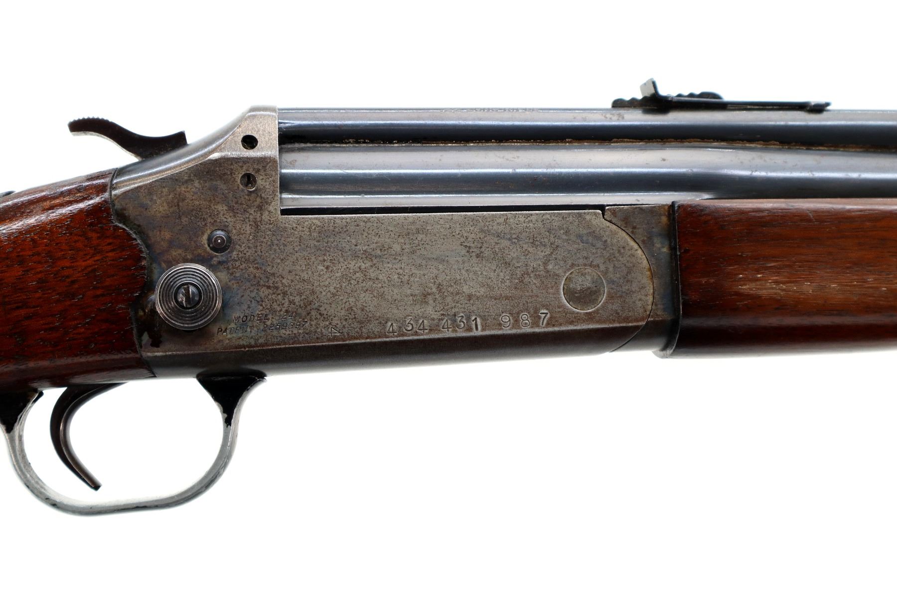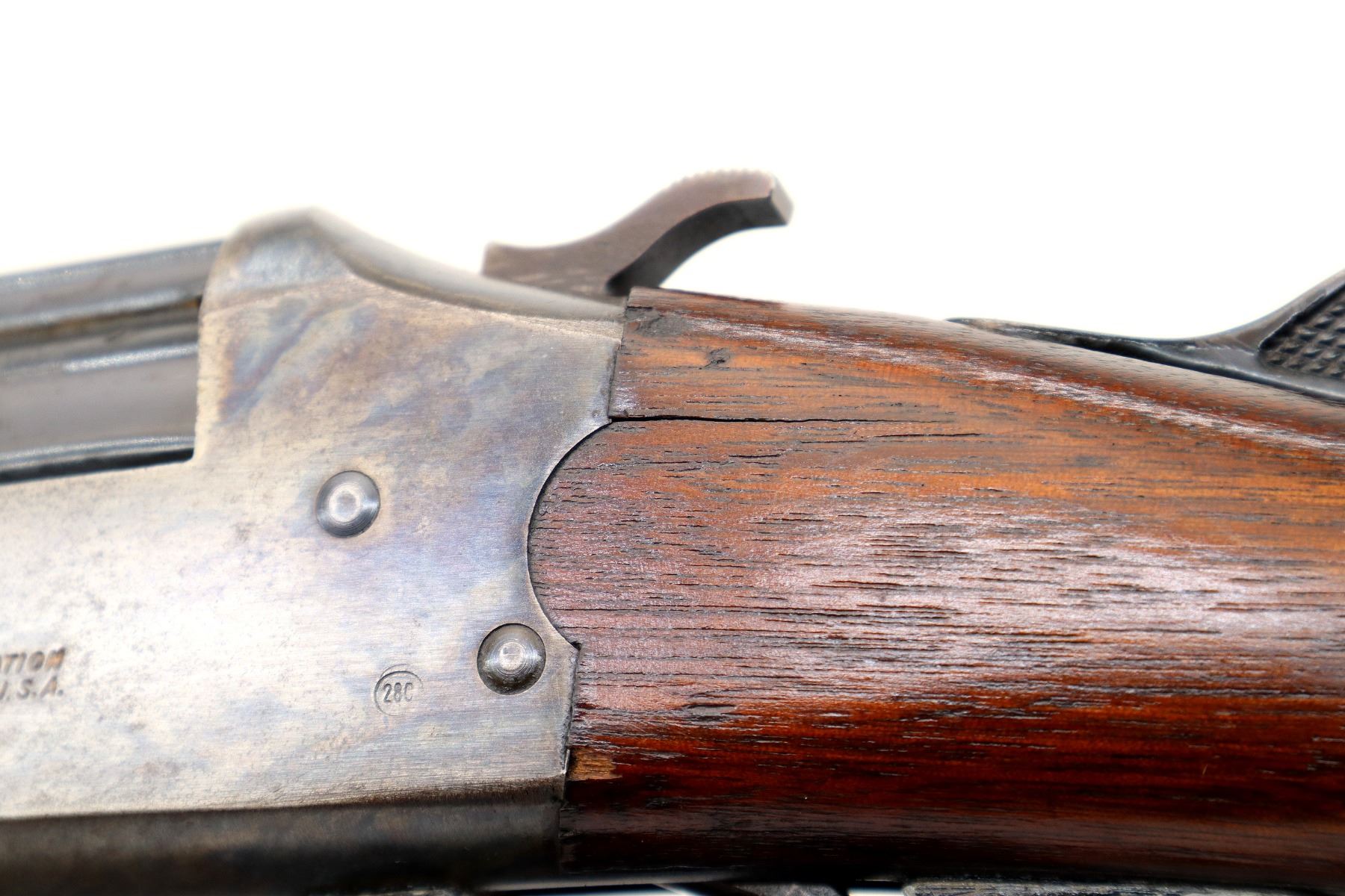 Main Description: Blade front sight with ramp, adjustable u notched rear sight, blued barrels, colour case hardened receiver, grooved spur hammer, barrel selector on right side, extractors. Two piece wood stocks, pistol grip, chipped and cracked behind receiver and upper tang. Grooved black polymer butt plate, stock cracked and repaired at toe, swivel studs.