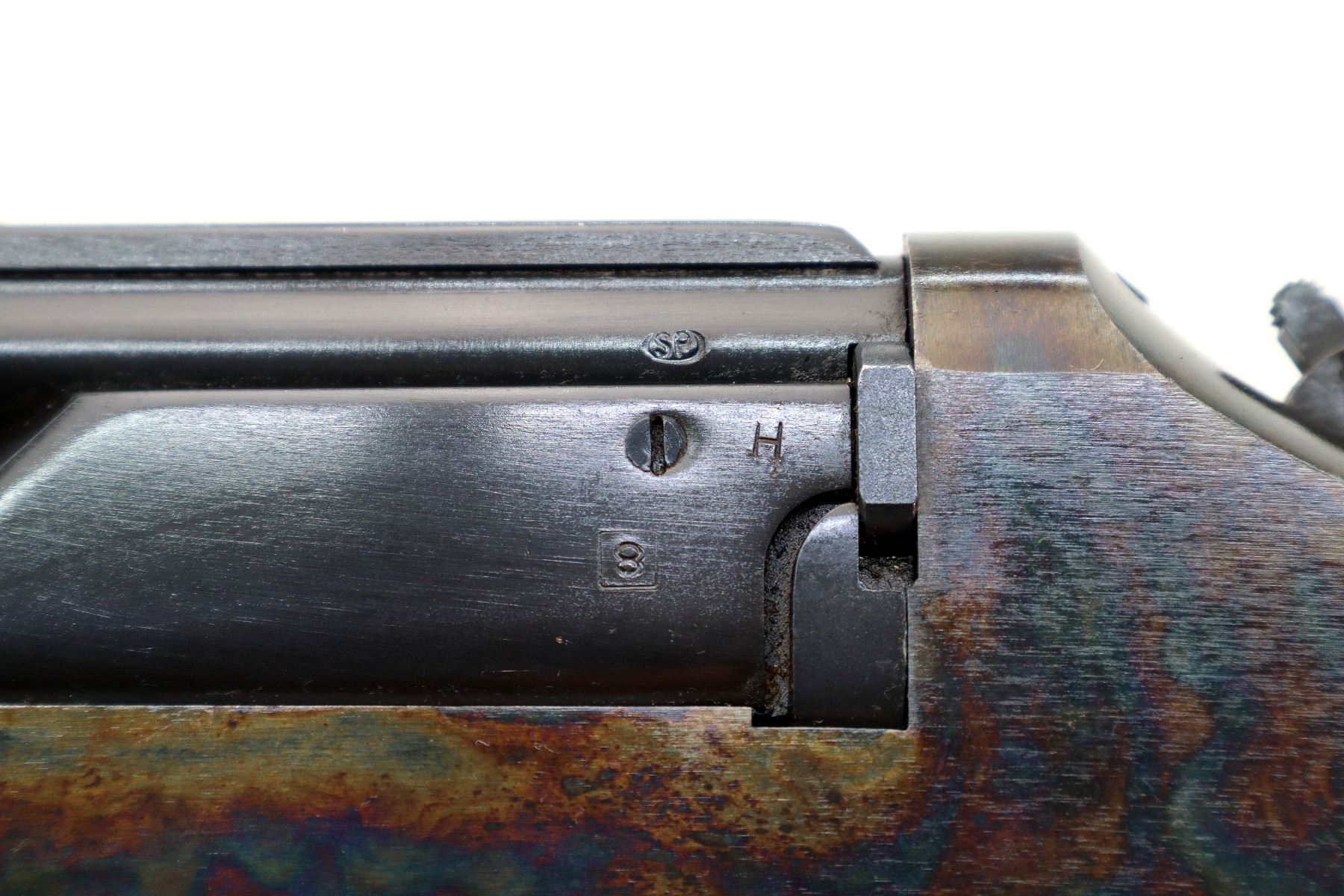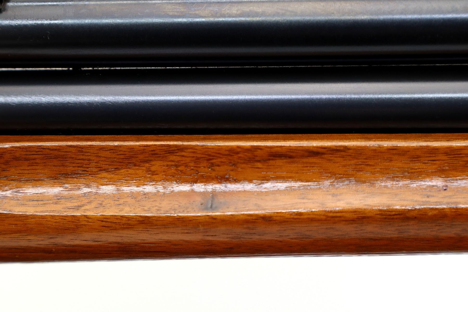 Main Description: Blade front sight, adjustable folding u notched rear sight, blued round barrels drilled and tapped at rear for scope mount with plug screws installed, colour case hardened receiver, grooved spur hammer with barrel selector. Two piece wood stocks, finger grooved checkered forearm and pistol grip, stock cracked on left side behind receiver, raised comb, grooved black polymer butt plate, grip cap, rear sling swivel only.