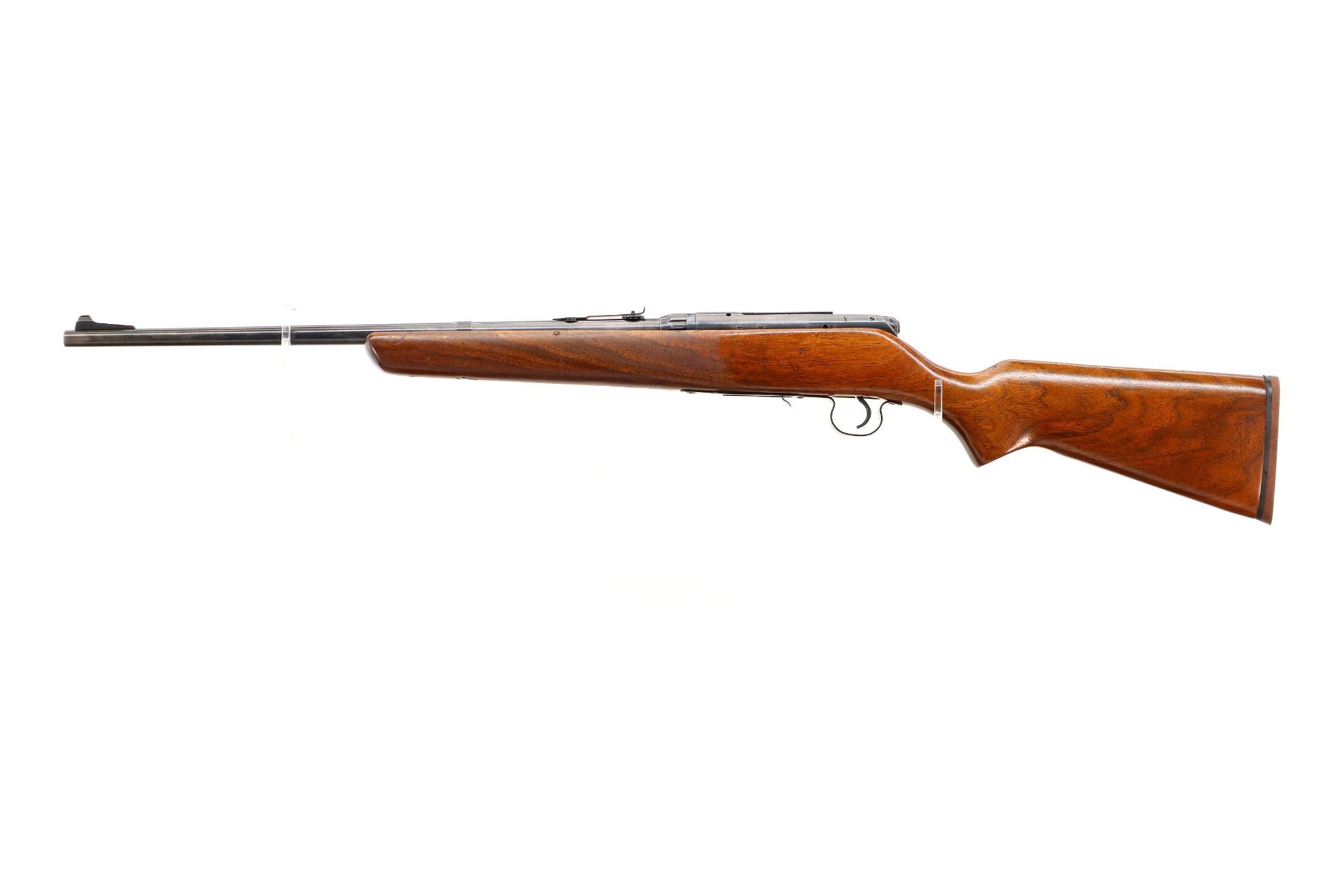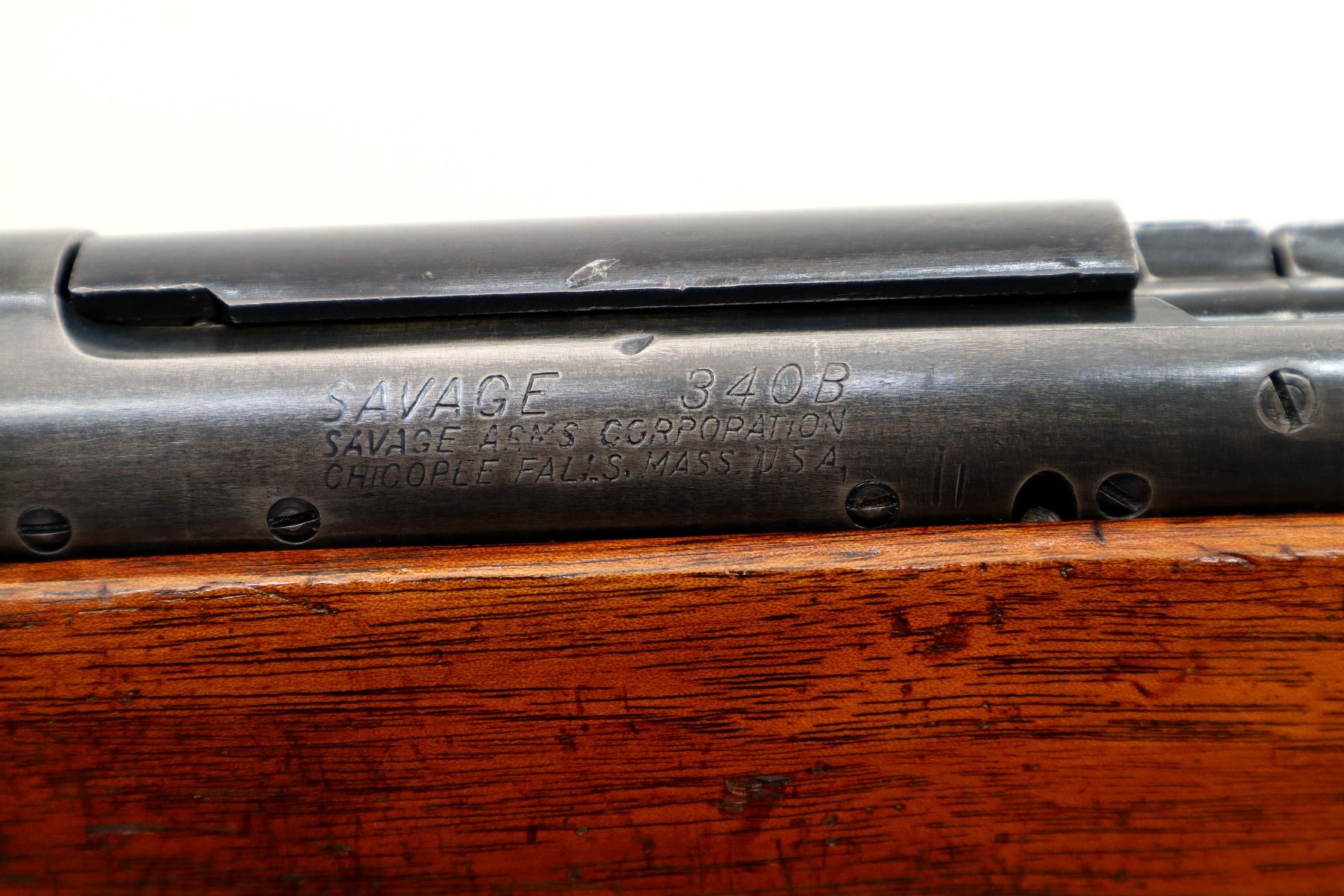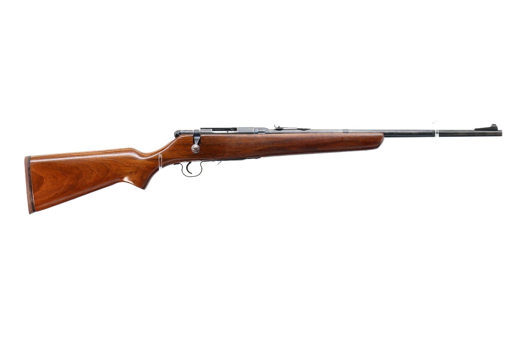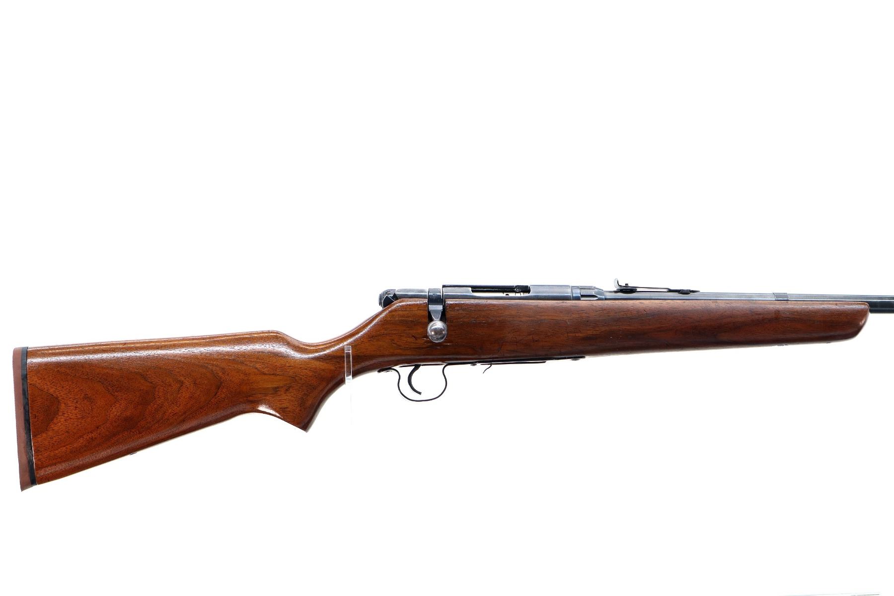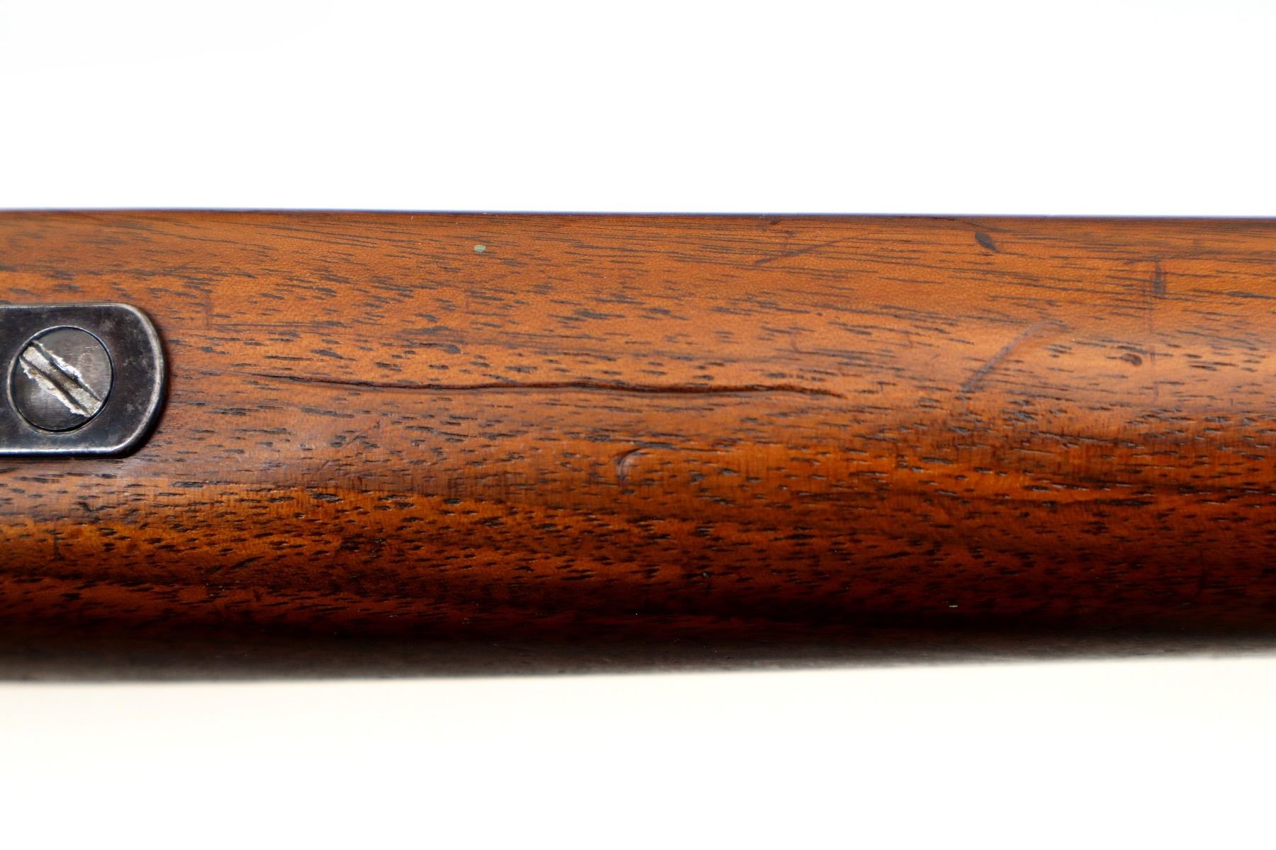 Main Description: Blade front sight with ramp, adjustable u notched rear sight, blued finish, receiver drilled and tapped with plug screws installed. One piece refinished wood stock, pistol grip, brown rubber recoil pad, missing swivels holes are present. Note: Chamber is chipped and damaged, possibly not functional requires repair.