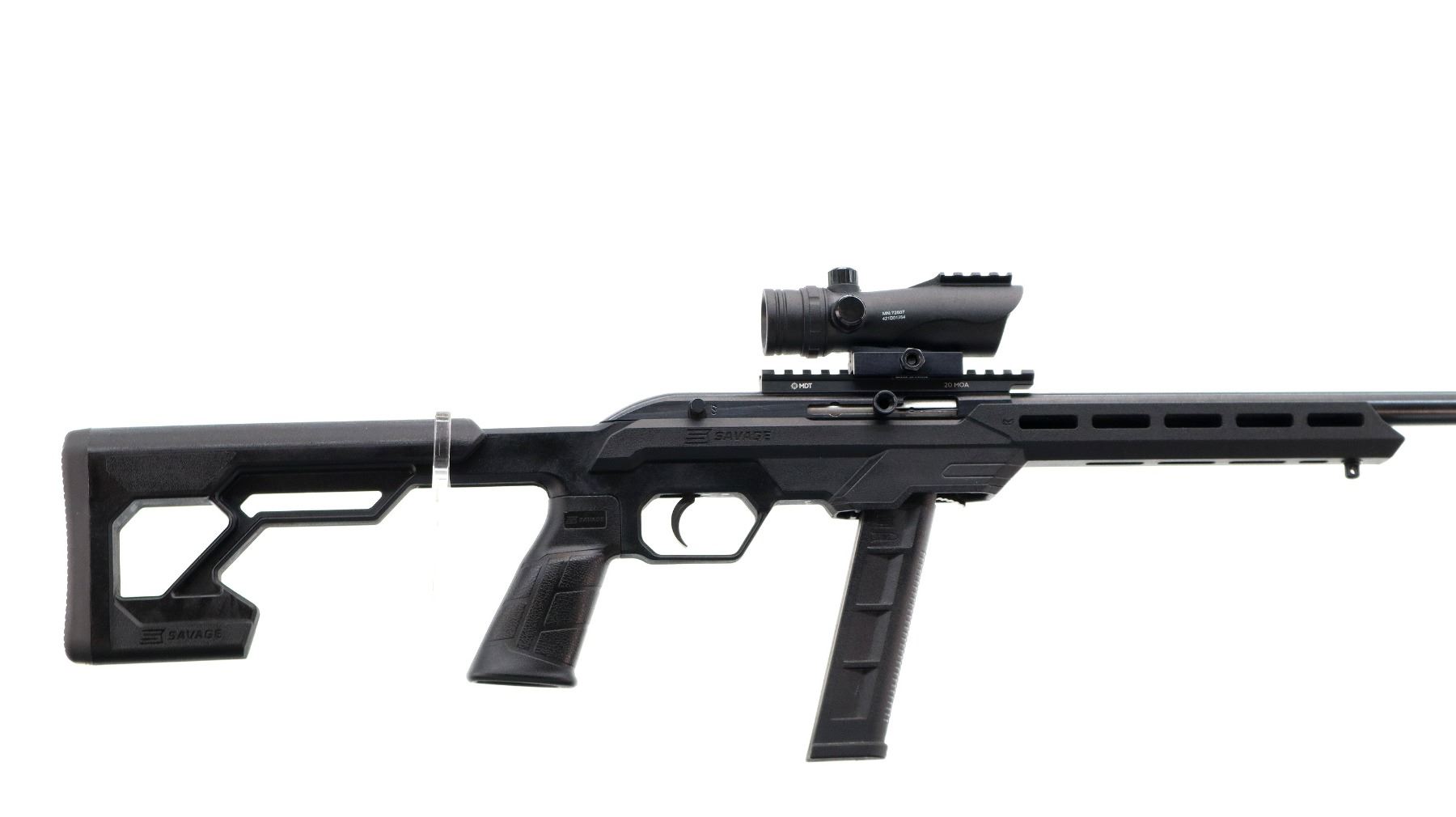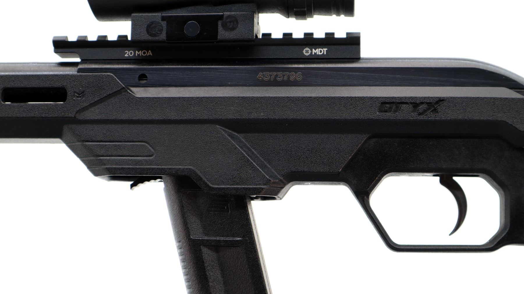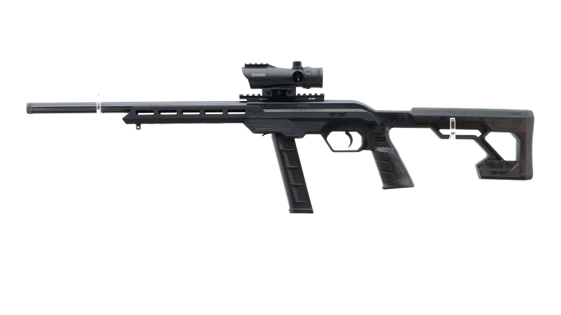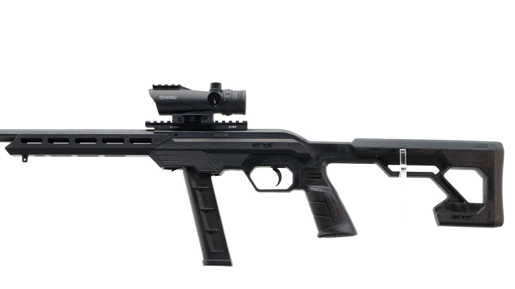 Main Description: No sights, blued finish, heavy barrel threaded at muzzle with cap. Receiver drilled and tapped with MDT 20 MOA rail, CP tactical Red dot installed, clear optics (not tested). One piece Oryx black synthetic tactical stock, ventilated free float forearm, textured pistol grip, black rubber recoil pad, extended mag and mag release, front swivel stud.