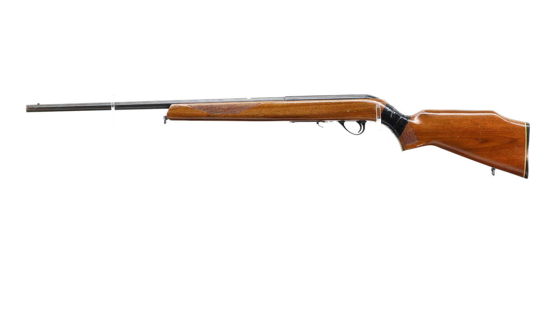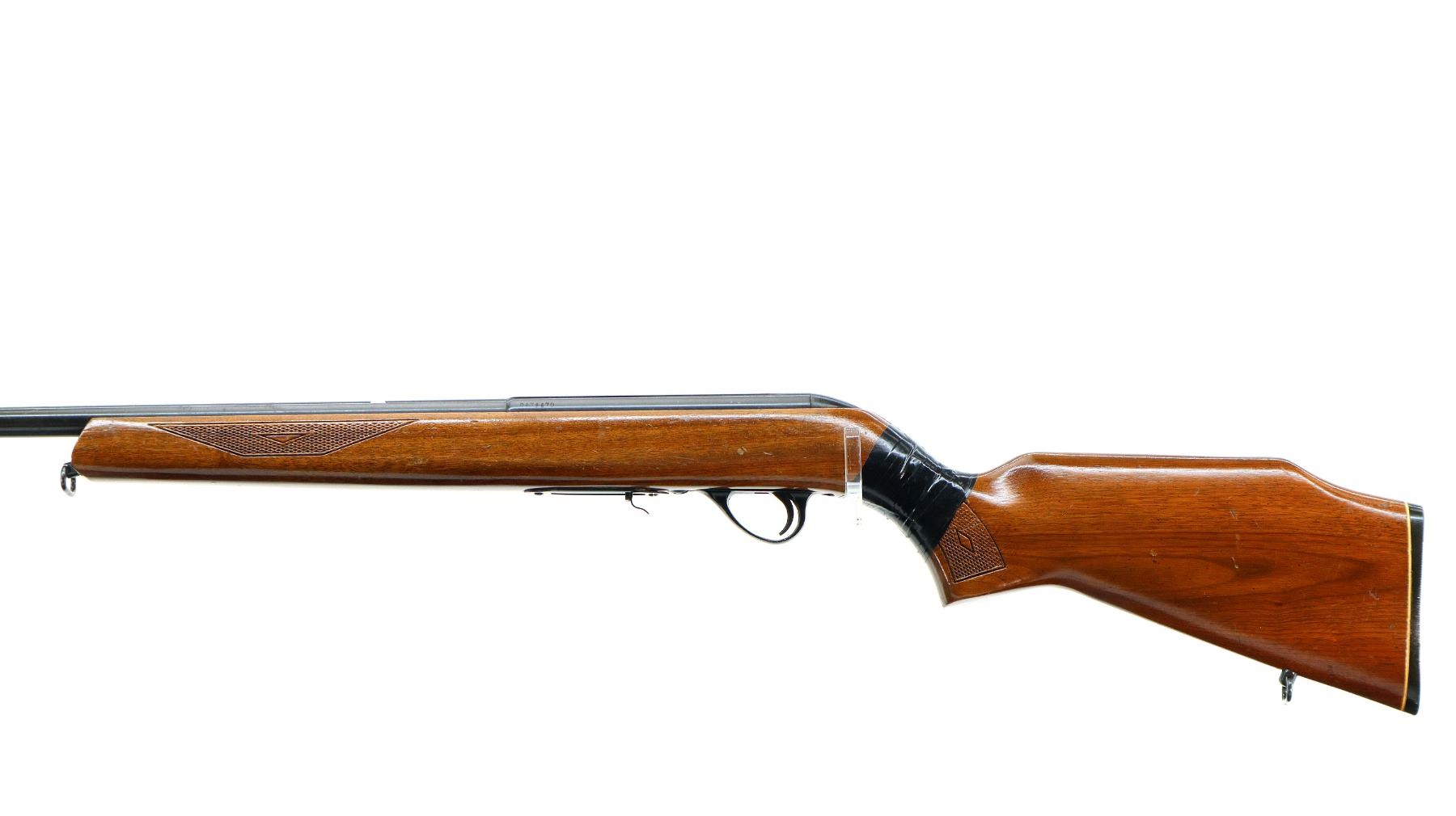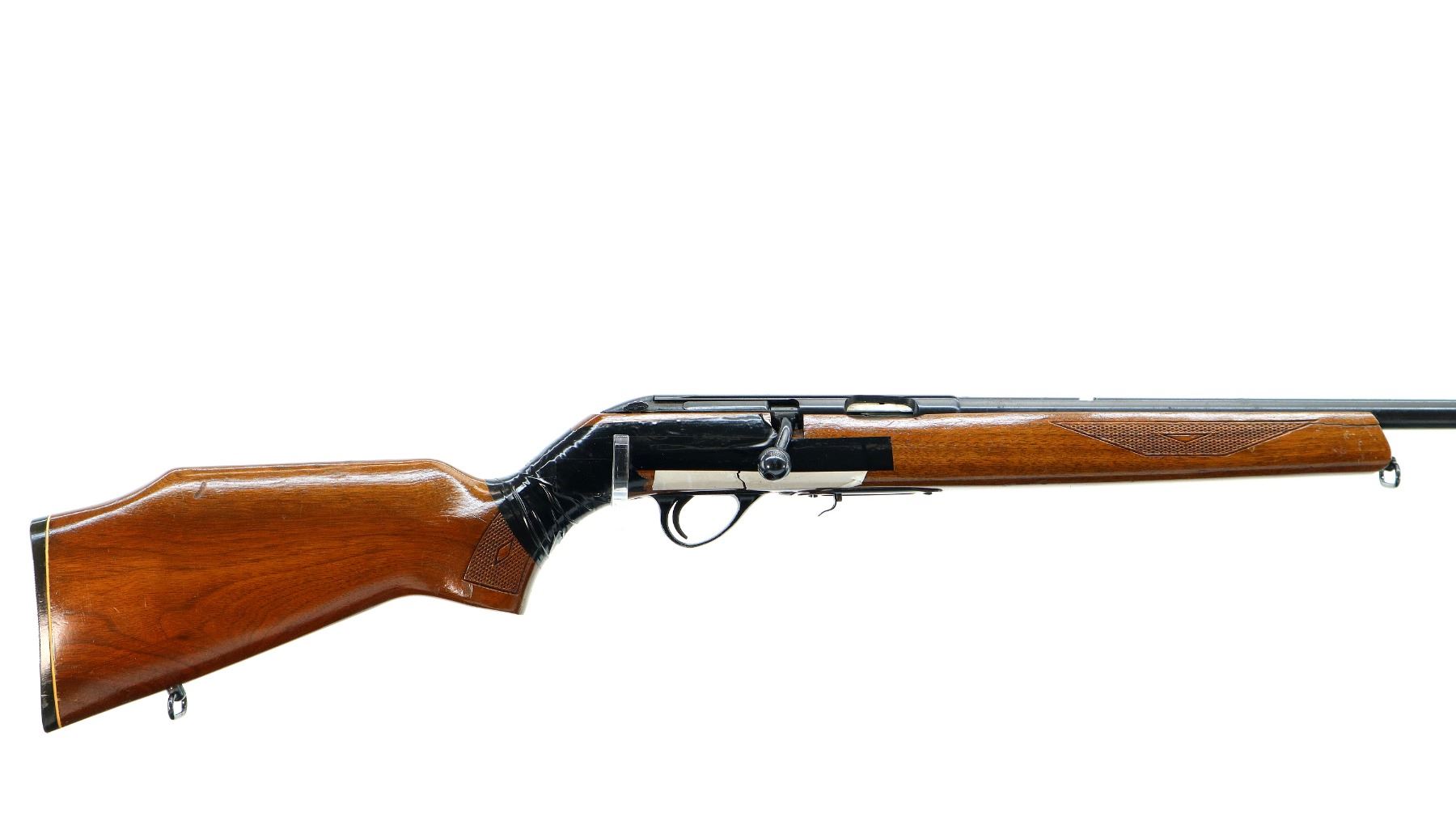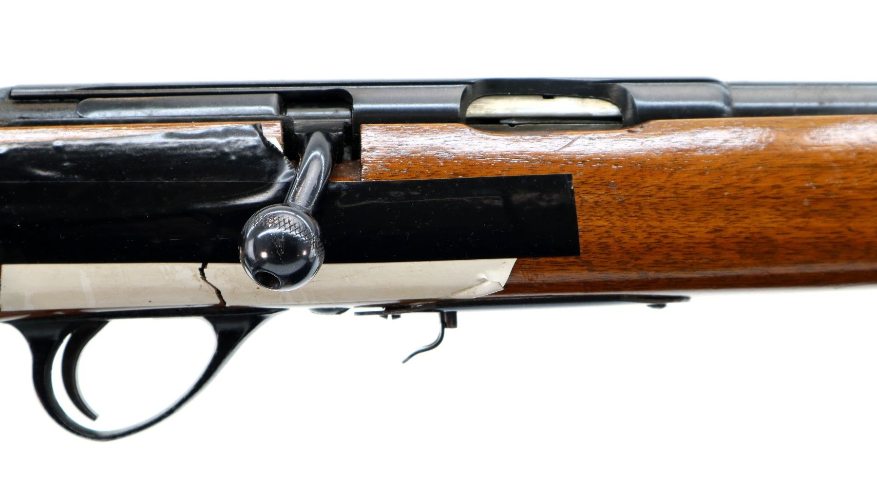 Main Description: Missing front and rear sights, threaded hole and dovetail present, blued finish, grooved receiver, checkered bolt knob. One piece wood stock, checkered forearm cracked on both sides at tip, checkered pistol grip chipped, cracked and broken wrapped with tape, raised comb, grooved black polymer butt plate, sling swivels.