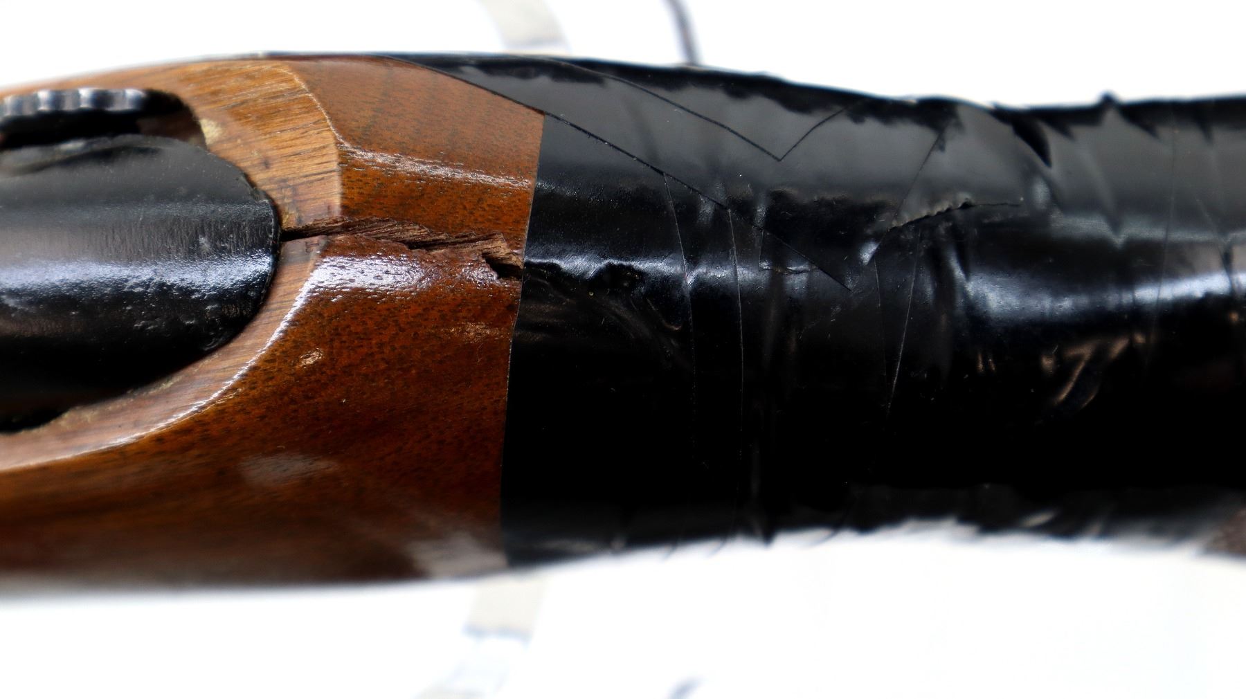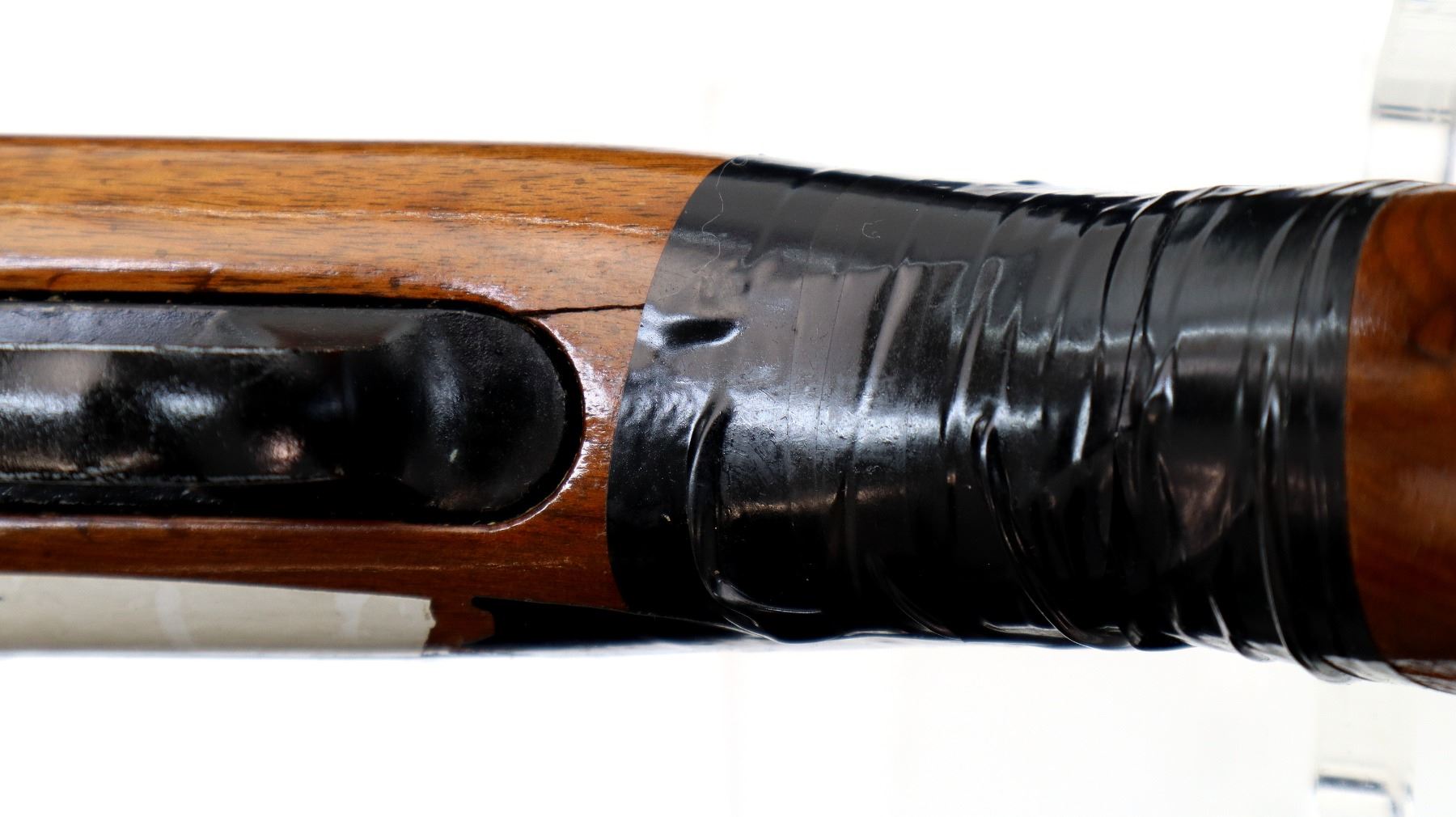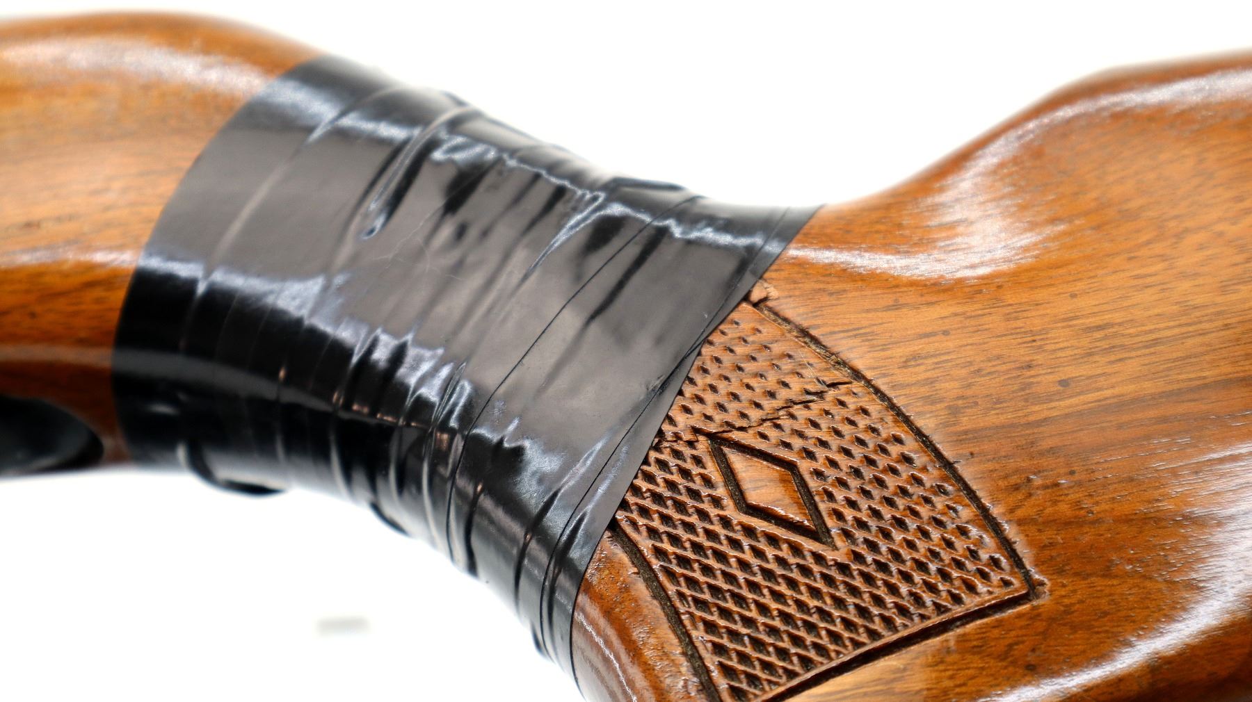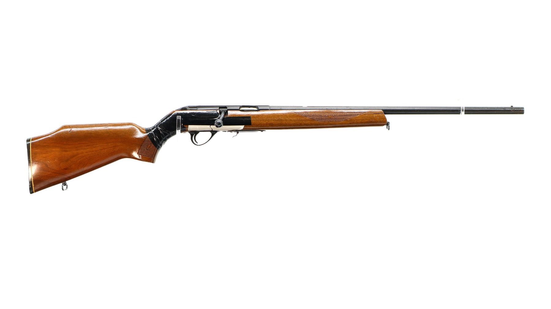 Main Description: Missing front and rear sights, threaded hole and dovetail present, blued finish, grooved receiver, checkered bolt knob. One piece wood stock, checkered forearm cracked on both sides at tip, checkered pistol grip chipped, cracked and broken wrapped with tape, raised comb, grooved black polymer butt plate, sling swivels.