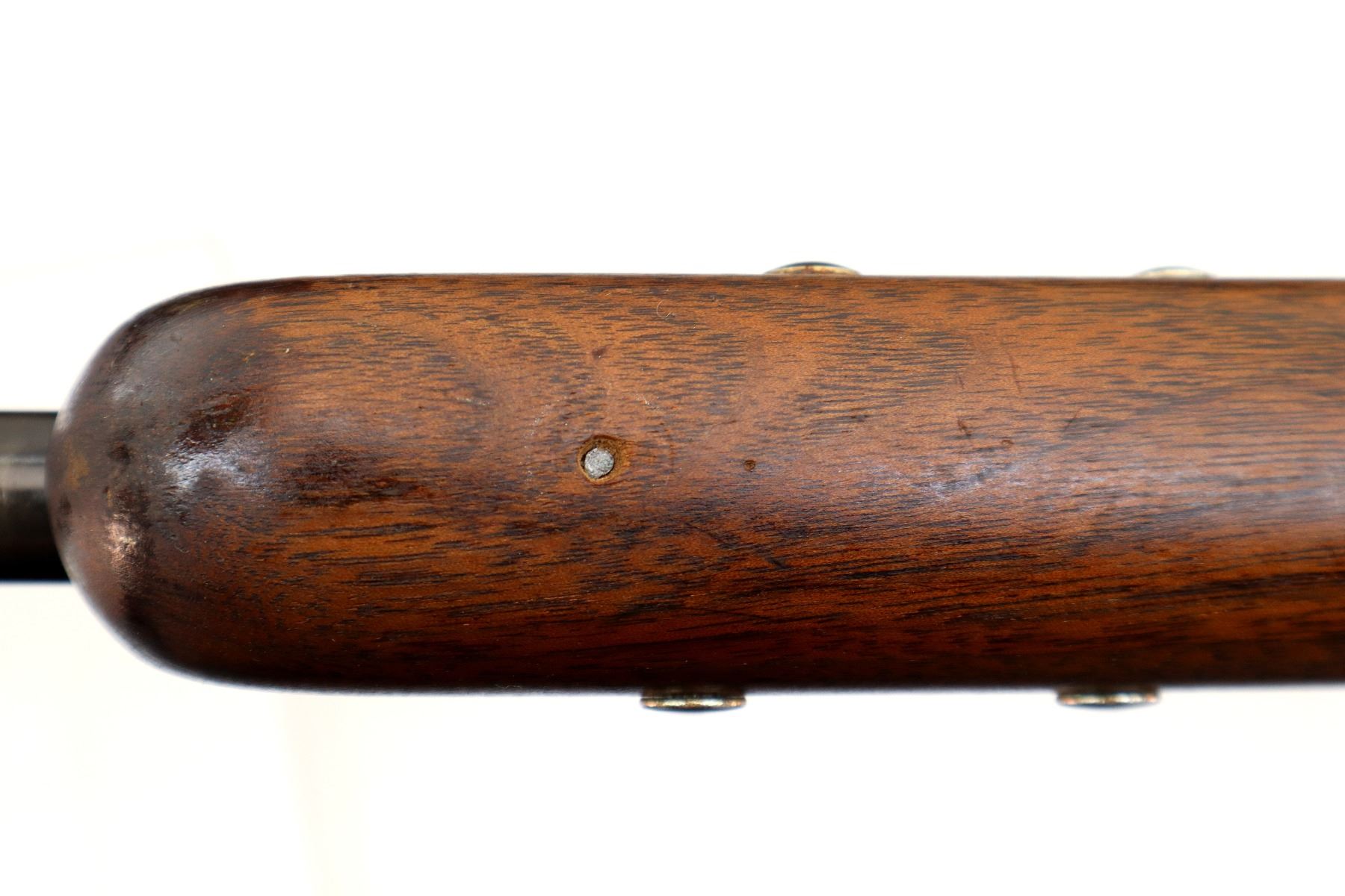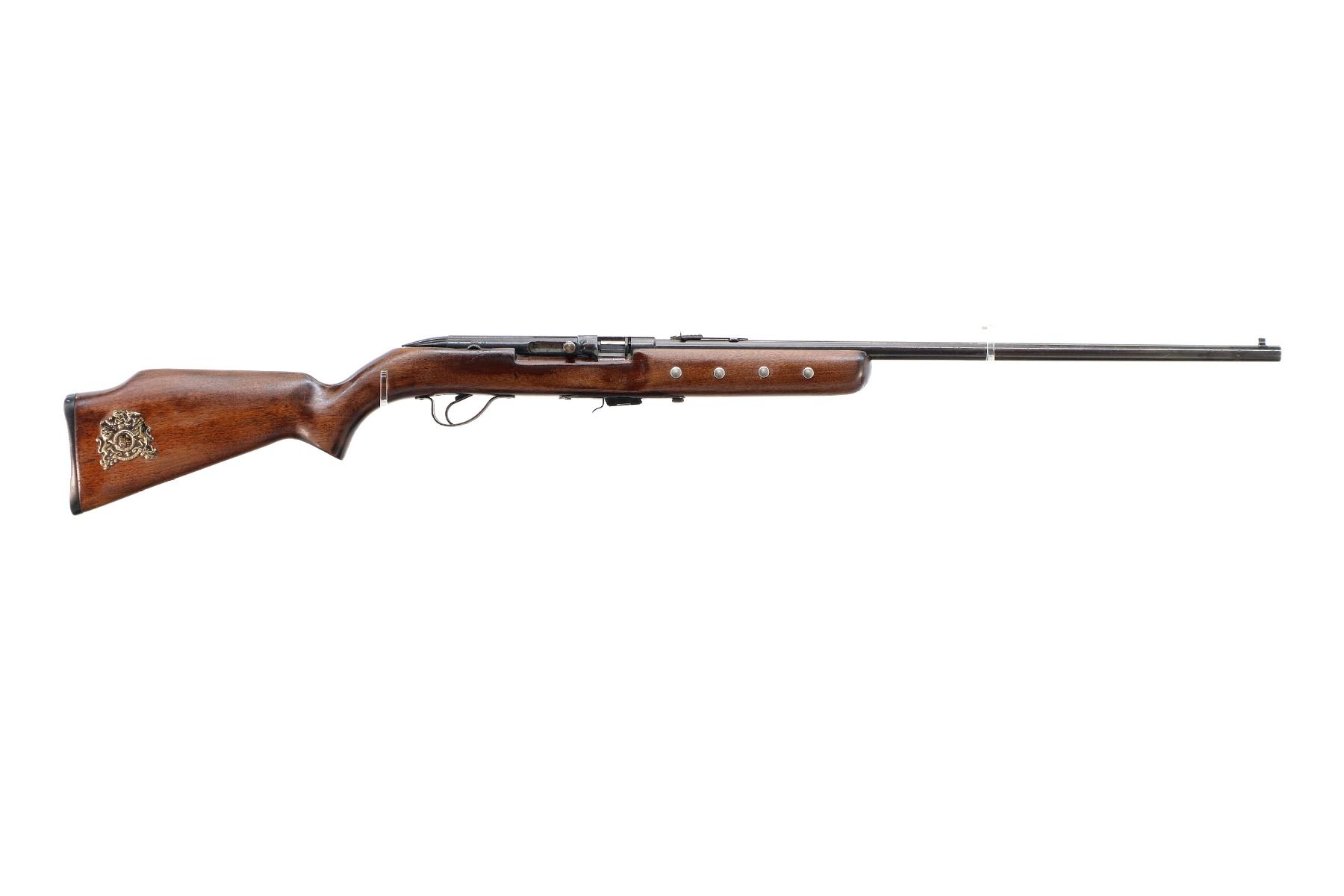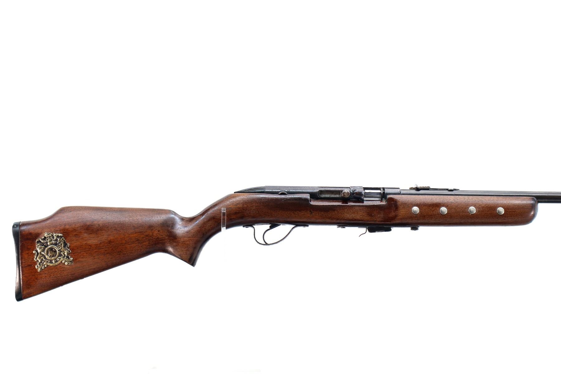 Main Description: Blade front sight, adjustable u notched rear sight, grooved receiver and bolt knob, case deflector. One piece wood stock, forearm has 8 silver tacks, pistol grip, raised comb, grooved black polymer butt plate, unknown coat of arms on right side of stock. Missing swivels, holes are present.