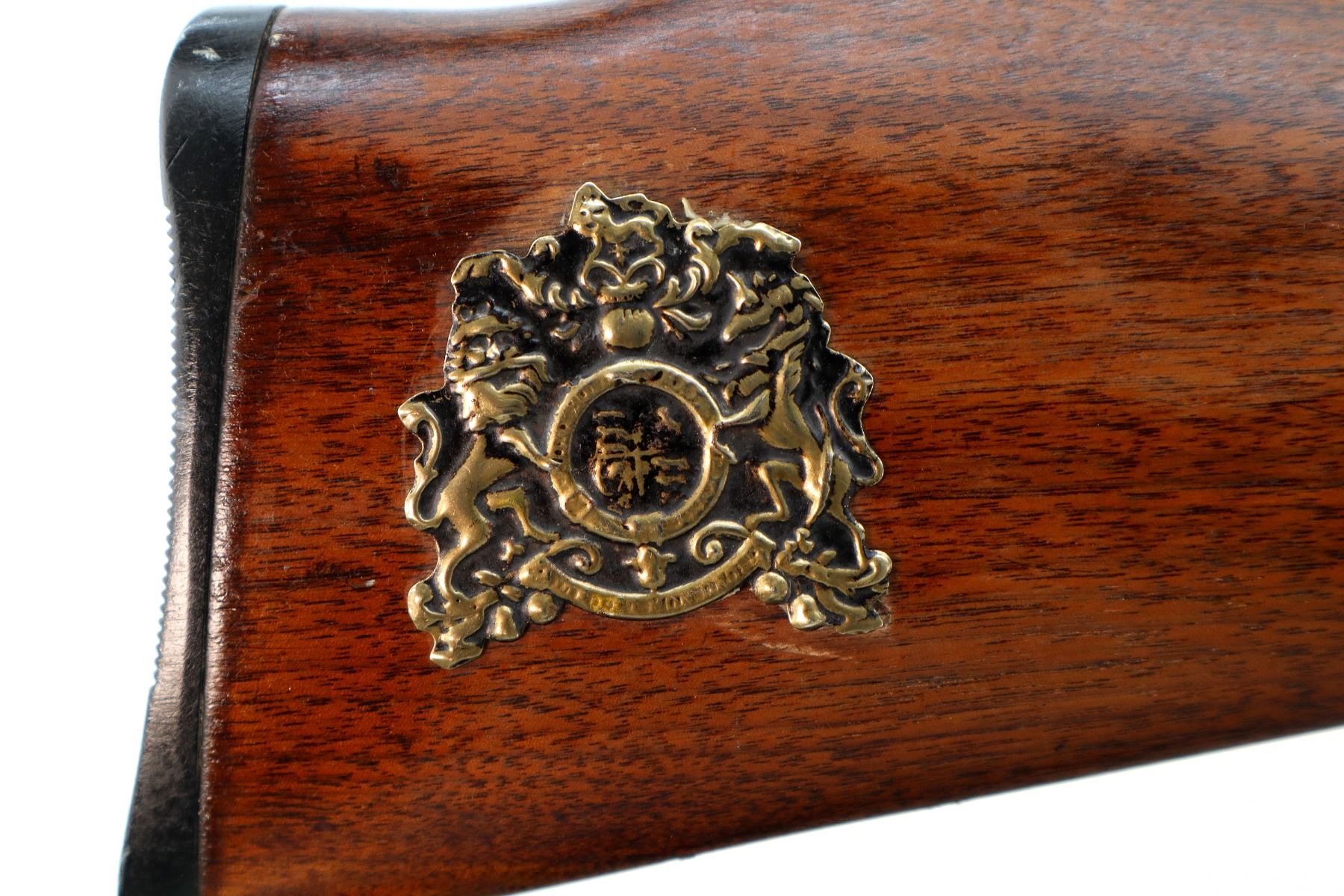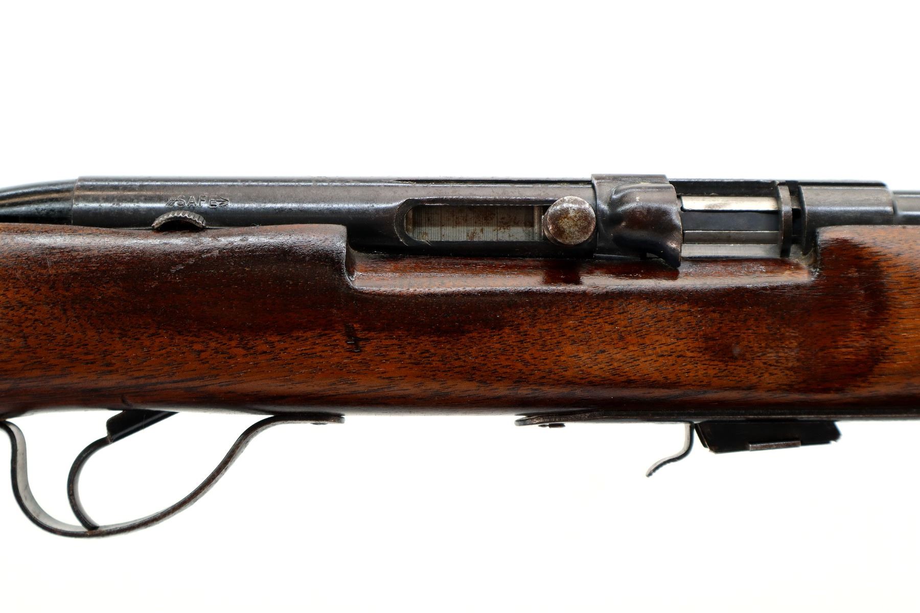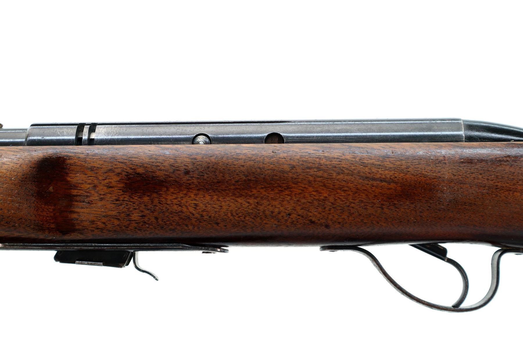 Main Description: Blade front sight, adjustable u notched rear sight, grooved receiver and bolt knob, case deflector. One piece wood stock, forearm has 8 silver tacks, pistol grip, raised comb, grooved black polymer butt plate, unknown coat of arms on right side of stock. Missing swivels, holes are present.