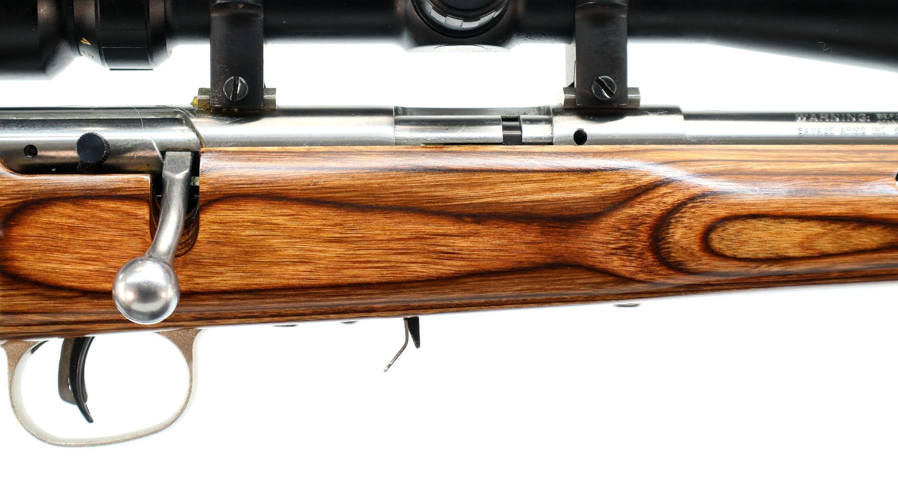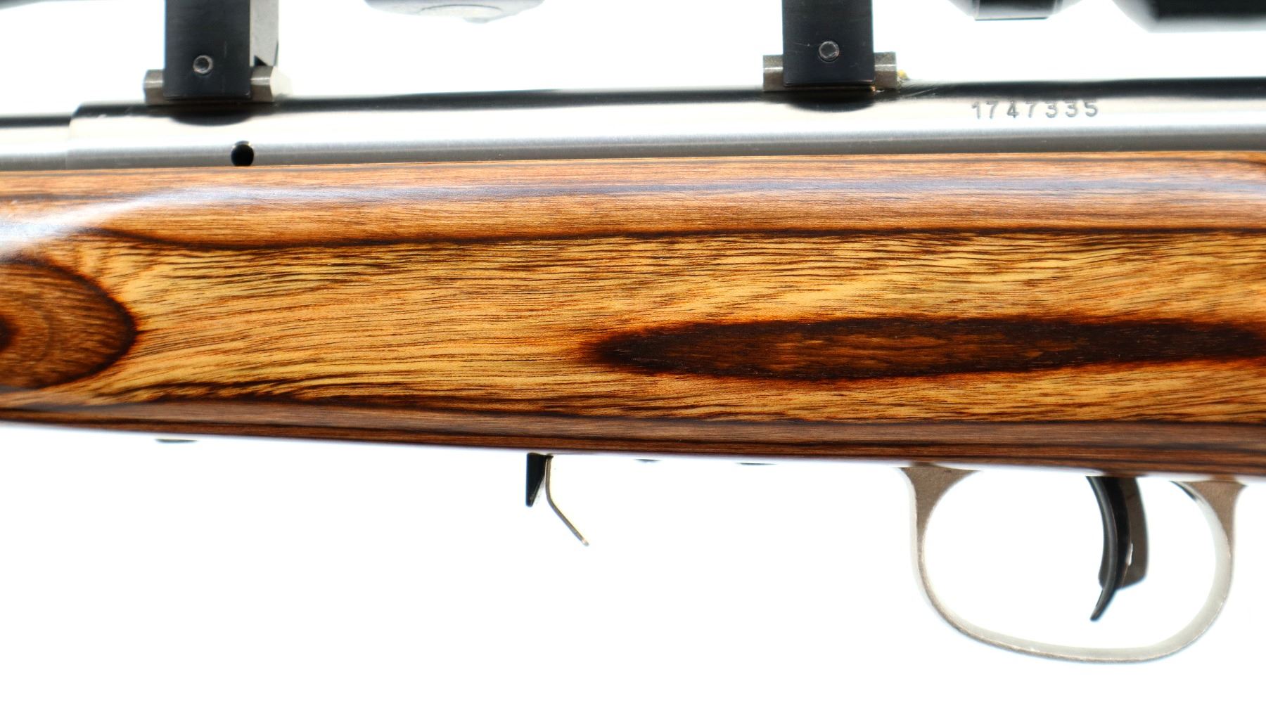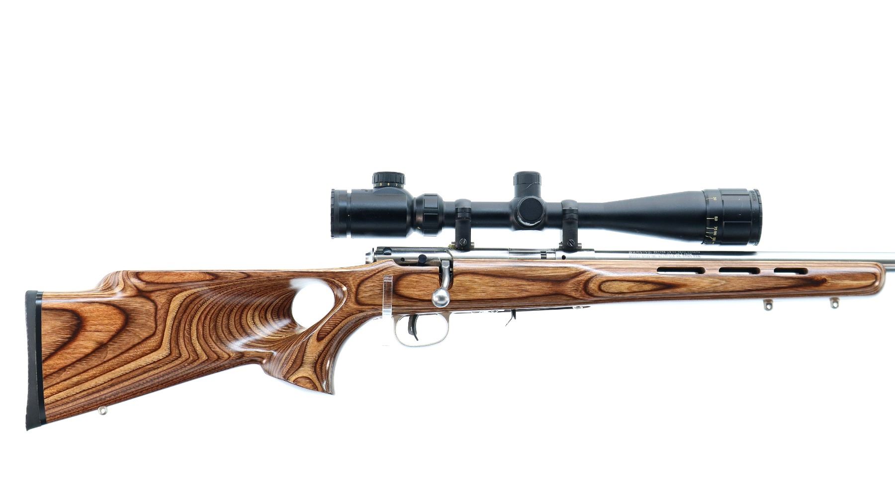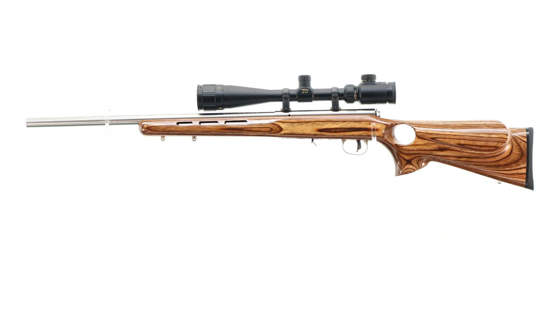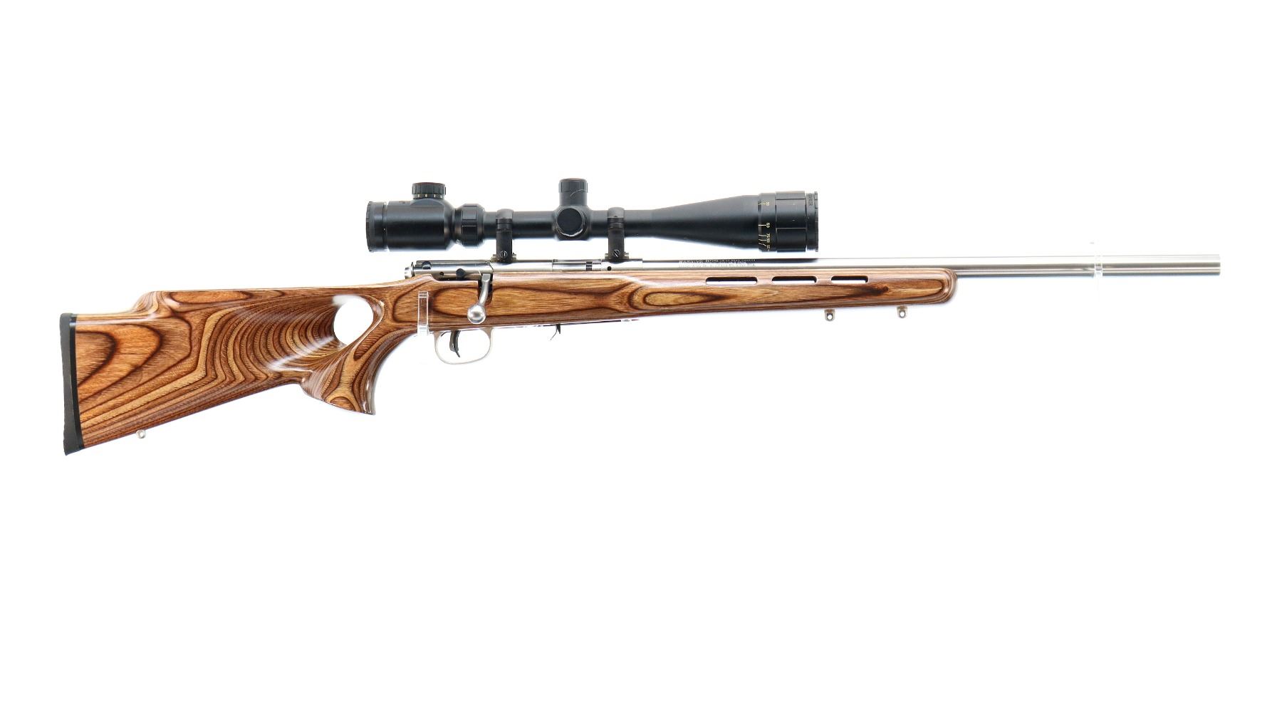 Main Description: No sights, stainless finish, heavy barrel, receiver drilled and tapped with BSA Mil Dot 4-16x40 IR scope installed, clear optics, Mil Dot reticle, illumination functions. One piece brown laminate wood stock, ventilated forearm, thumb hole pistol grip, cheek rest, black rubber recoil pad, accu trigger, 3 swivel studs.