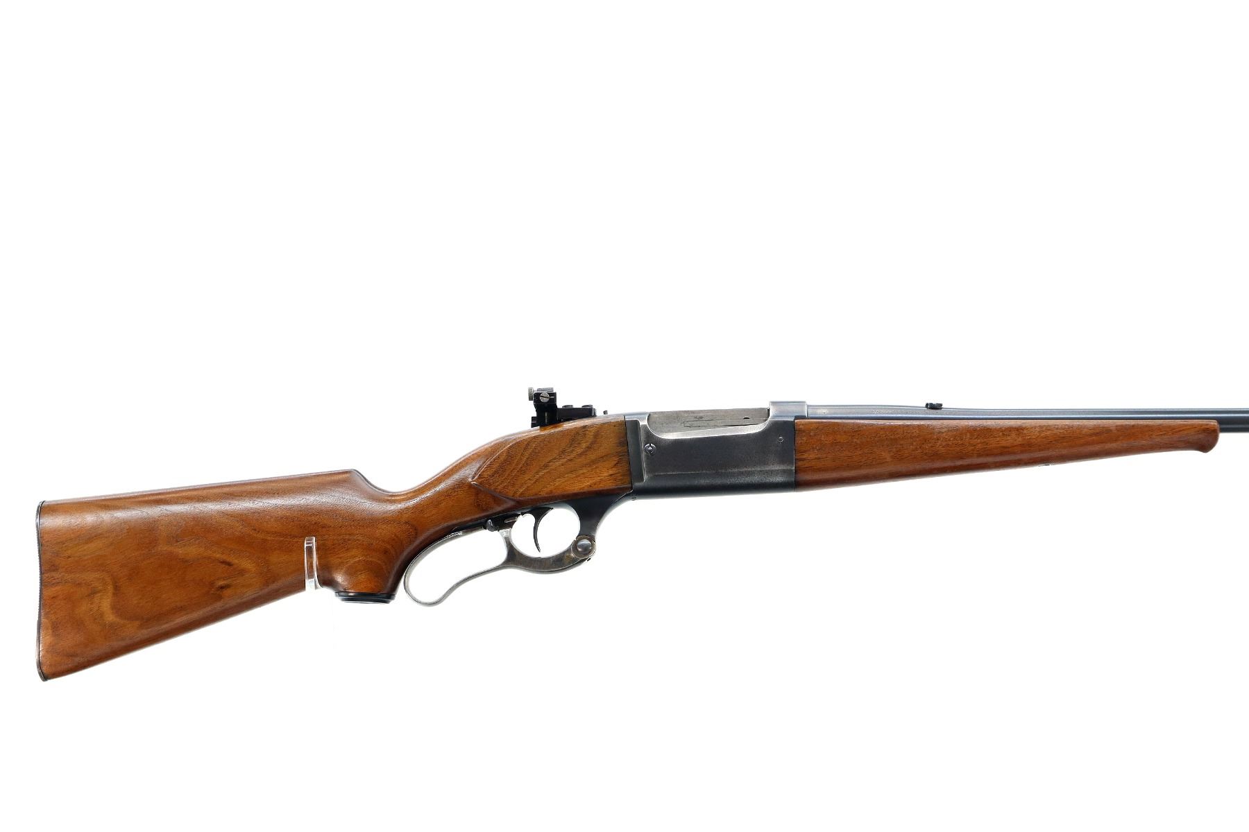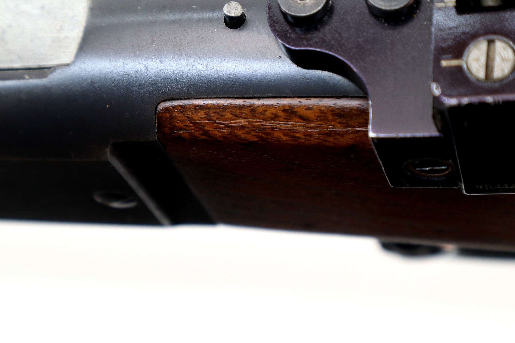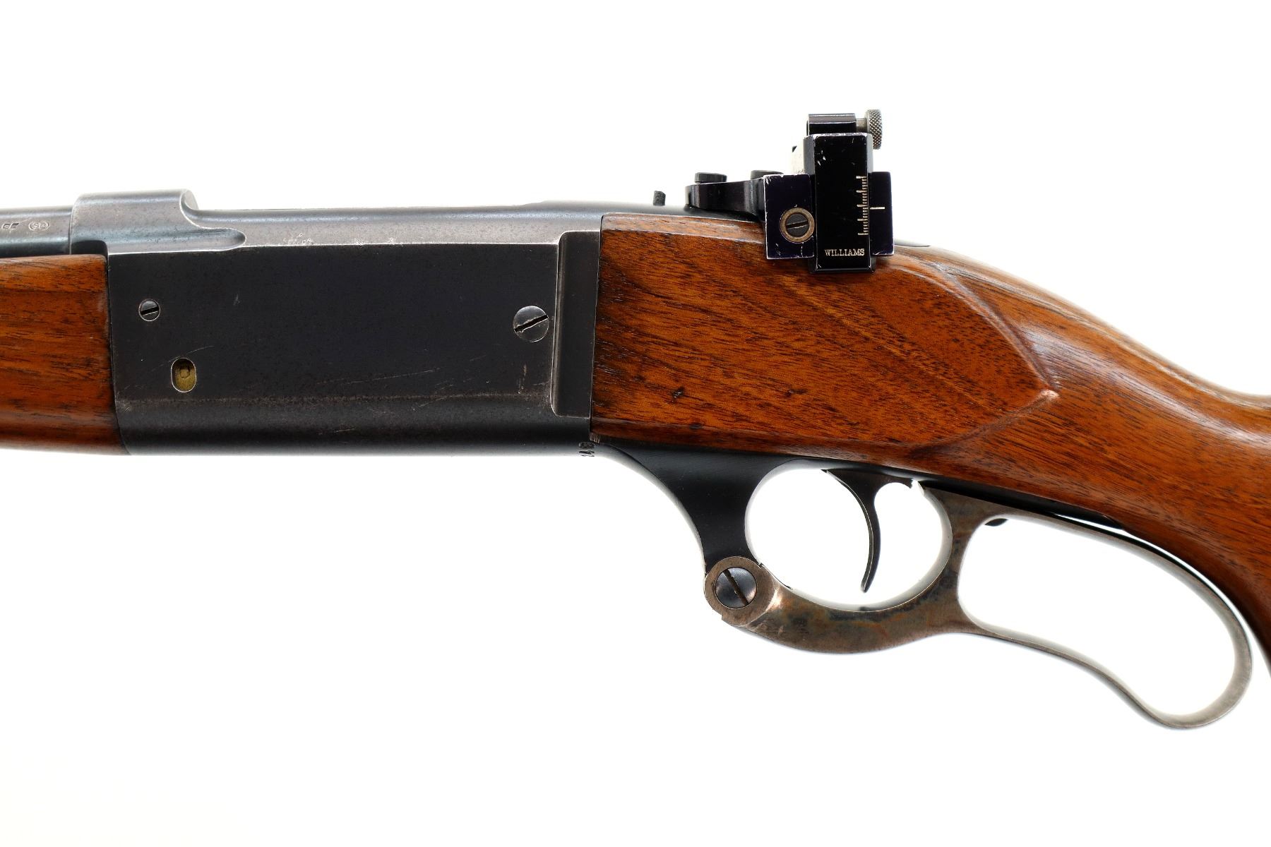 Main Description: Blade front sight with ramp, missing rear sight dovetail blank installed, receiver drilled and tapped with adjustable Williams peep sight on upper tang, blued finish, cocking indicator. Two piece wood stocks, Schnabel forend tip, pistol grip, grooved steel butt plate, grip cap, colour case hardened lever.