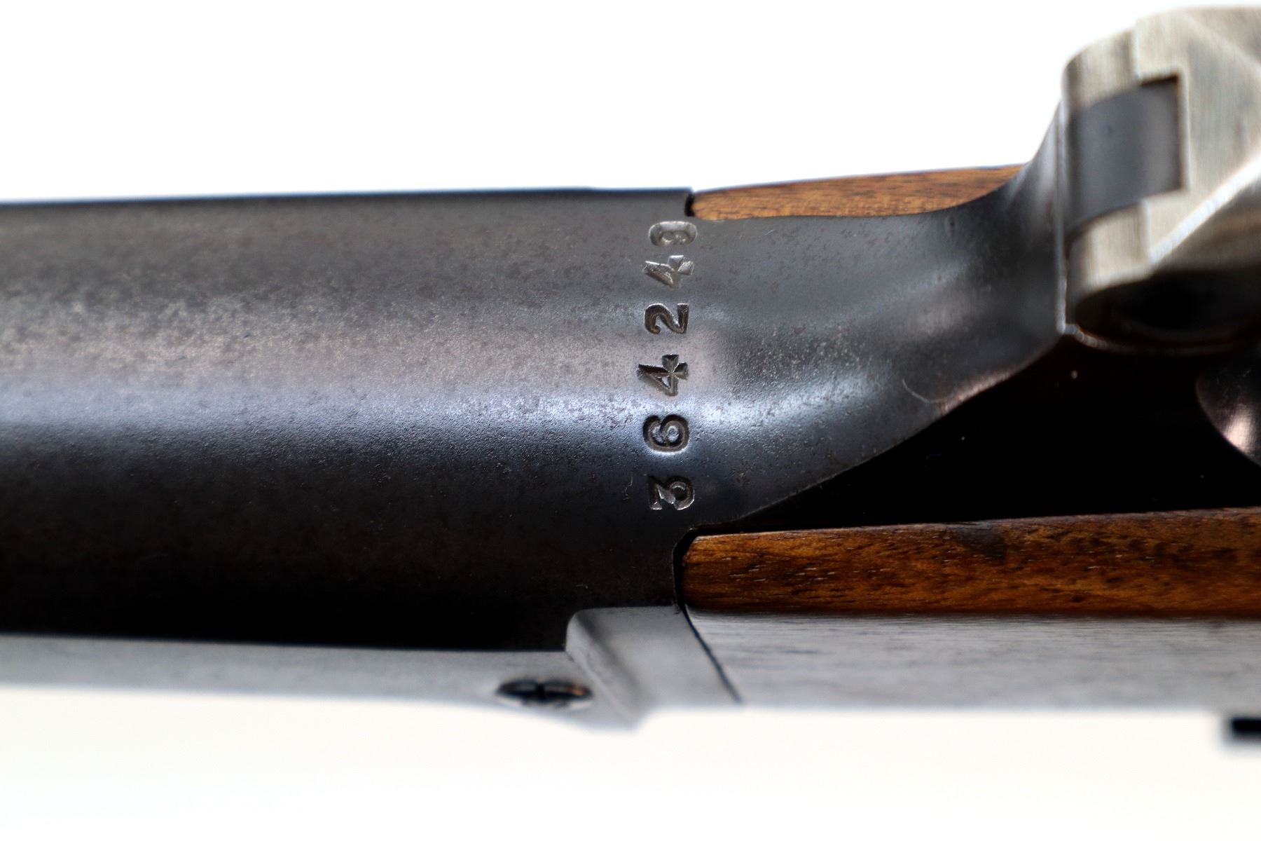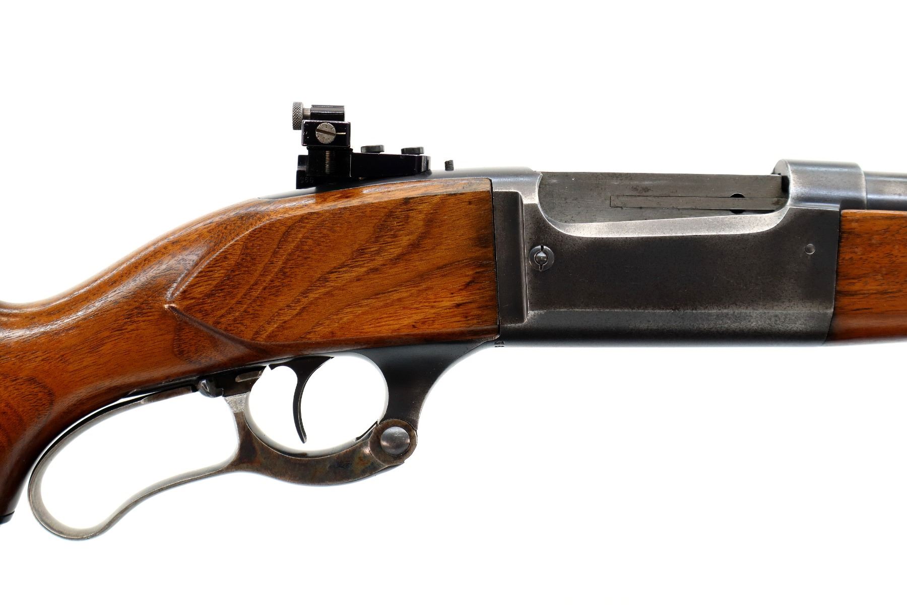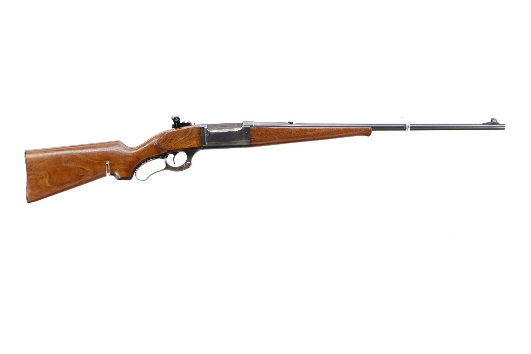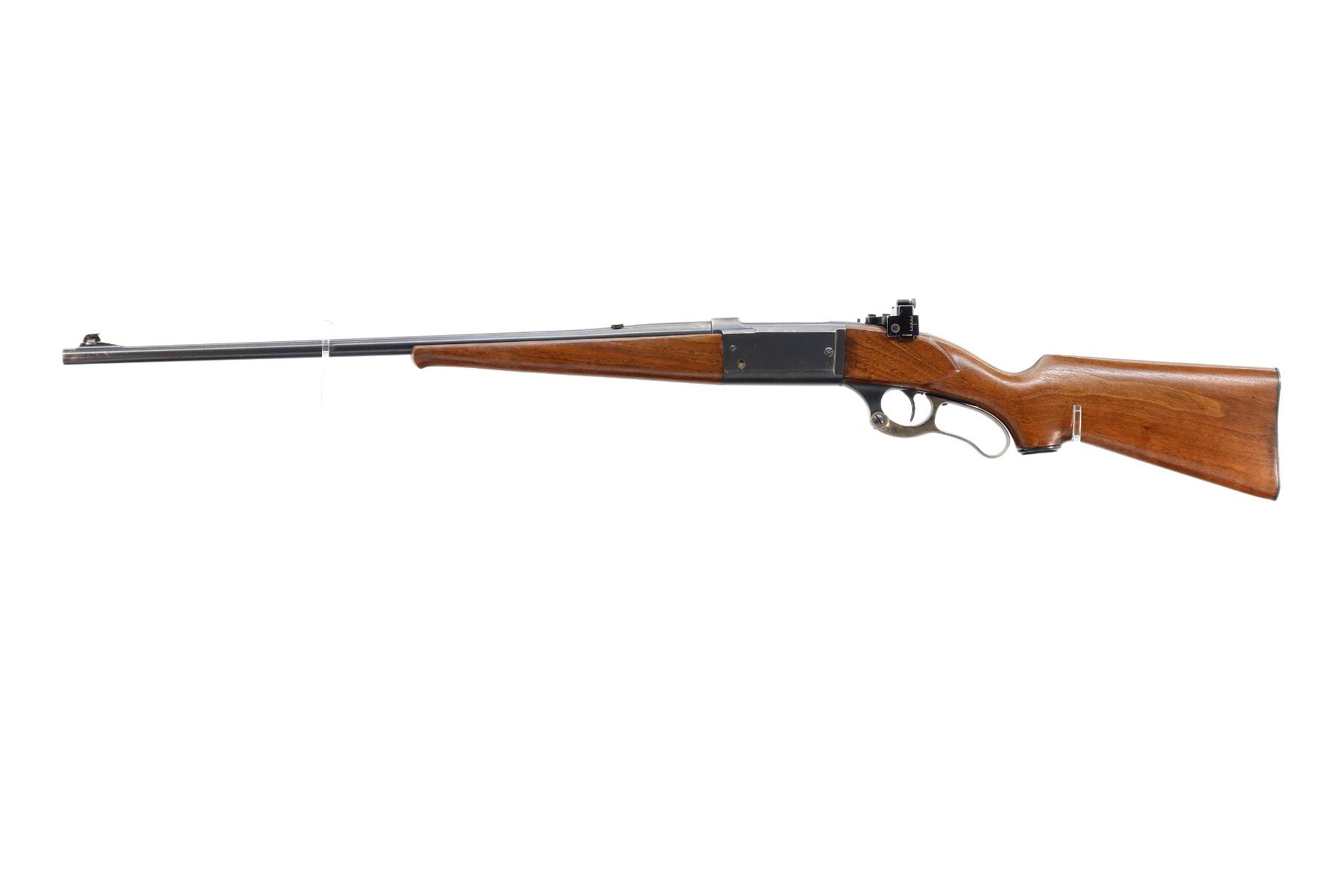Main Description: Blade front sight with ramp, missing rear sight dovetail blank installed, receiver drilled and tapped with adjustable Williams peep sight on upper tang, blued finish, cocking indicator. Two piece wood stocks, Schnabel forend tip, pistol grip, grooved steel butt plate, grip cap, colour case hardened lever.