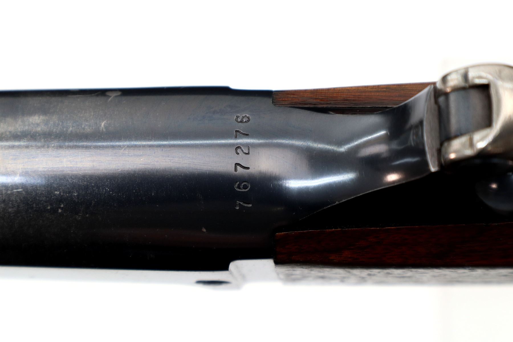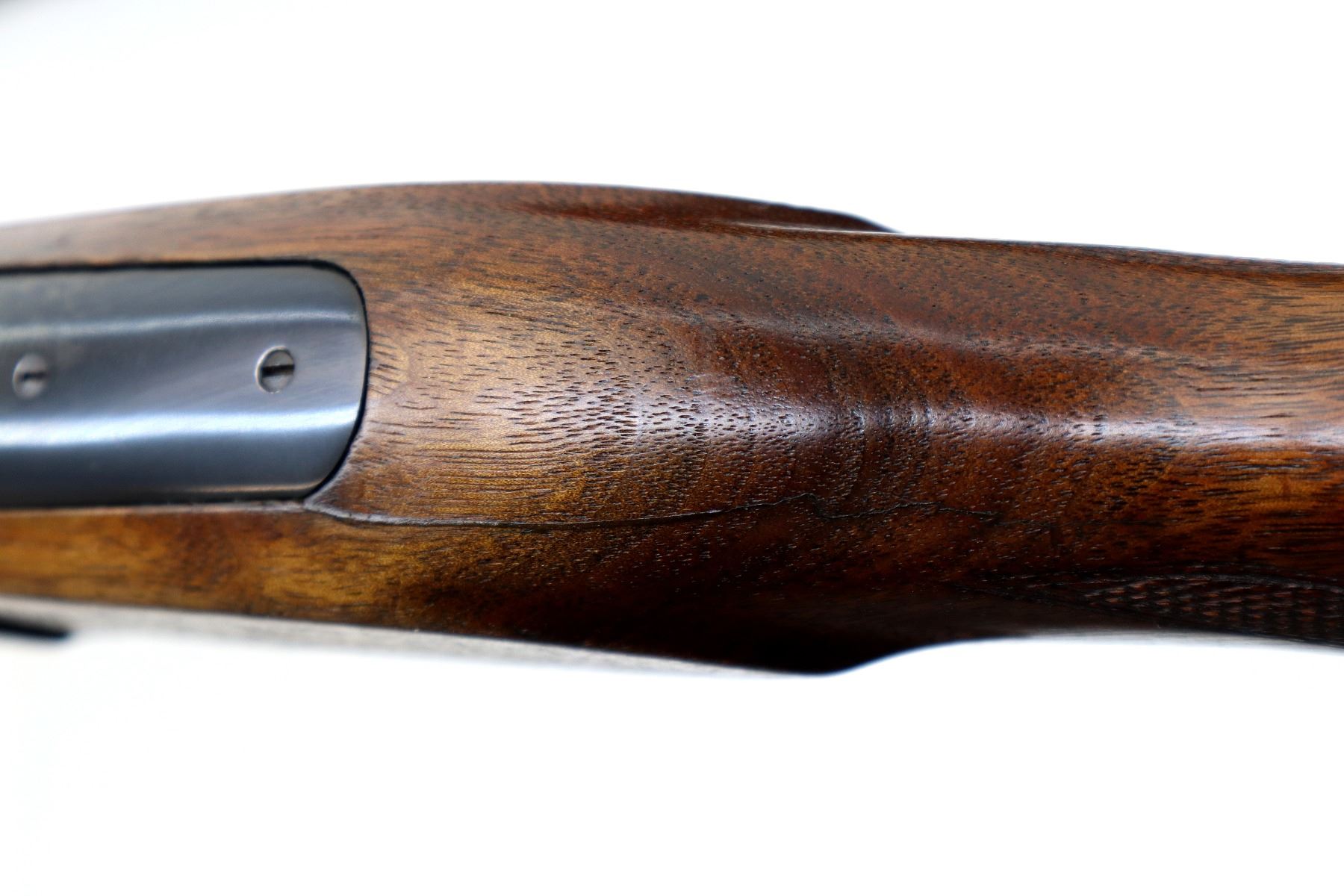 Main Description: Blade front sight with ramp, adjustable u notched rear sight, blued finish, receiver drilled and tapped with two piece scope bases installed, cocking indicator, jewelled bolt. Two piece wood stocks, checkered forearm and pistol grip, cracked and repaired behind upper tang, black rubber recoil pad, 13" LOP, grip cap, colour case hardened lever, swivel studs.