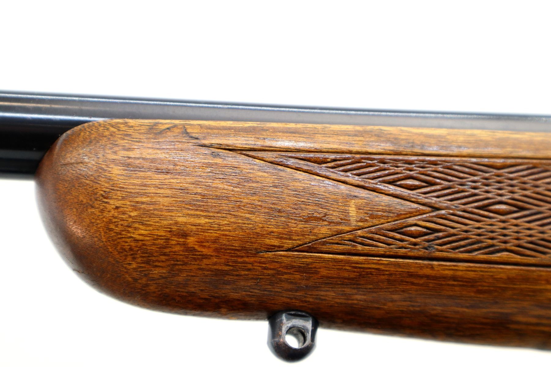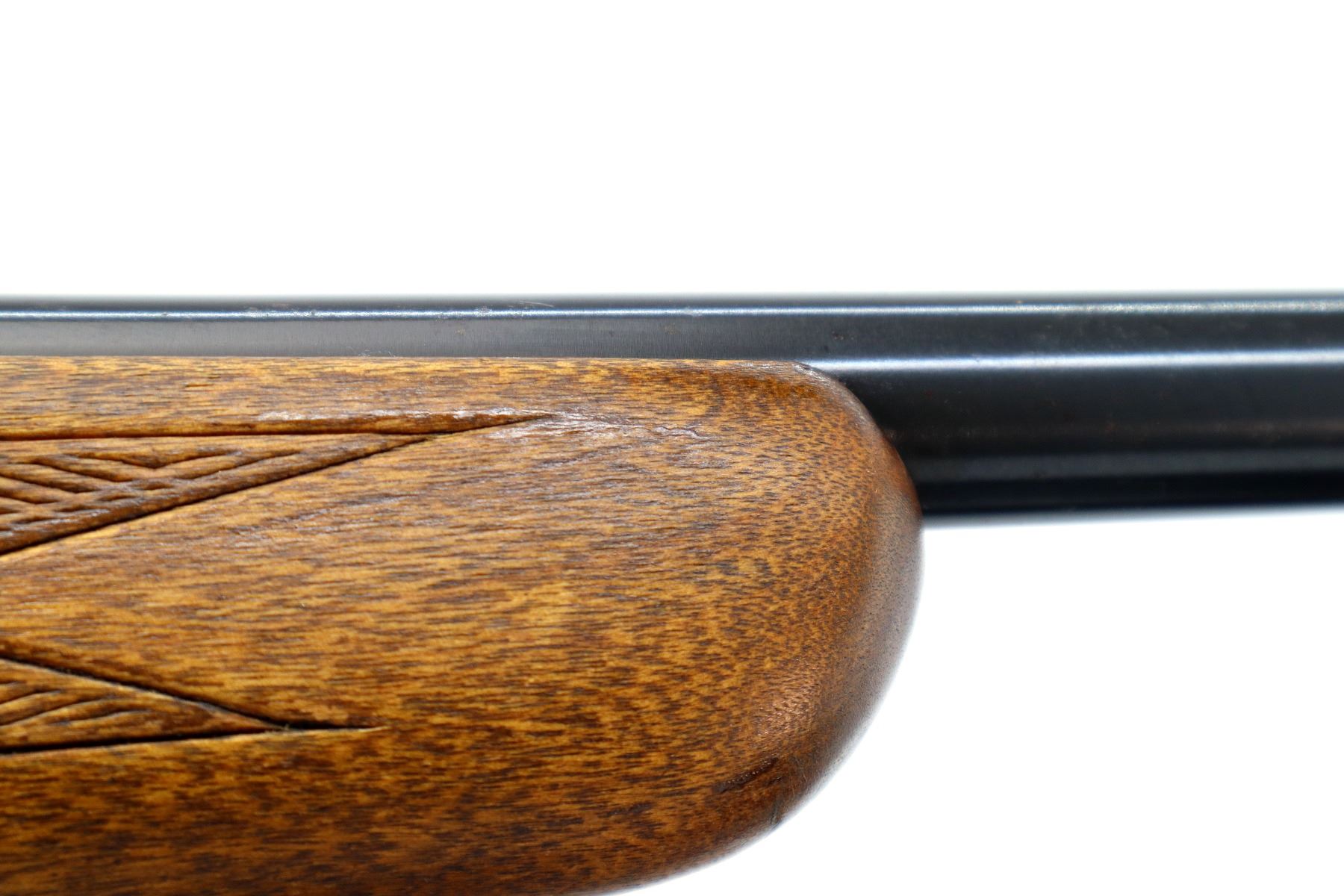 Main Description: Green fiber optic blade front sight with ramp, adjustable folding u notched rear sight, blued barrel, silver grey receiver with pitting drilled and tapped with two piece scope bases installed, cocking indicator. Two piece wood stocks, checkered forearm and pistol grip, grooved black polymer butt plate, 13.75" LOP, stock has an attached black and green nylon pouch with 5 round shell holder, swivel studs.