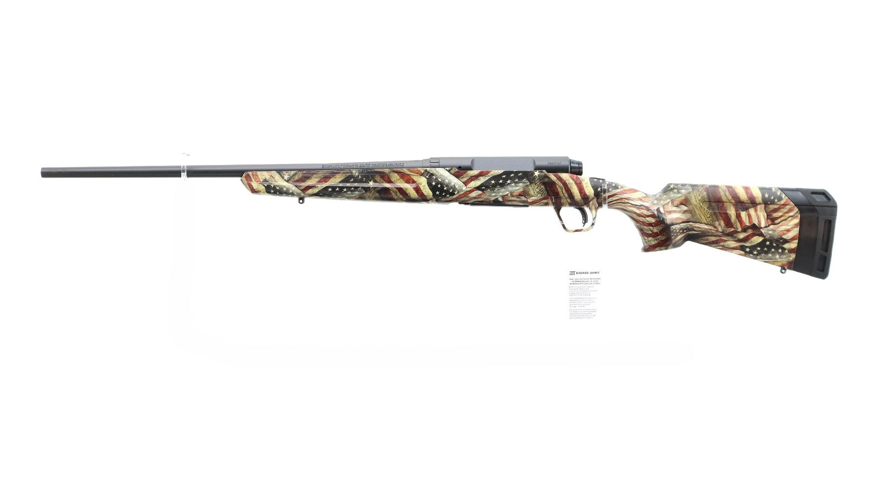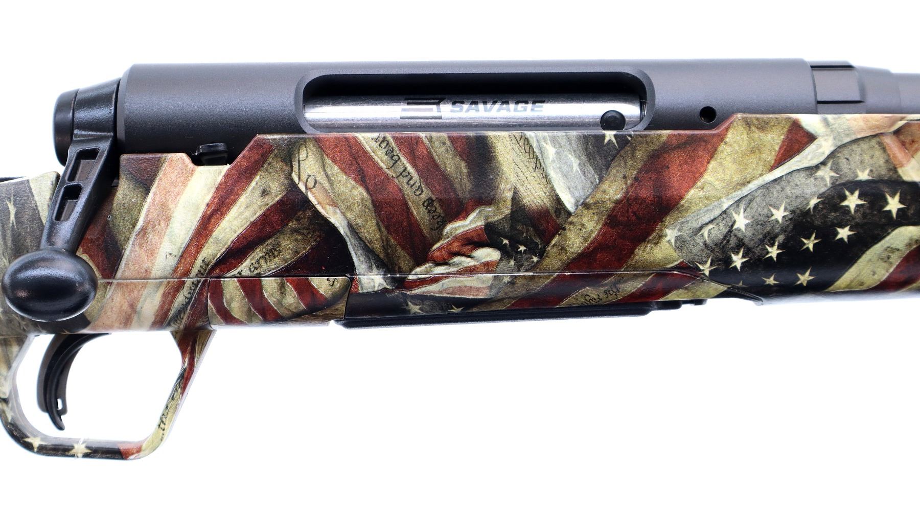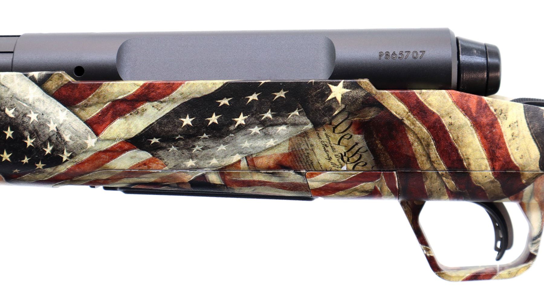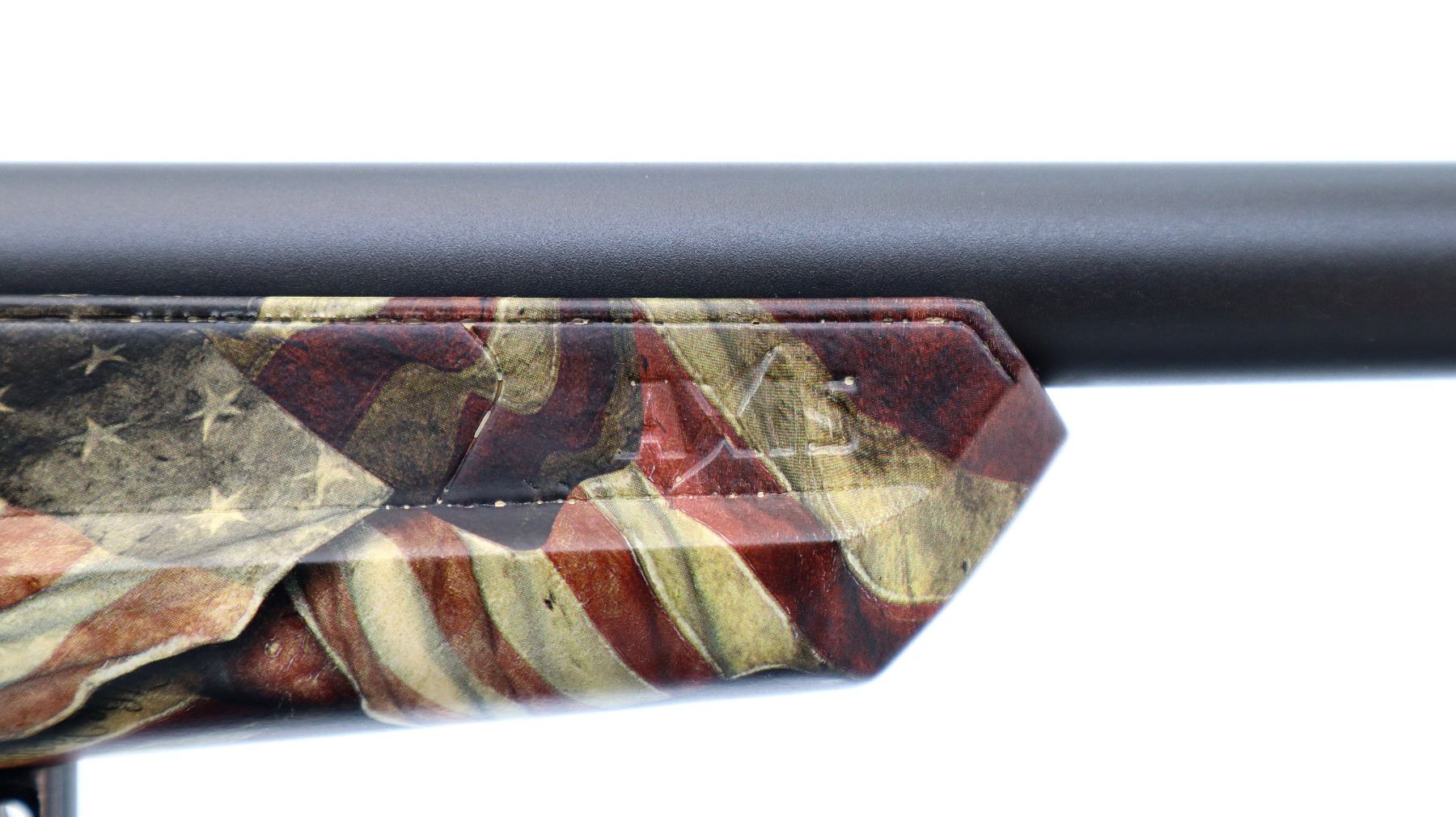 Main Description: No sights, Parkerized metal finish, receiver drilled and tapped with no plug screws installed, smooth bolt knob, tang safety. One piece US flag/Constitution camo stock, grooved forearm and pistol grip panels, black rubber recoil pad with spacer, grip cap, accu trigger, swivel studs.