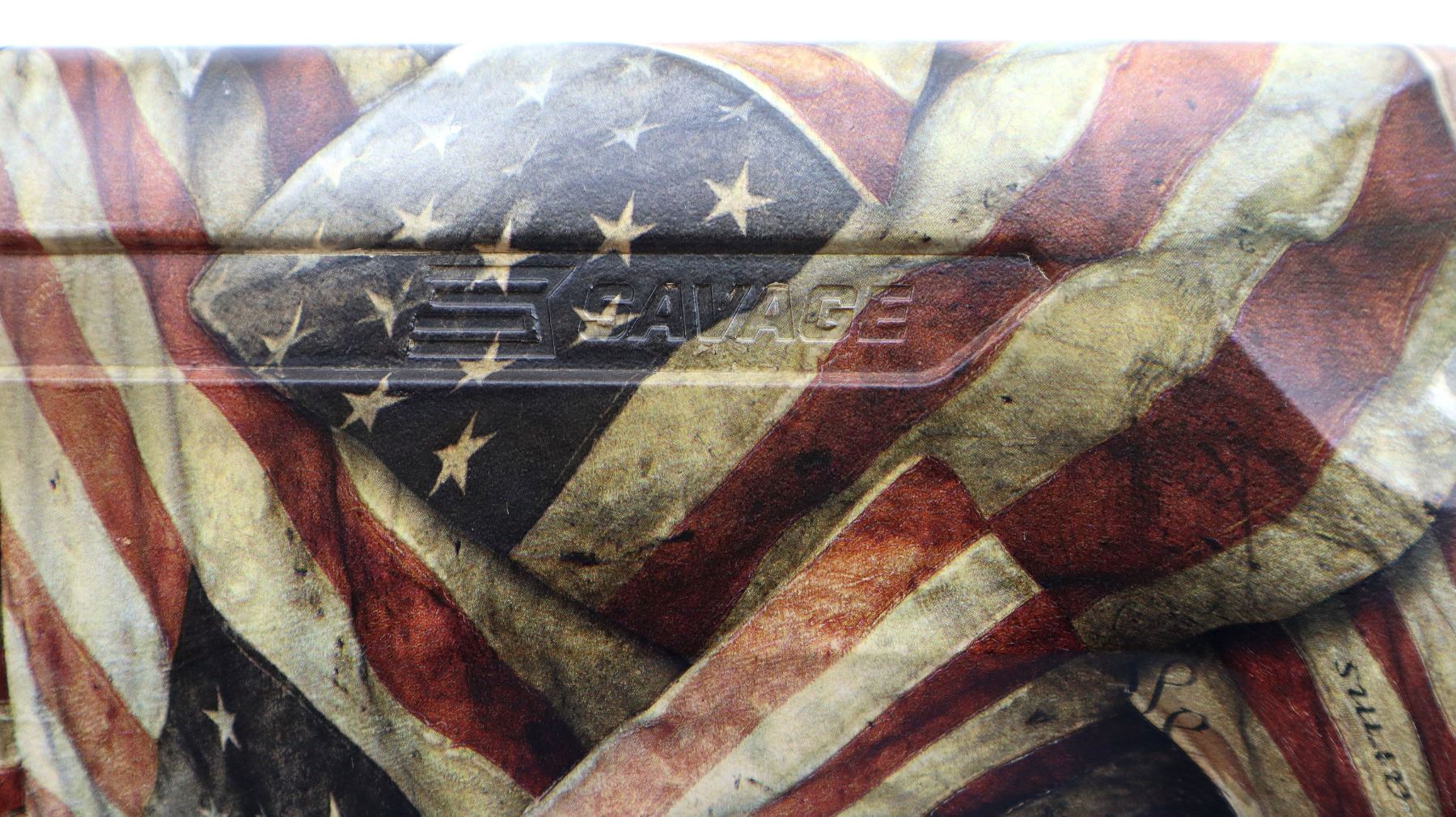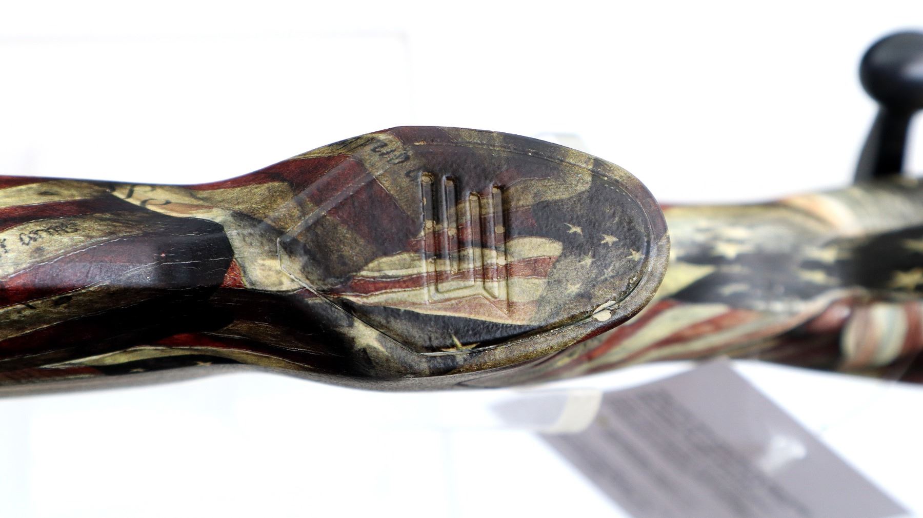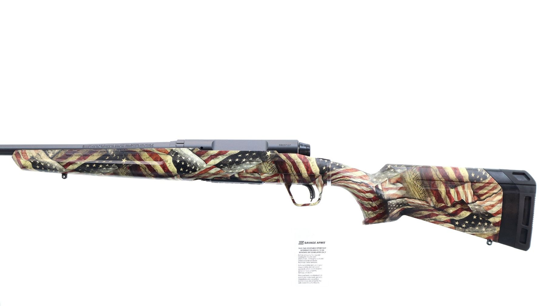 Main Description: No sights, Parkerized metal finish, receiver drilled and tapped with no plug screws installed, smooth bolt knob, tang safety. One piece US flag/Constitution camo stock, grooved forearm and pistol grip panels, black rubber recoil pad with spacer, grip cap, accu trigger, swivel studs.