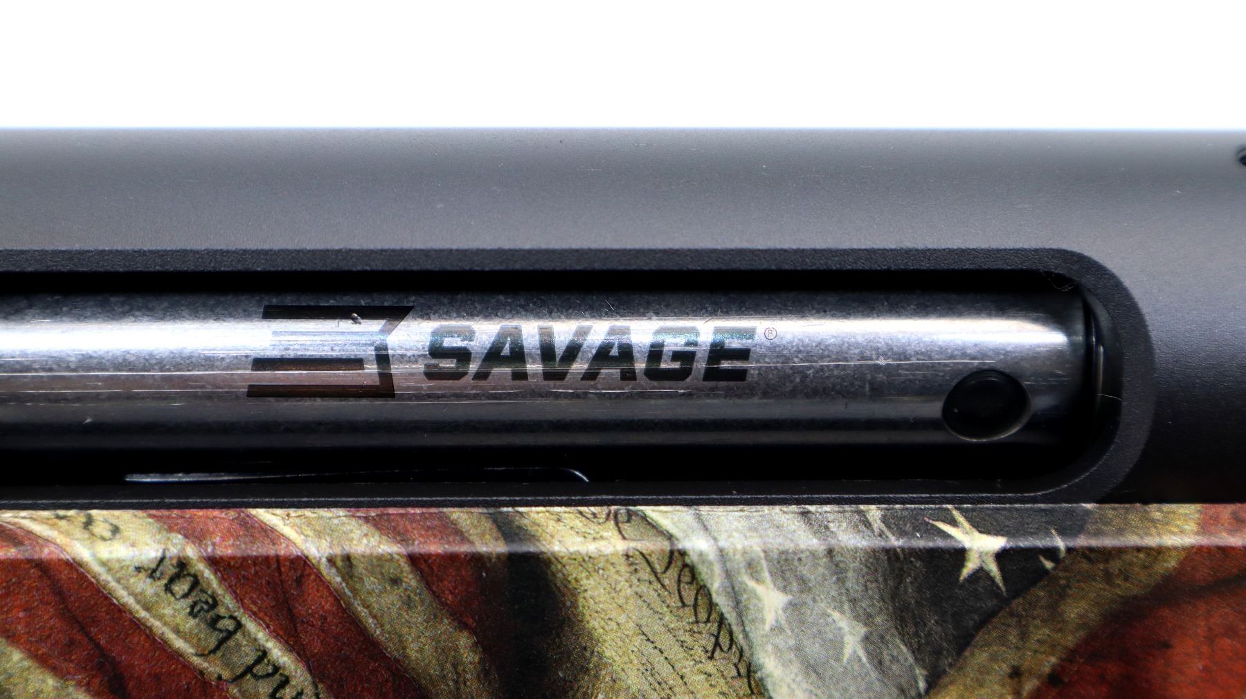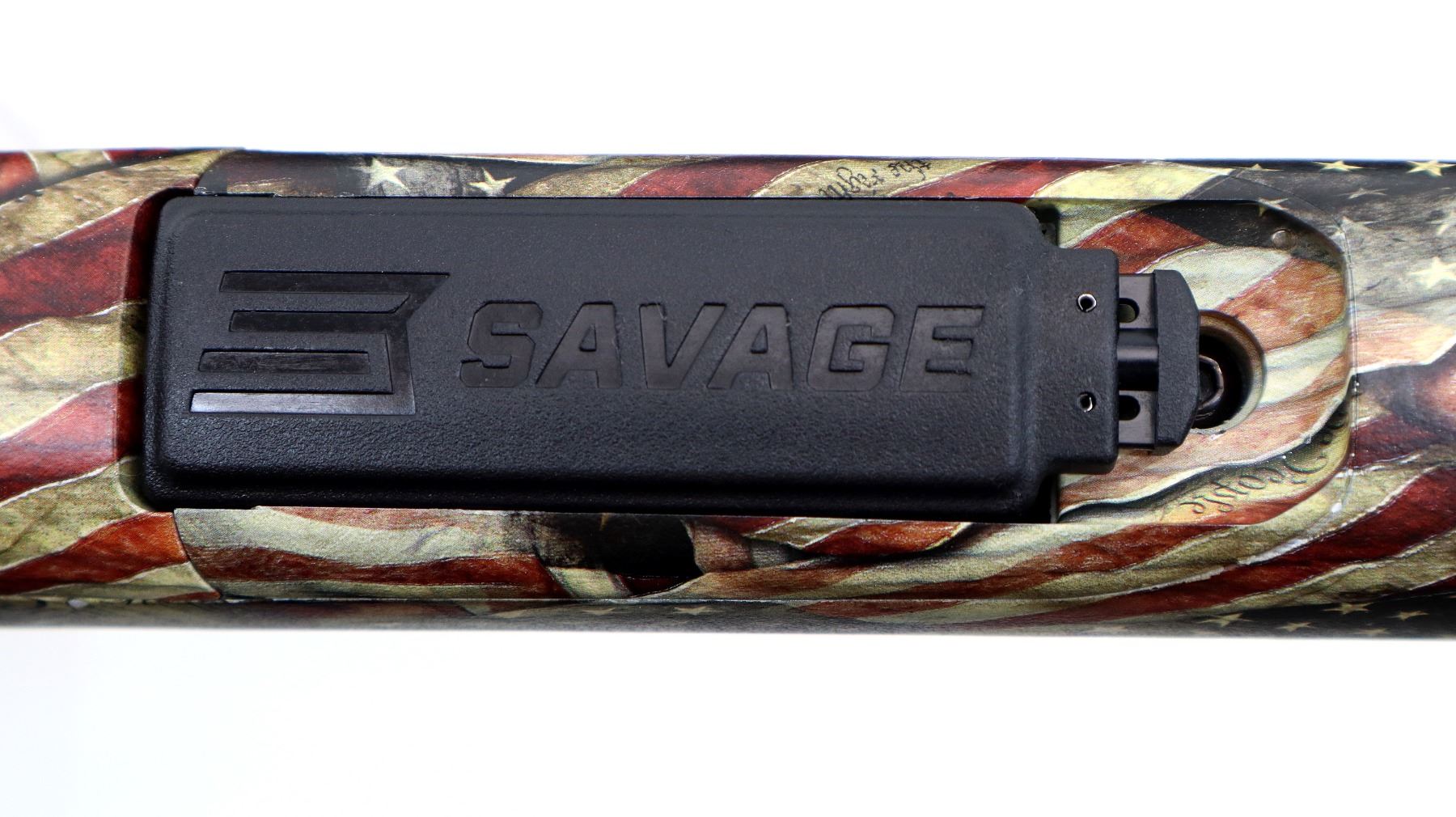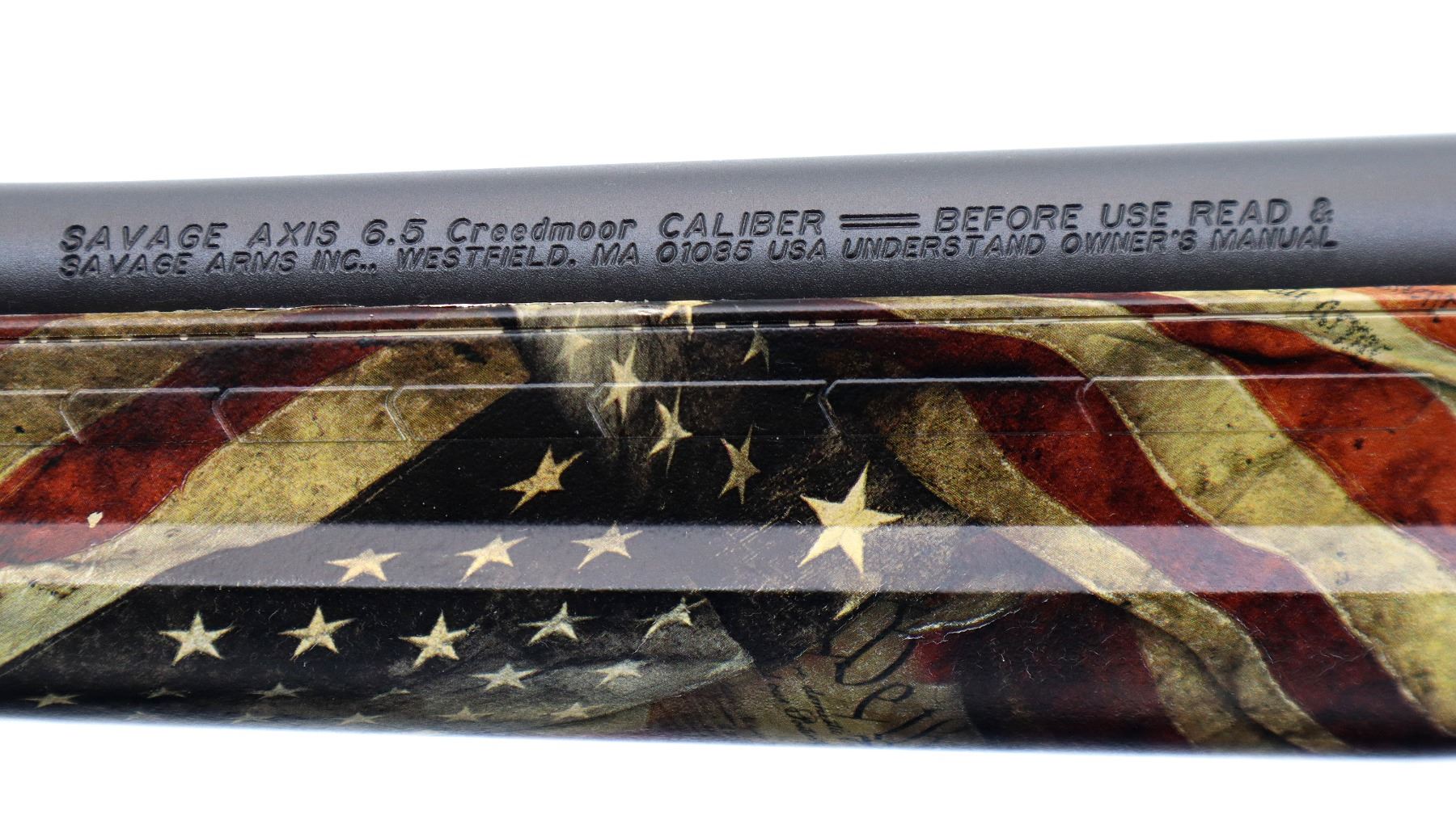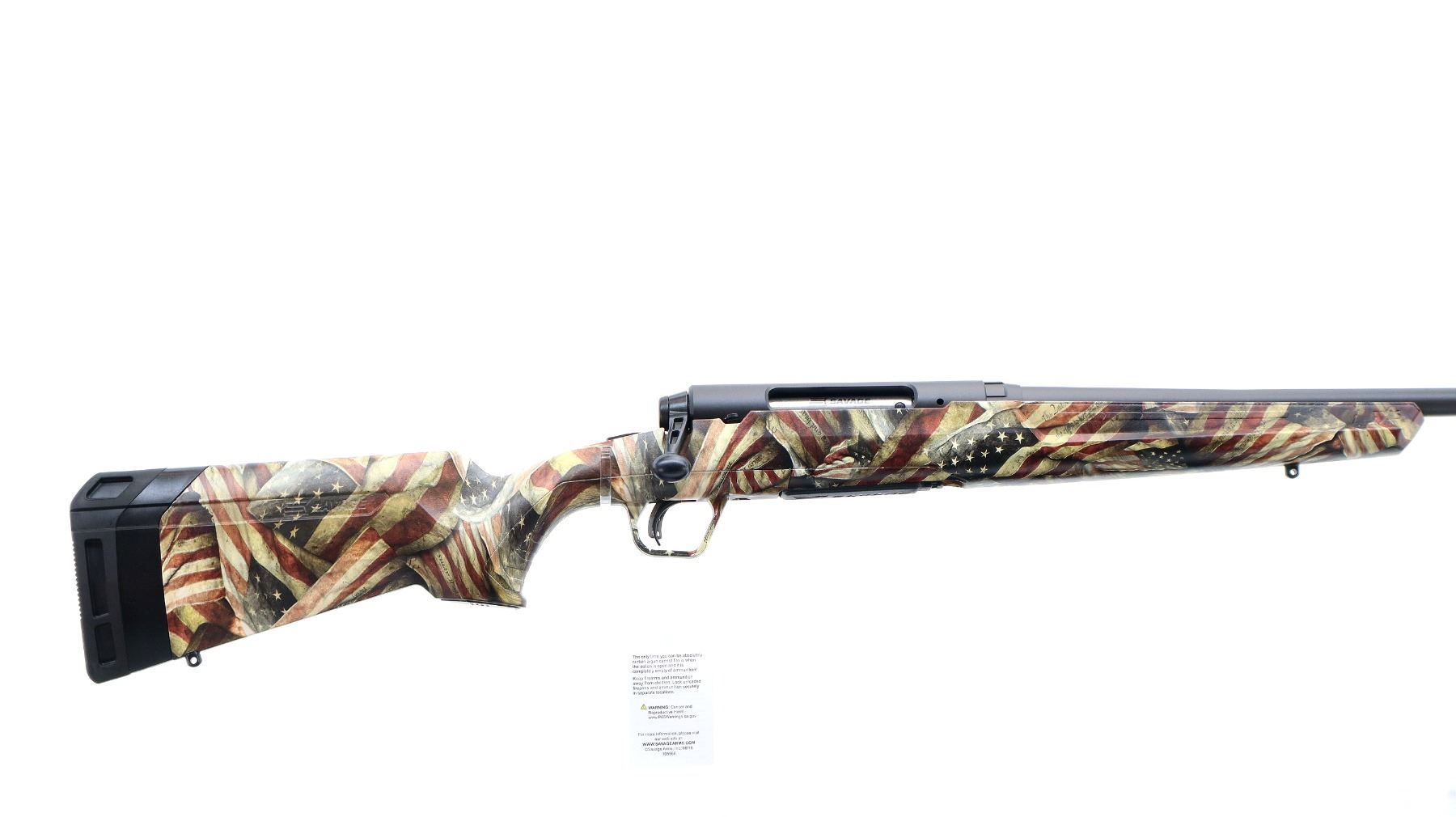 Main Description: No sights, Parkerized metal finish, receiver drilled and tapped with no plug screws installed, smooth bolt knob, tang safety. One piece US flag/Constitution camo stock, grooved forearm and pistol grip panels, black rubber recoil pad with spacer, grip cap, accu trigger, swivel studs.