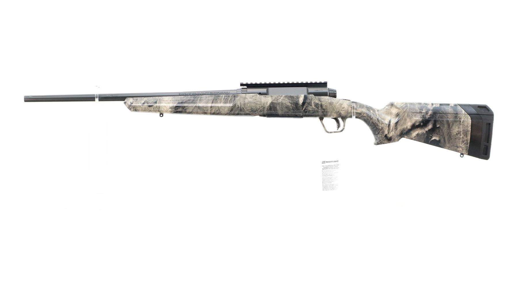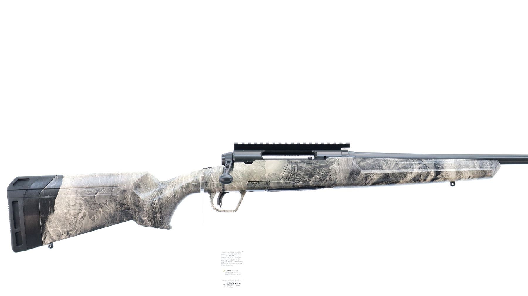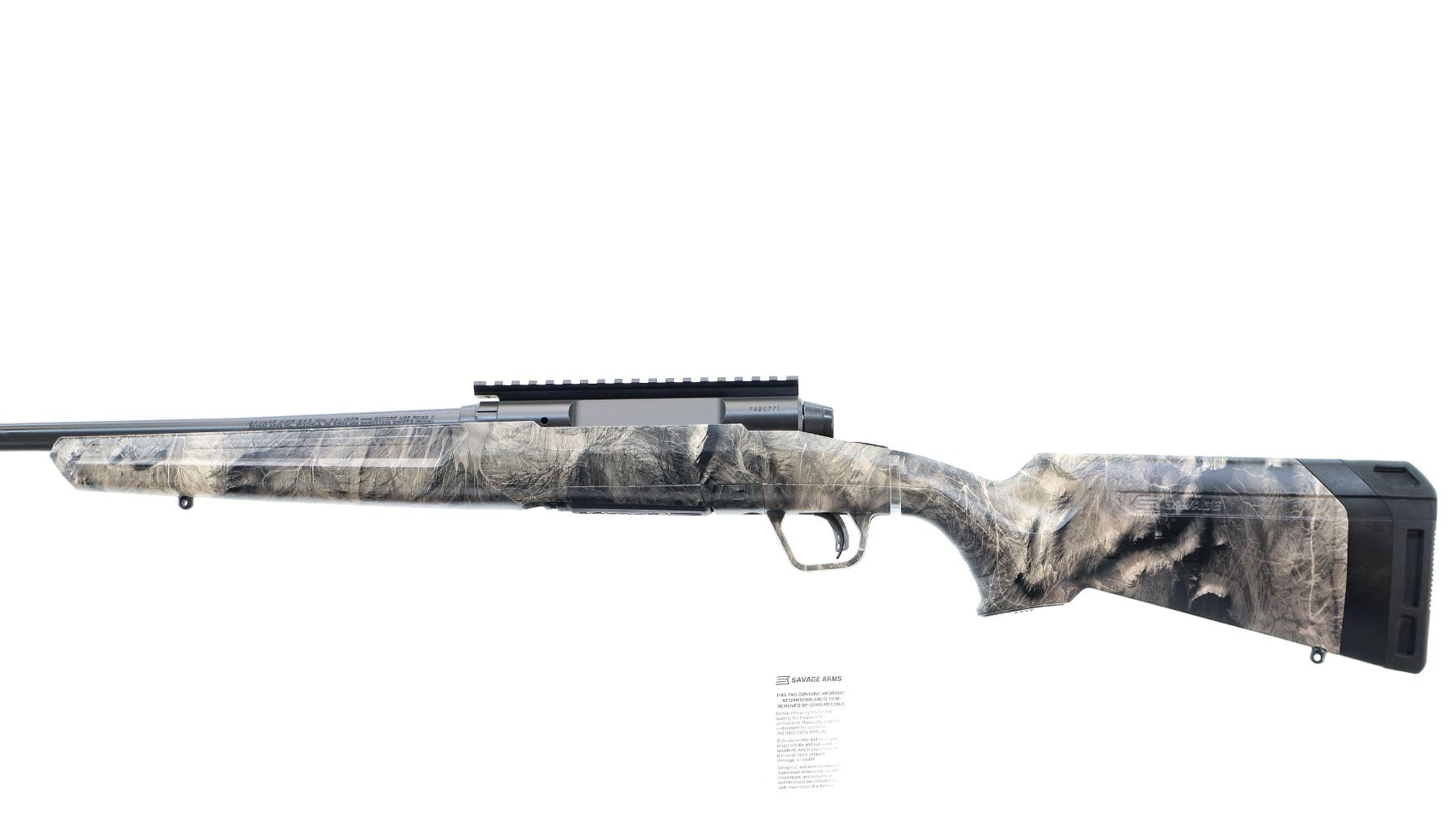 Main Description: No sights, has Carbon Elite Cerakote finish, receiver drilled and tapped with one piece scope rail installed, flat sided bolt knob, tang safety. One piece Mossy Oak Overwatch Camo Synthetic stock, grooved forearm and pistol grip panels, black rubber recoil pad with spacer, grip cap, accu trigger, swivel studs, retains factory hang tag.