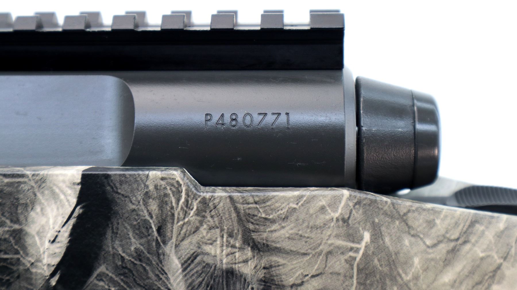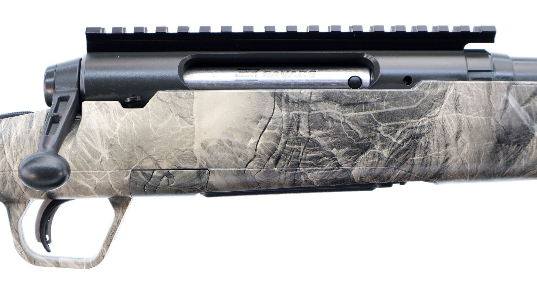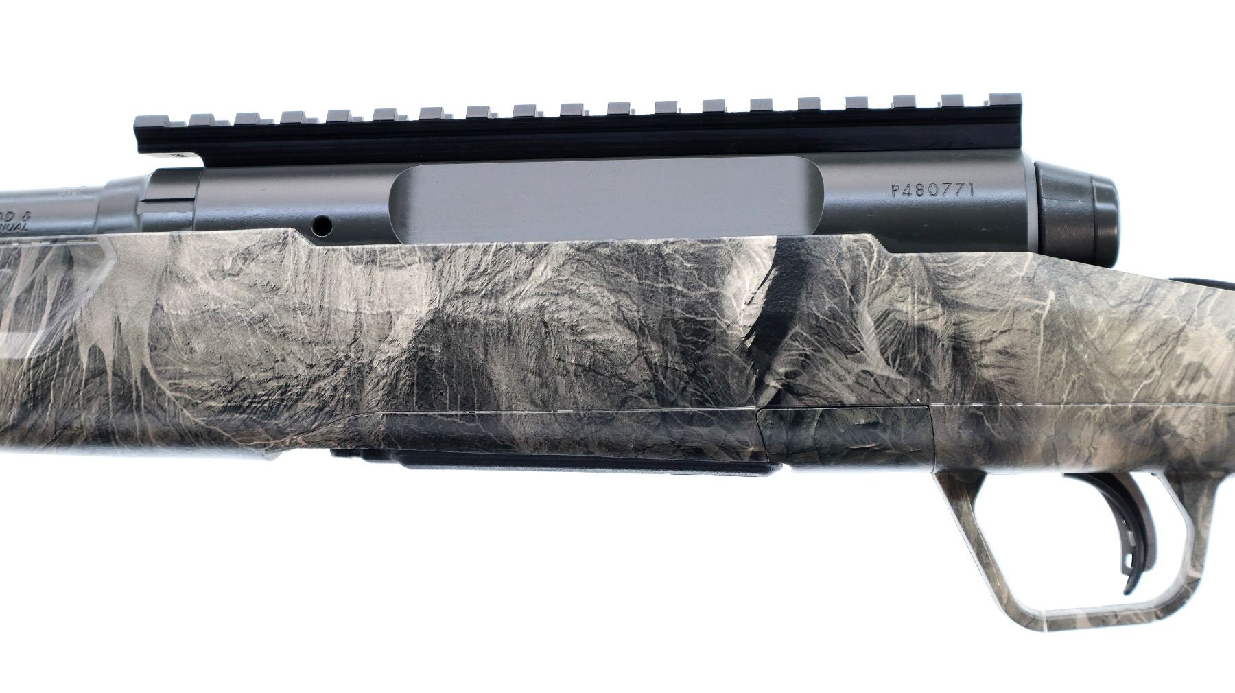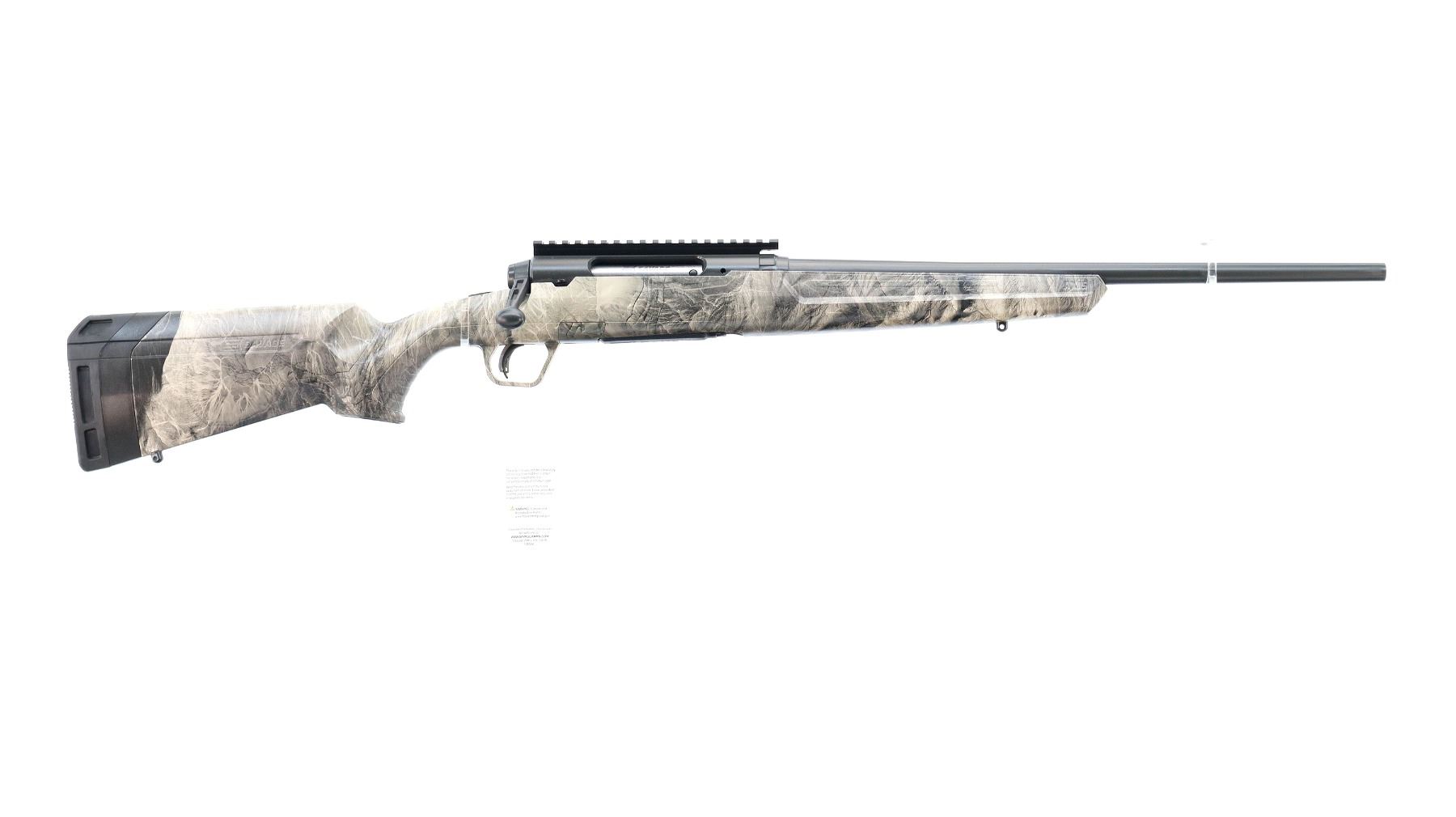 Main Description: No sights, has Carbon Elite Cerakote finish, receiver drilled and tapped with one piece scope rail installed, flat sided bolt knob, tang safety. One piece Mossy Oak Overwatch Camo Synthetic stock, grooved forearm and pistol grip panels, black rubber recoil pad with spacer, grip cap, accu trigger, swivel studs, retains factory hang tag.