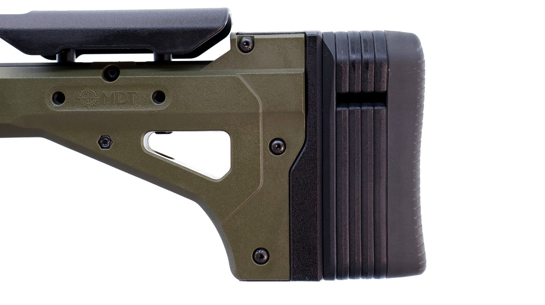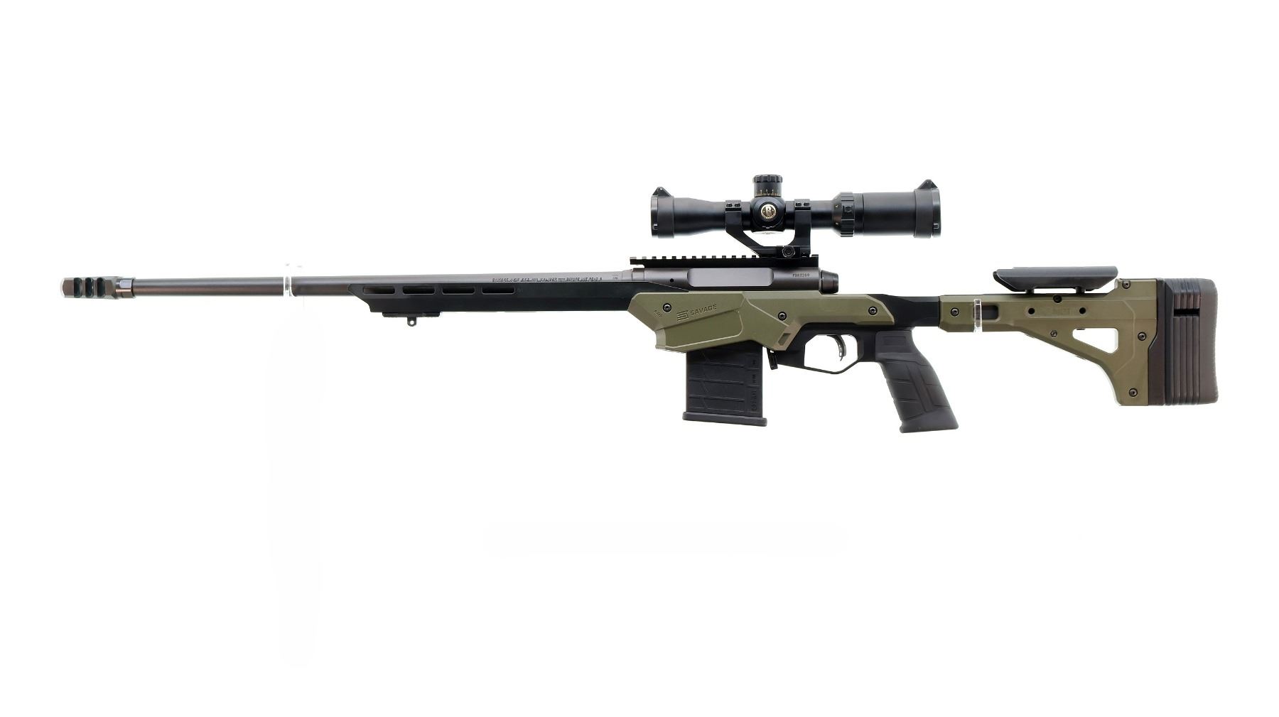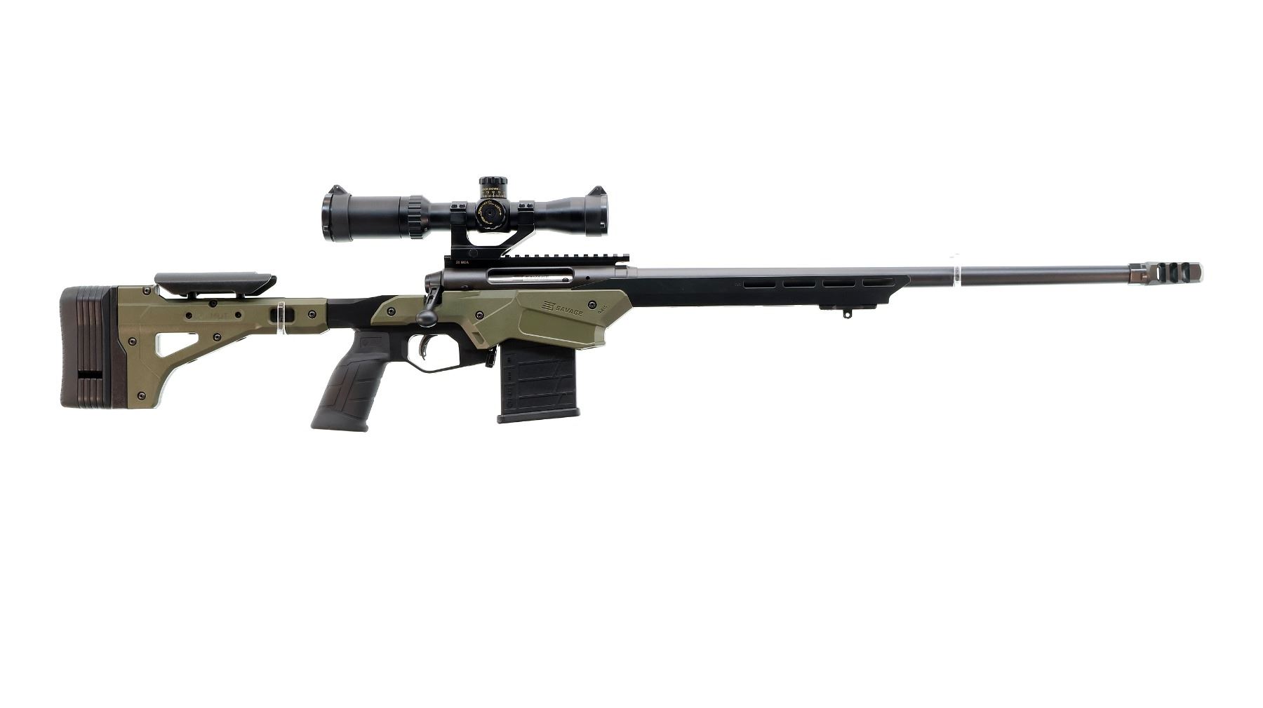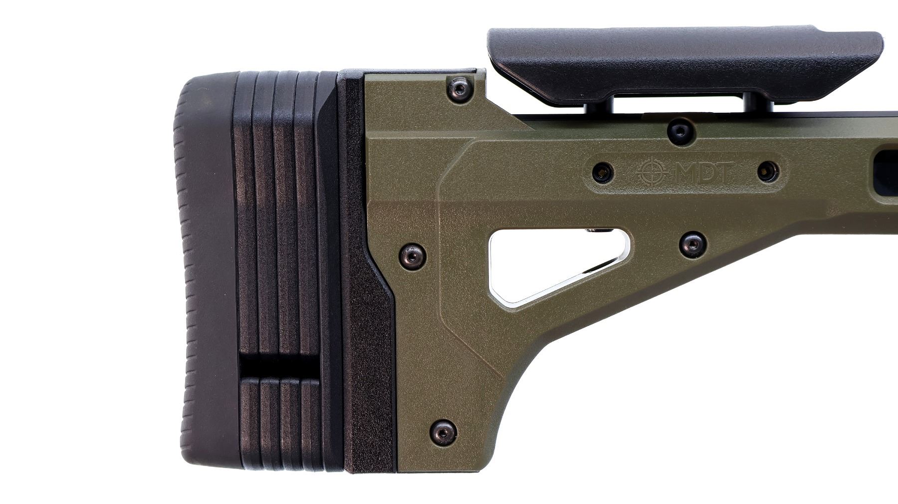 Main Description: No sights, Parkerized metal finish, heavy barrel threaded at muzzle with MDT brake installed, receiver drilled and tapped with one piece rail raised mount and Bushnell custom gold 1.5-6x32 scope installed, optics have clear droplet markings with range finding reticle, illumination functions, smooth bolt knob, tang safety. One piece black alloy ventilated forearm, ODG/Black Chasse, grooved pistol grip, adjustable comb, black rubber recoil pad with four spacers, accu trigger, ambi mag release, front swivel stud.