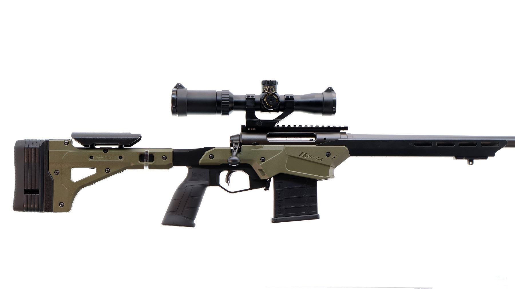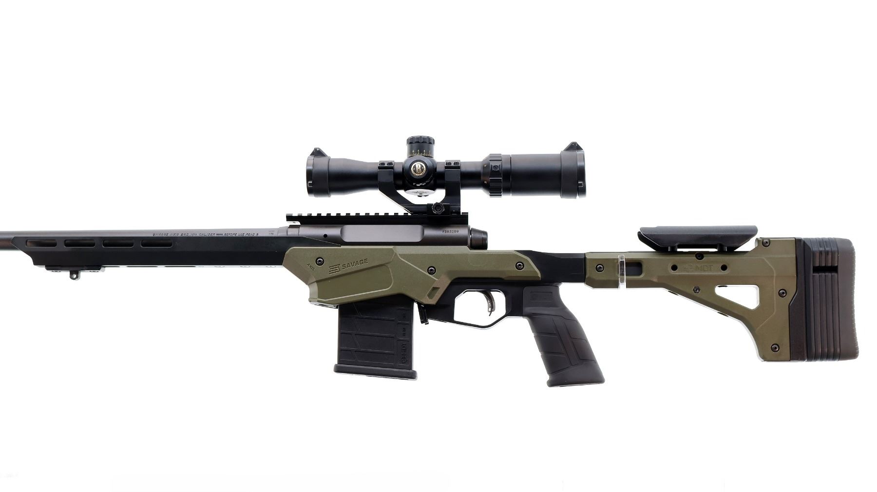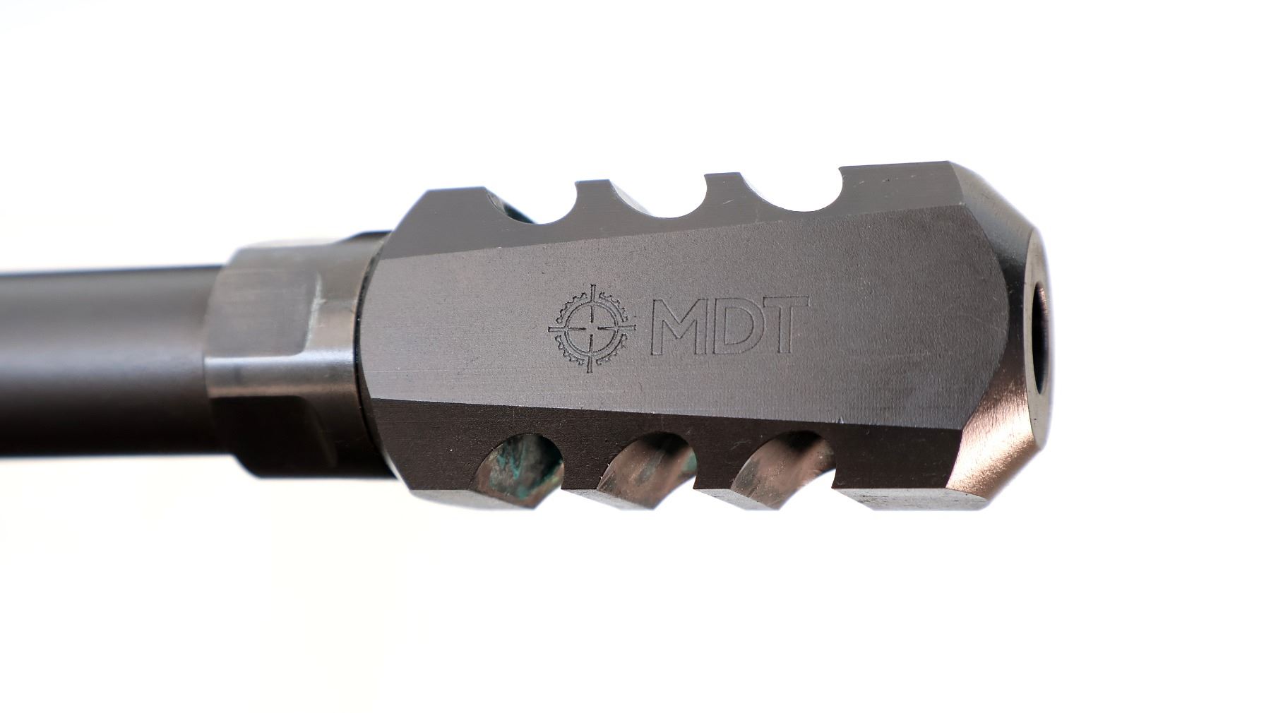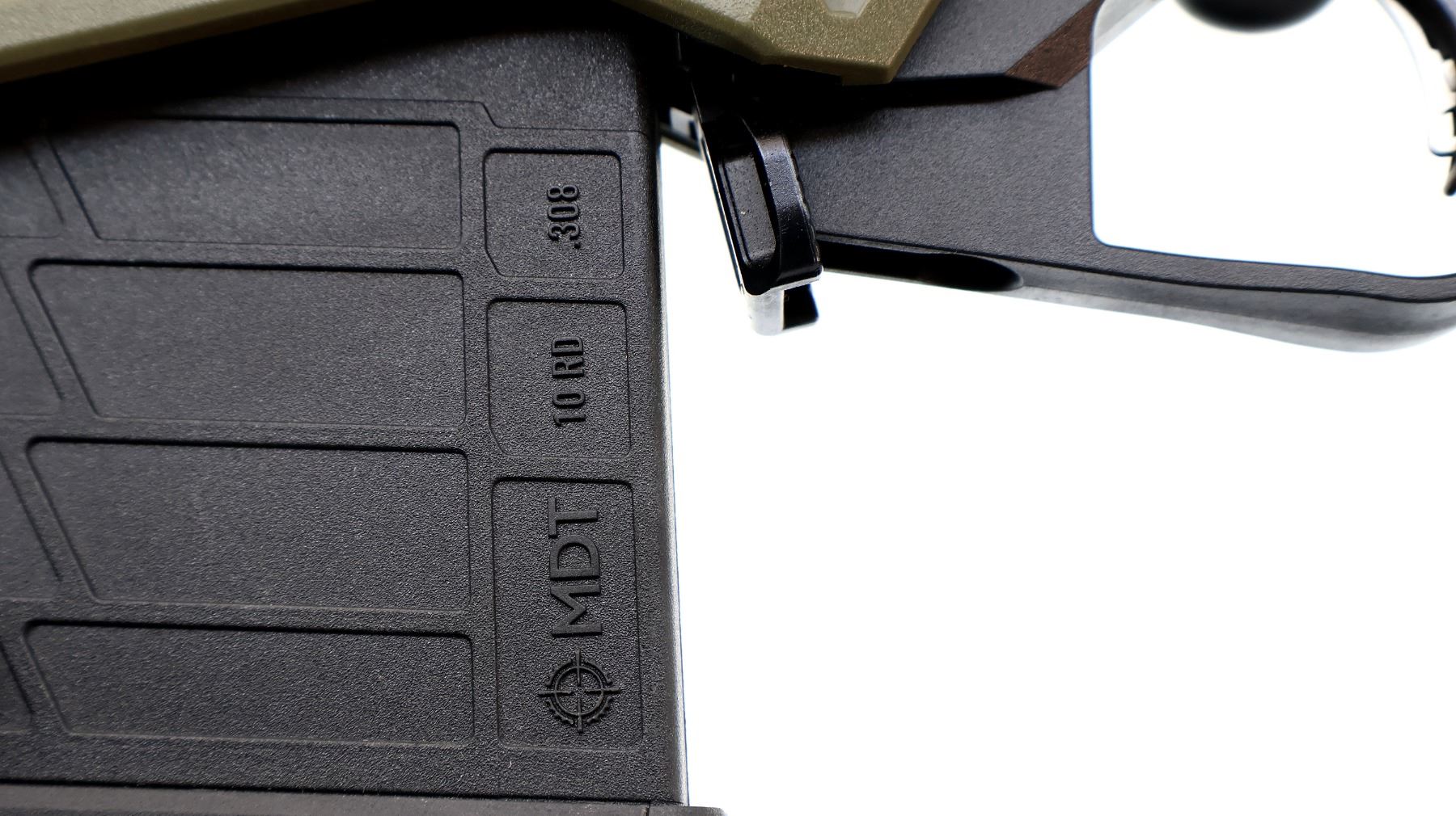 Main Description: No sights, Parkerized metal finish, heavy barrel threaded at muzzle with MDT brake installed, receiver drilled and tapped with one piece rail raised mount and Bushnell custom gold 1.5-6x32 scope installed, optics have clear droplet markings with range finding reticle, illumination functions, smooth bolt knob, tang safety. One piece black alloy ventilated forearm, ODG/Black Chasse, grooved pistol grip, adjustable comb, black rubber recoil pad with four spacers, accu trigger, ambi mag release, front swivel stud.