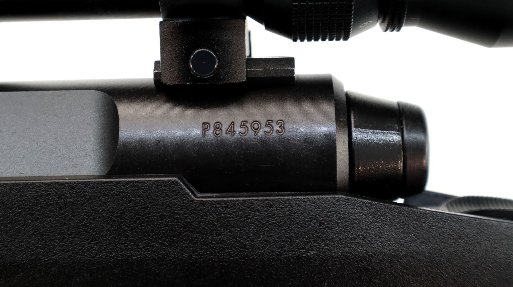 Main Description: No sights, Parkerized metal finish, round barrel, receiver drilled and tapped with Weaver 3-9x40 scope installed, clear optics with duplex crosshair. Tang safety. One piece black synthetic stock, grooved forearm and pistol grip panels, black rubber recoil pad, 13.5" LOP, grip cap, non accu trigger, swivel studs, retains factory stickers and hang tag.