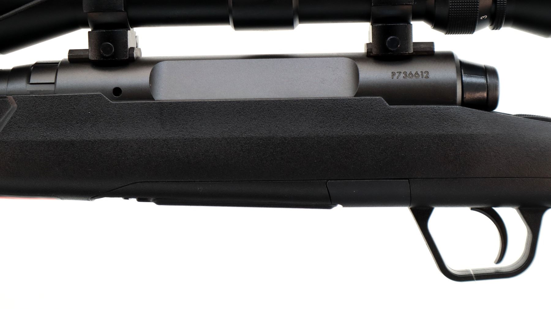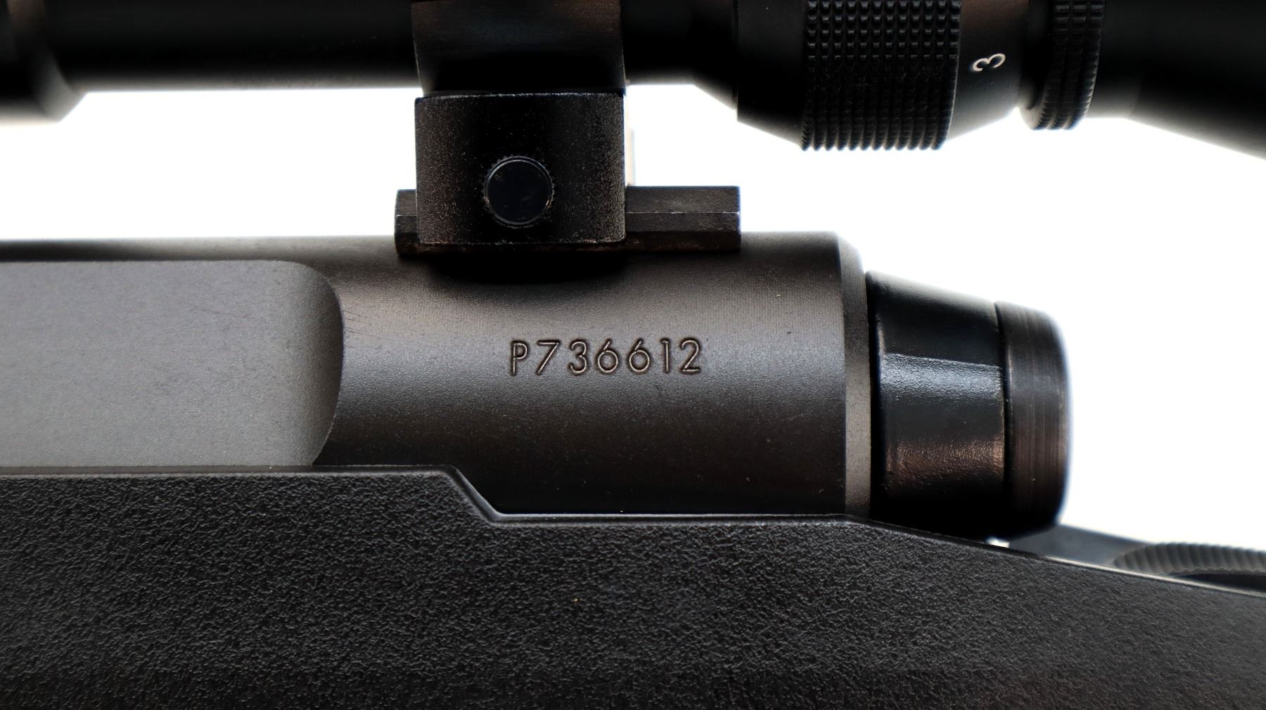 Main Description: No sights, Parkerized metal finish, receiver drilled and tapped with a Weaver 3-9x40 scope installed, clear optics with duplex crosshair. Tang safety. One piece black synthetic stock, grooved forearm and pistol grip panels, black vented rubber recoil pad with spacer, grip cap, non accu trigger, swivel studs, retains factory stickers and hang tag.