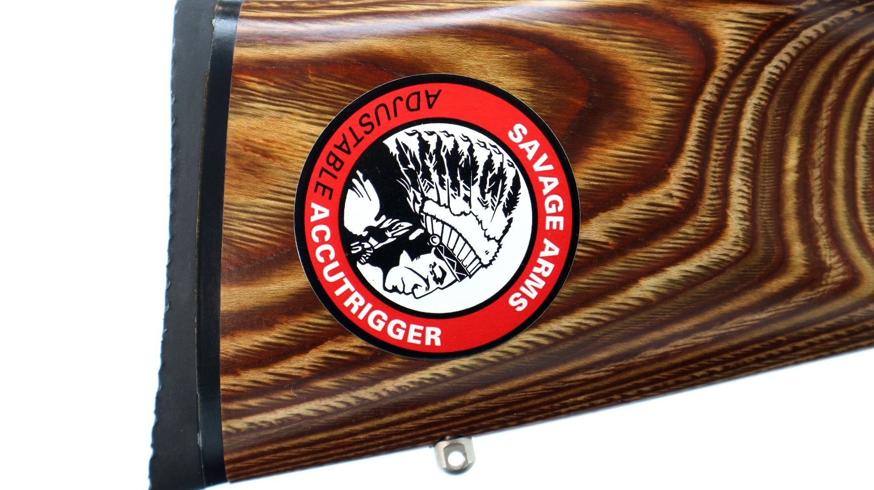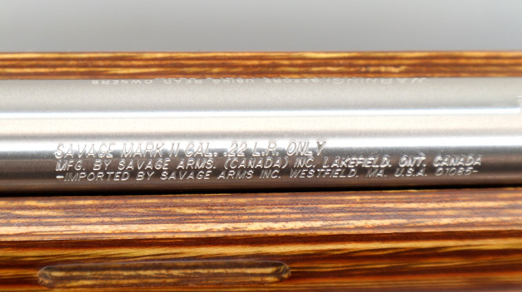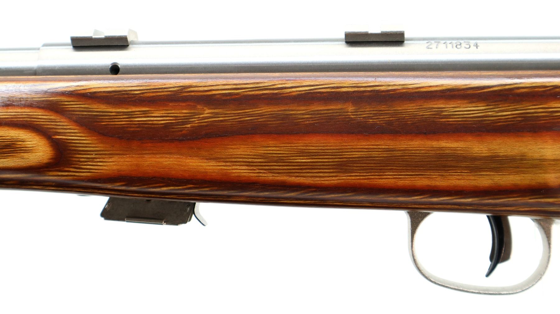 Main Description: No sights, stainless finish, heavy barrel, receiver drilled and tapped with two piece scope bases installed. One piece brown laminate wood stock, ventilated forearm, thumb hole pistol grip, cheek rest, black rubber recoil pad, accu trigger, three swivel studs, retains factory stickers.