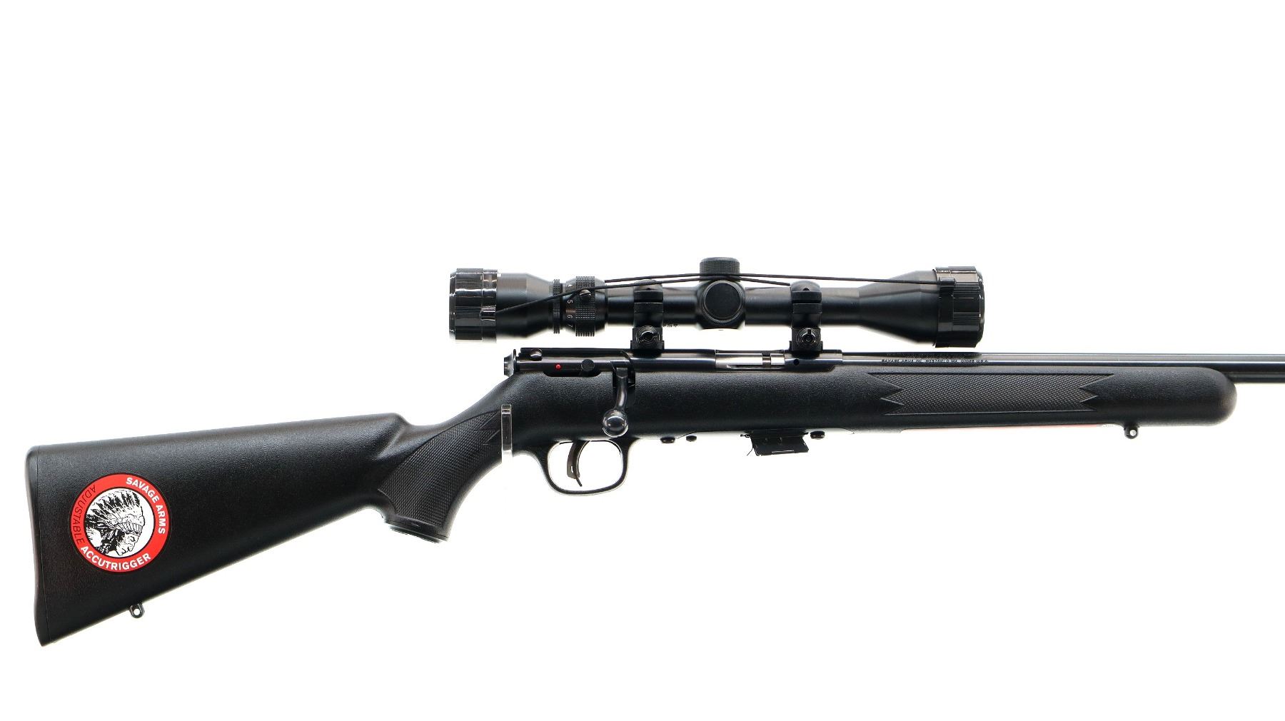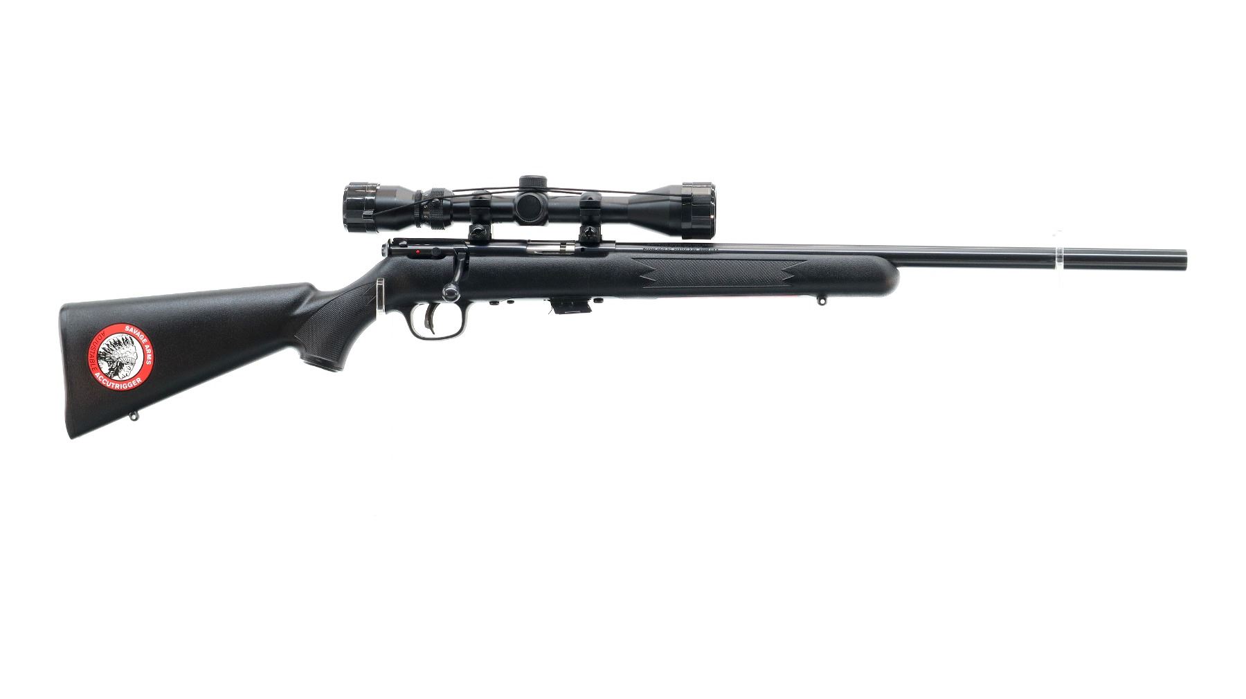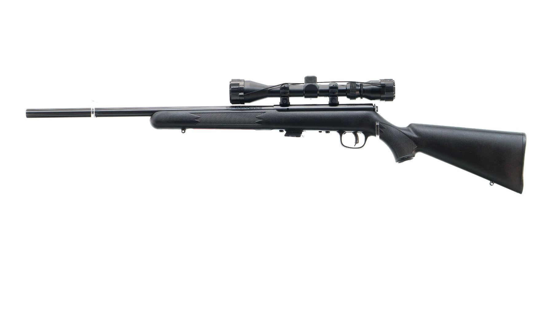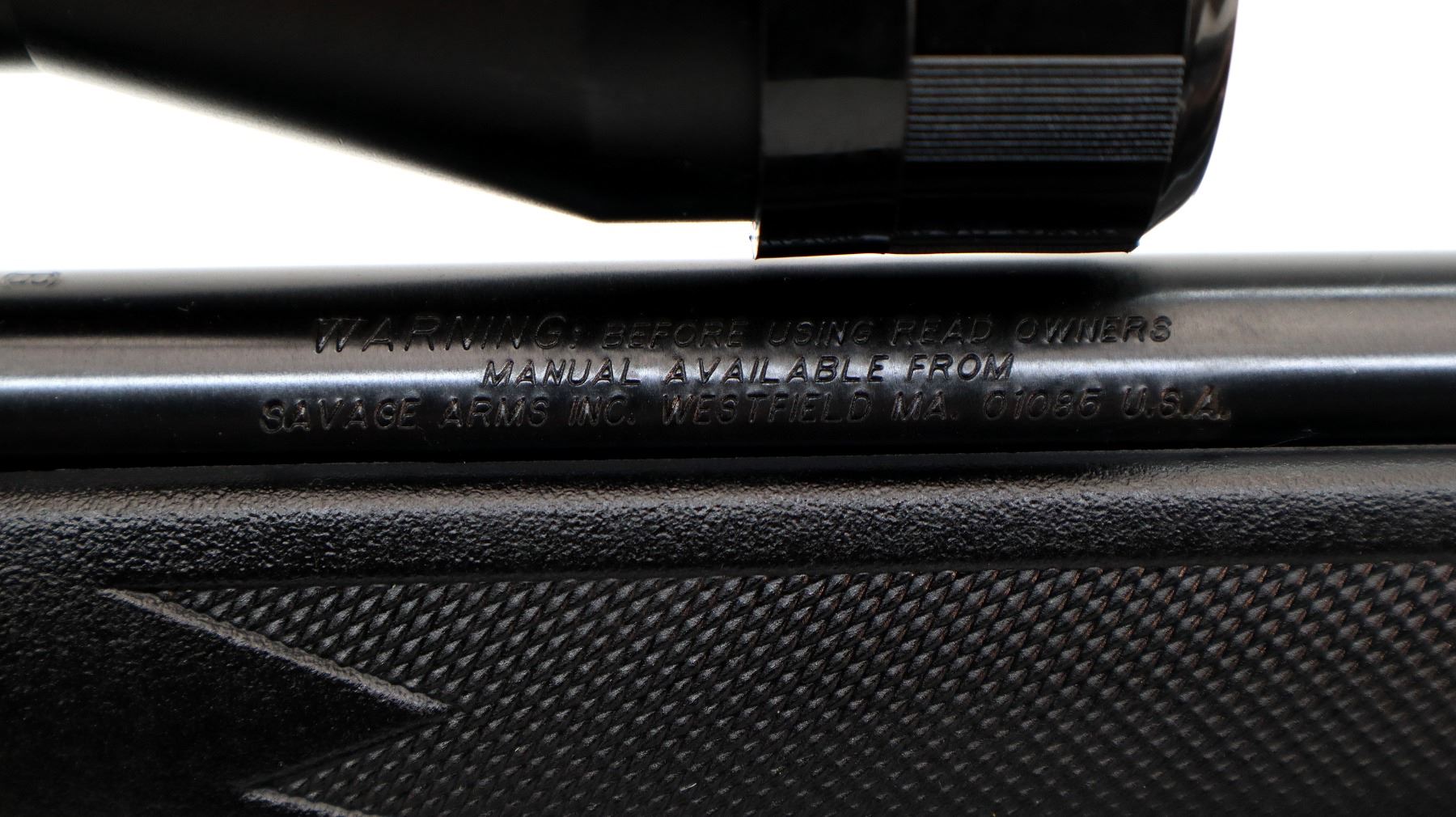 Main Description: No sights, blued finish, heavy barrel, receiver drilled and tapped with Bushnell 3-9x40 scope installed, clear optics with duplex crosshair. One piece black synthetic stock, checkered forearm and pistol grip, grooved black polymer butt plate, grip cap, accu trigger, swivel studs, retains factory stickers.