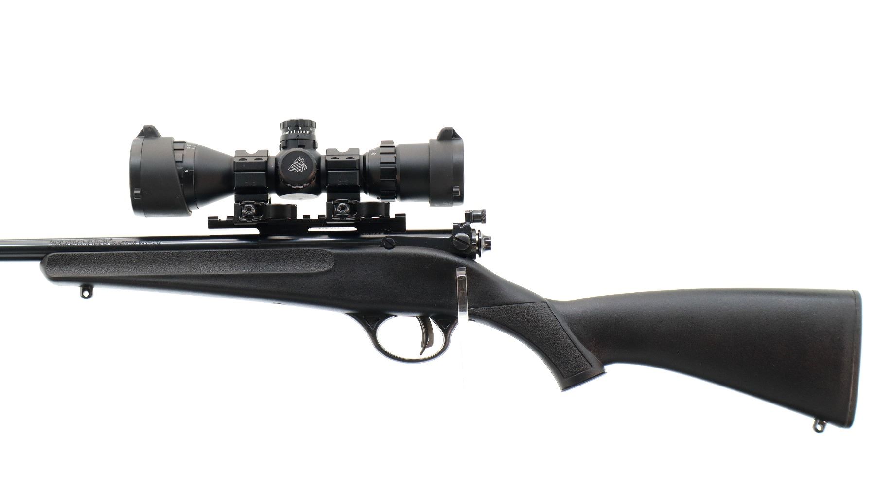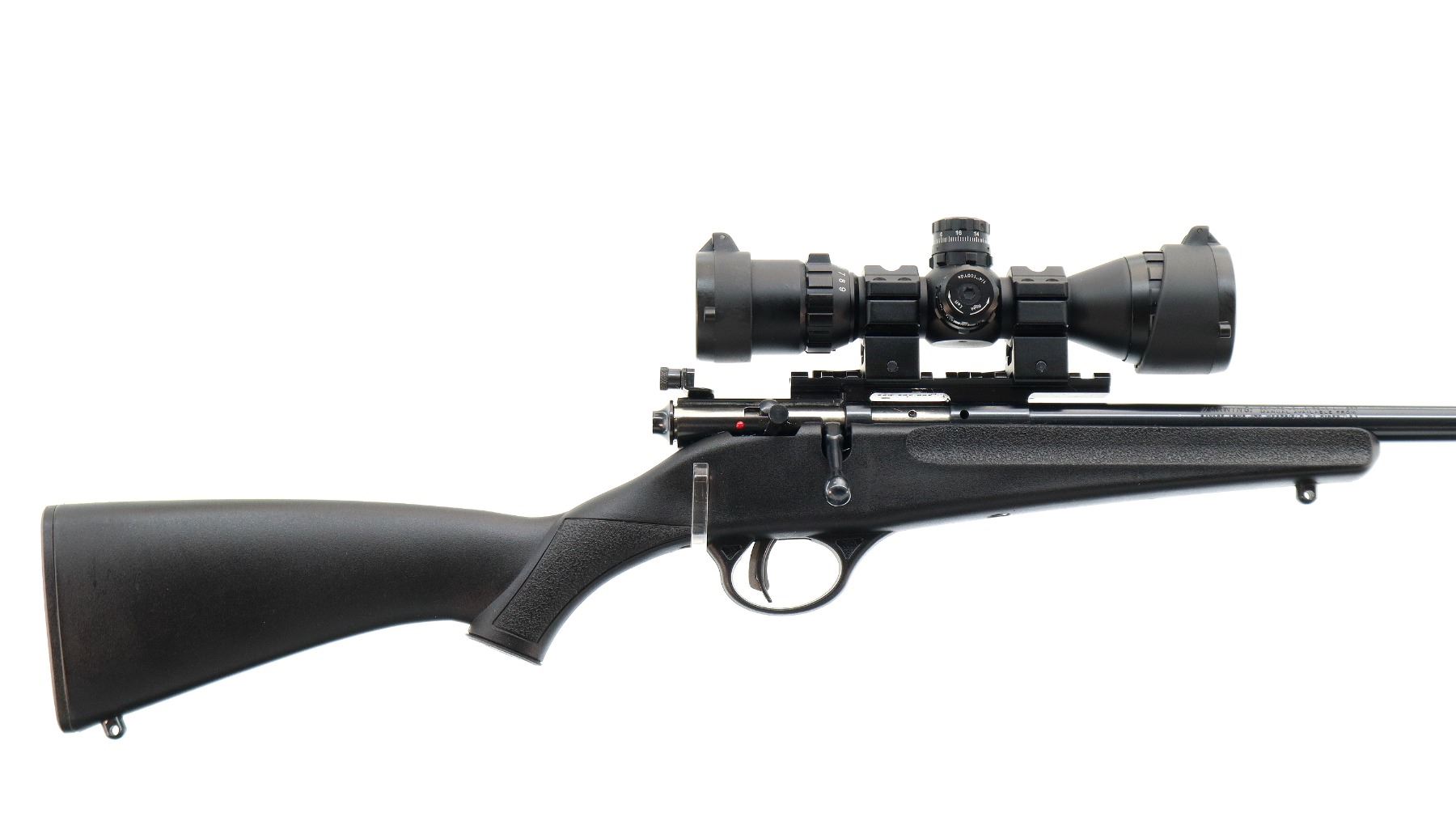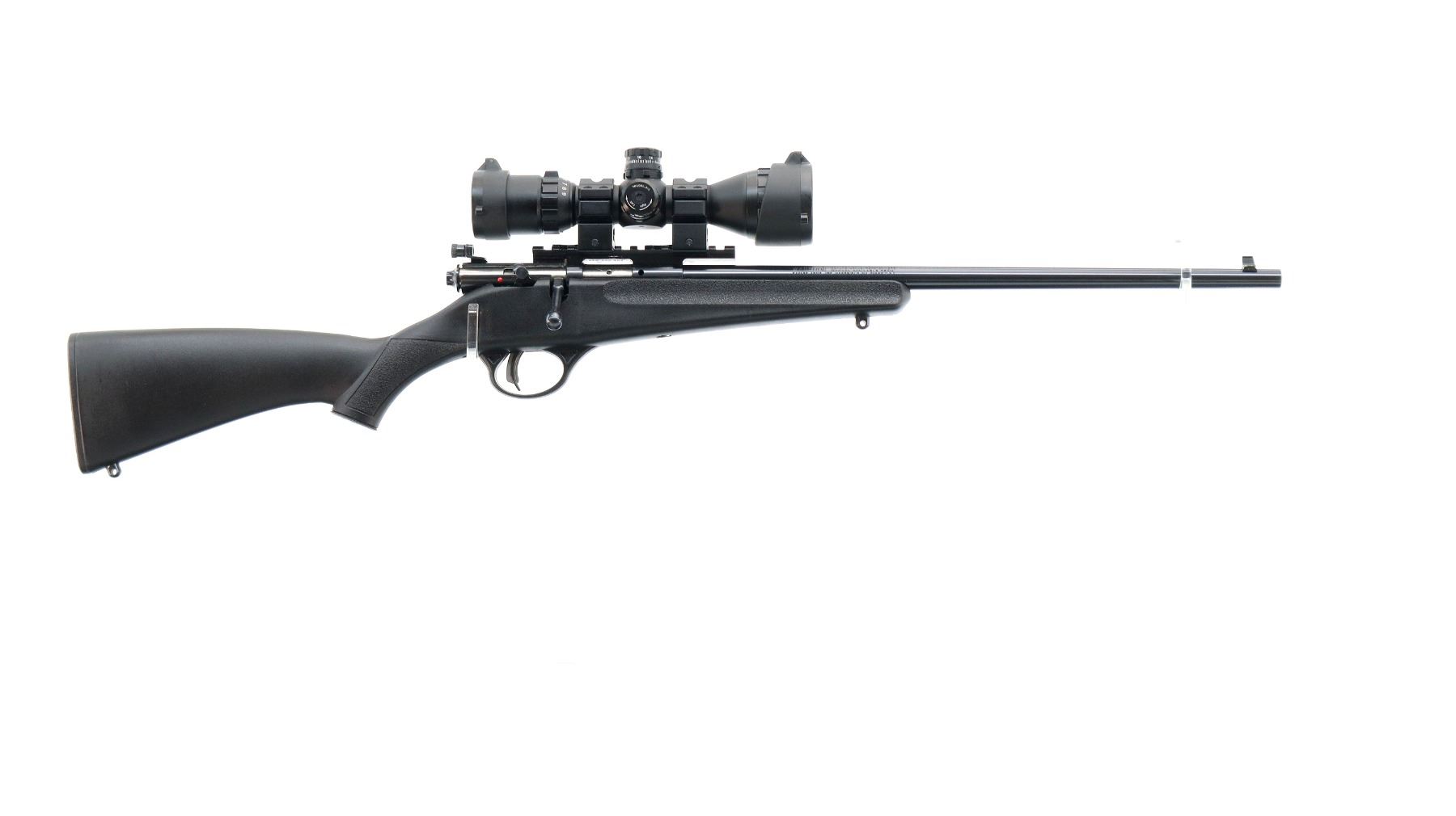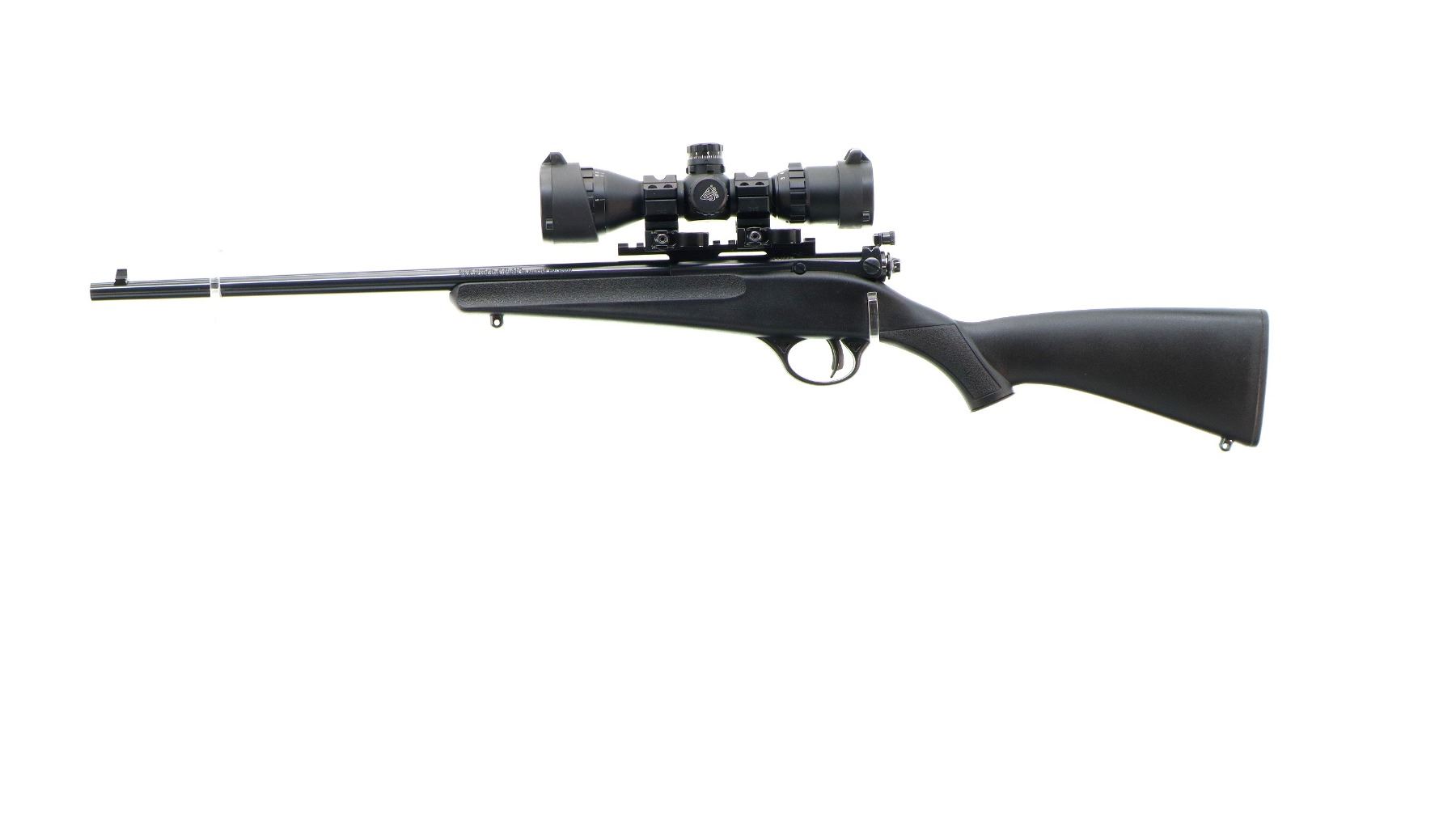 Main Description: Blade front sight, adjustable rear peep sight, blued finish, receiver drilled and tapped with one piece rail, UTG QD scope rings, 3-9 AO scope, clear optics Mil Dot reticle and green and red illumination function. One piece black synthetic stock, textured forearm and pistol grip, smooth black polymer butt plate, 11.5" LOP, grip cap, accu trigger, swivel studs.