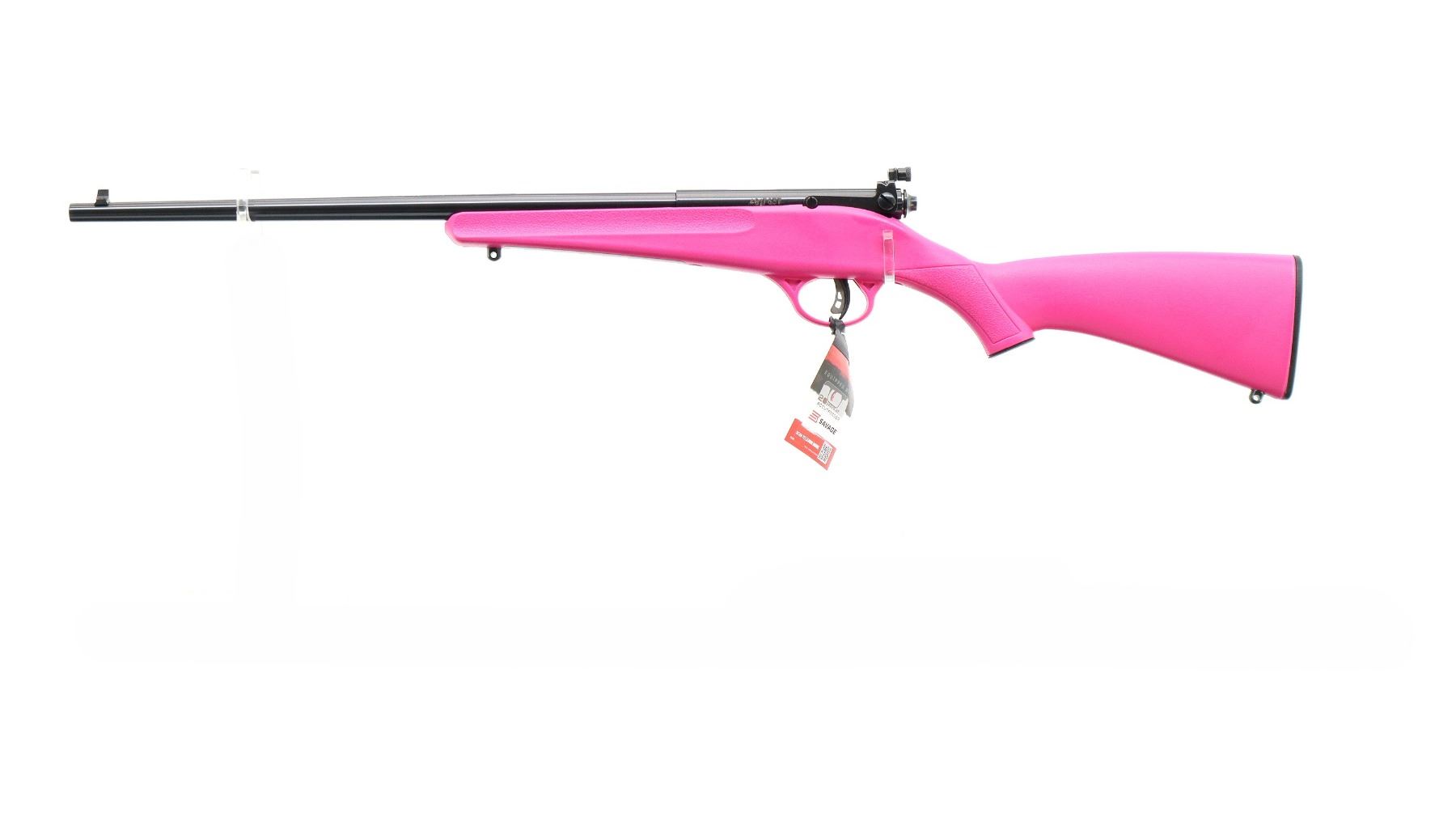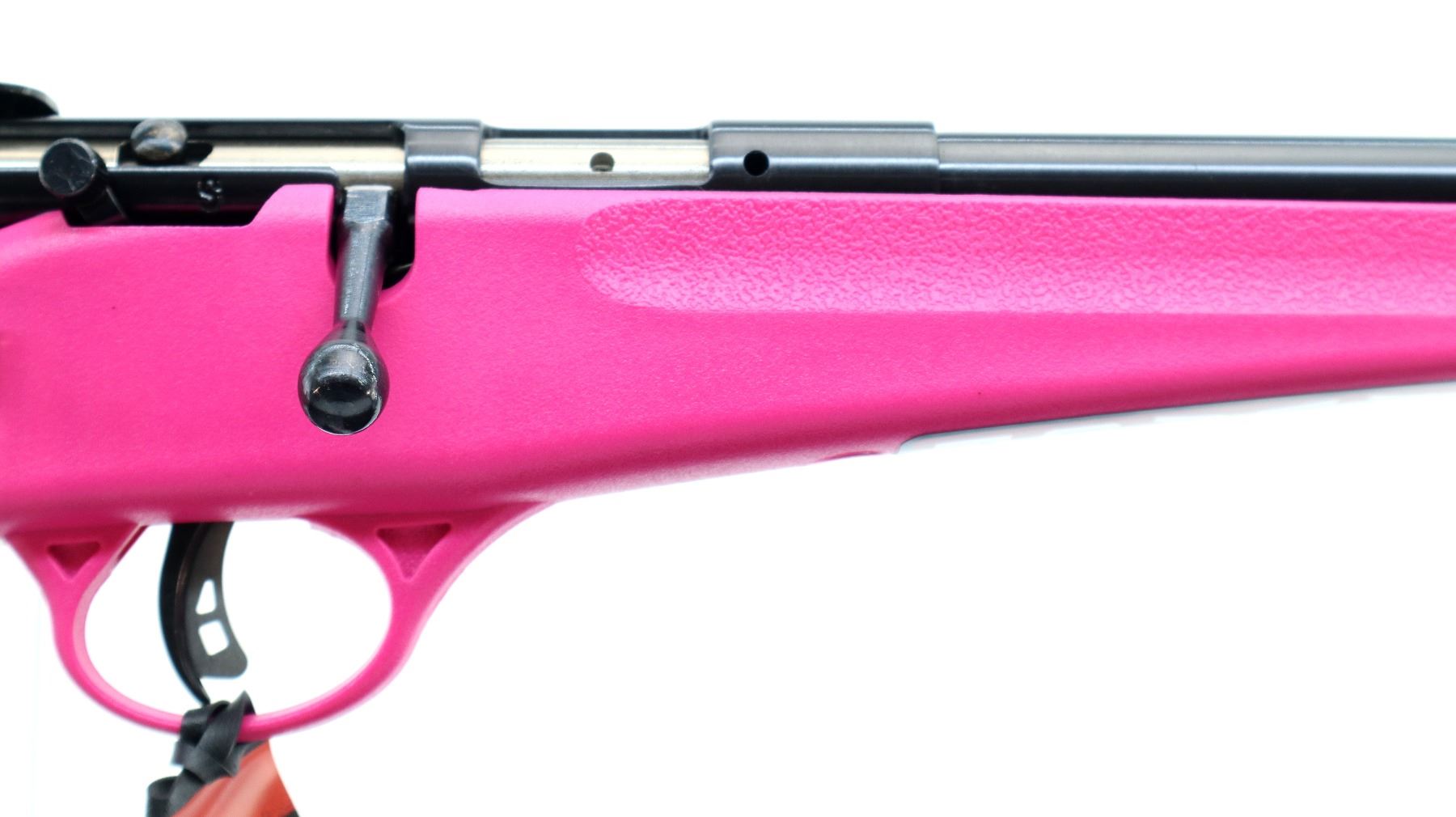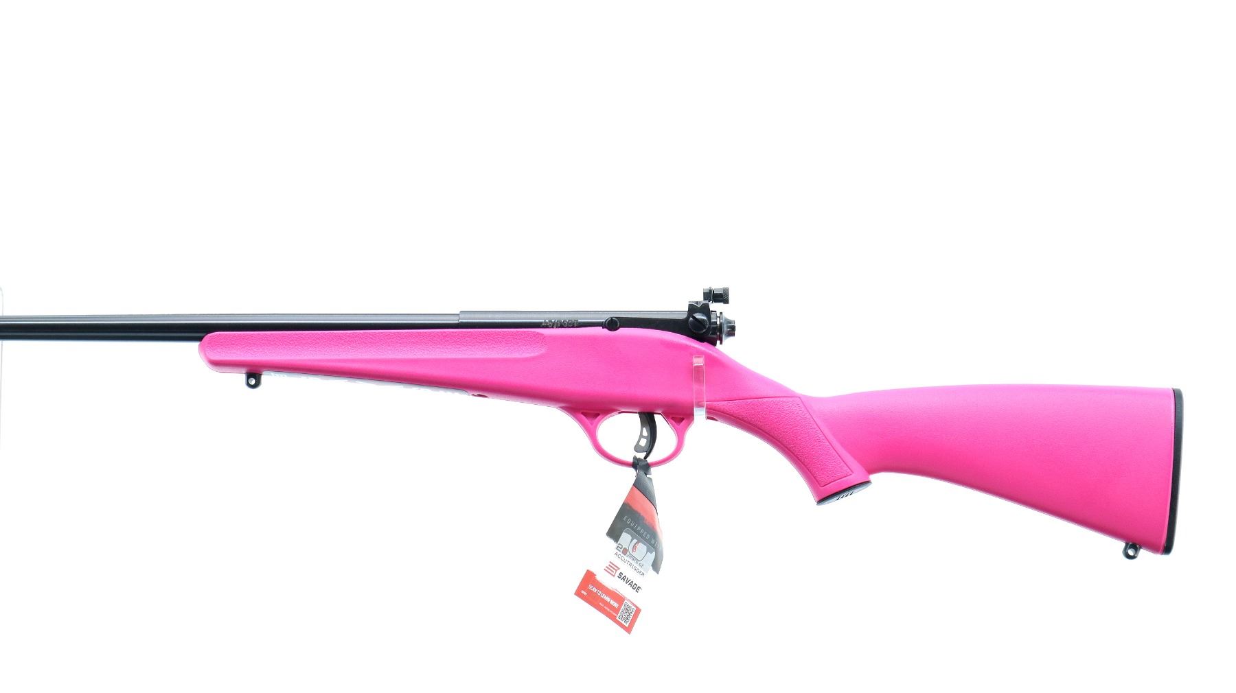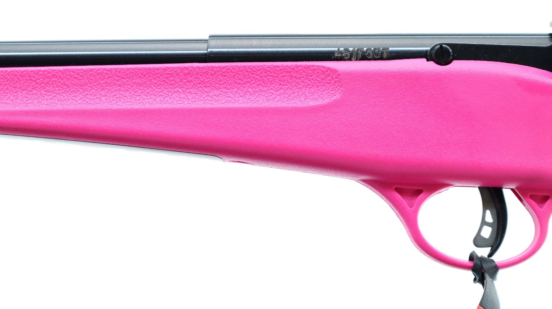 Main Description: Blade front sight, adjustable rear peep sight, blued finish, receiver drilled and tapped with no plug screws installed, smooth bolt knob. One piece pink synthetic stock, textured forearm and pistol grip, black polymer butt plate, 11.5" LOP, grip cap, accu trigger, swivel studs, retains factory stickers and hang tag.