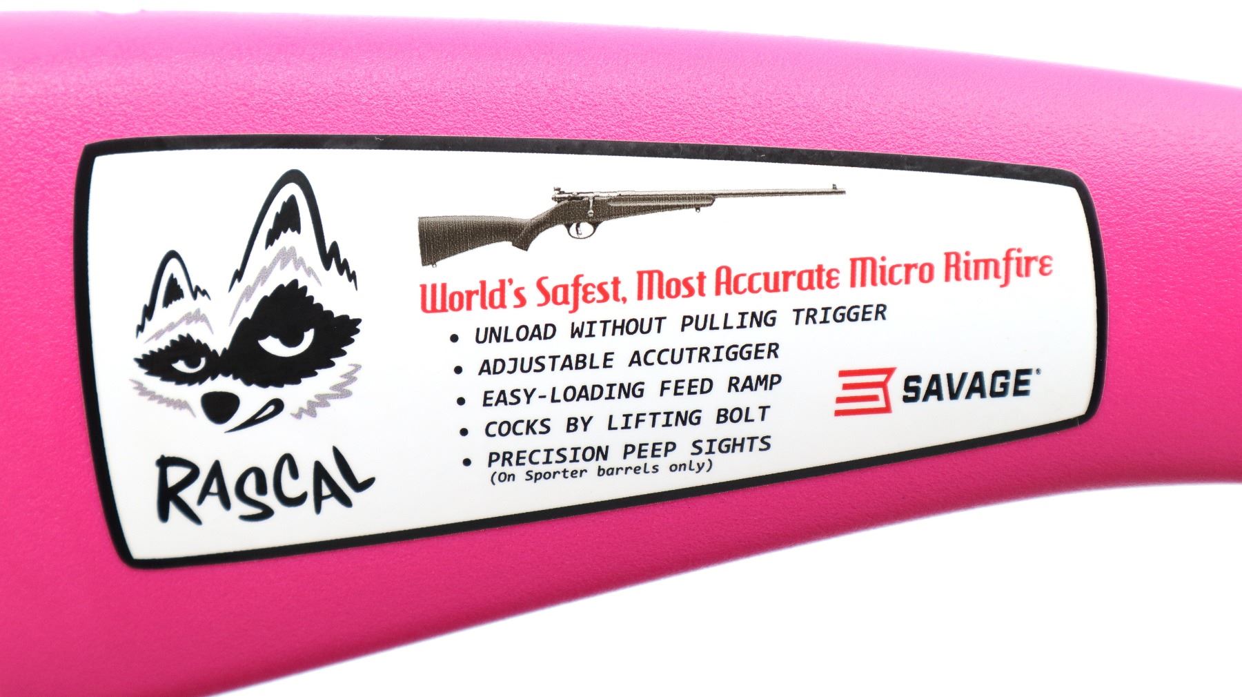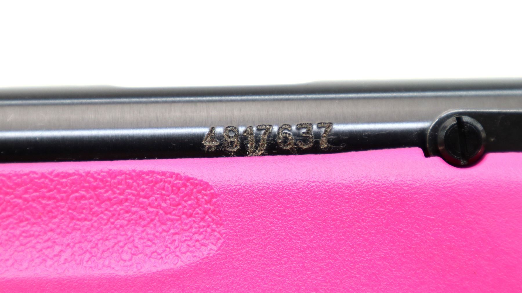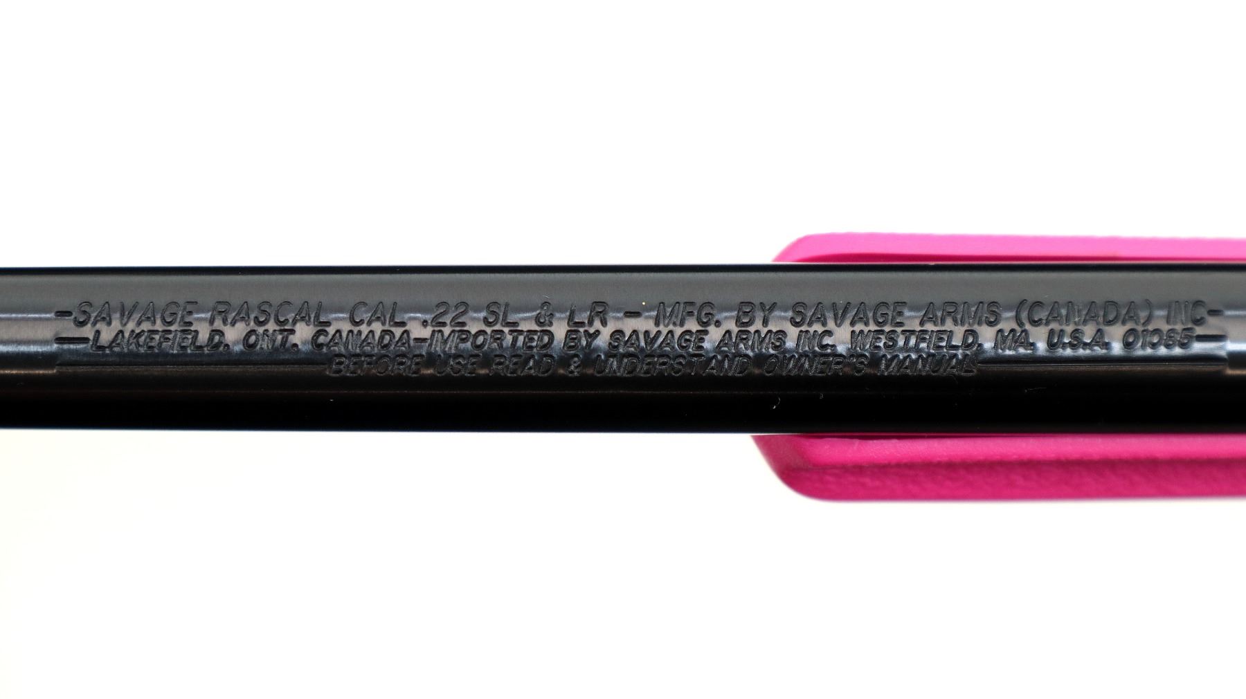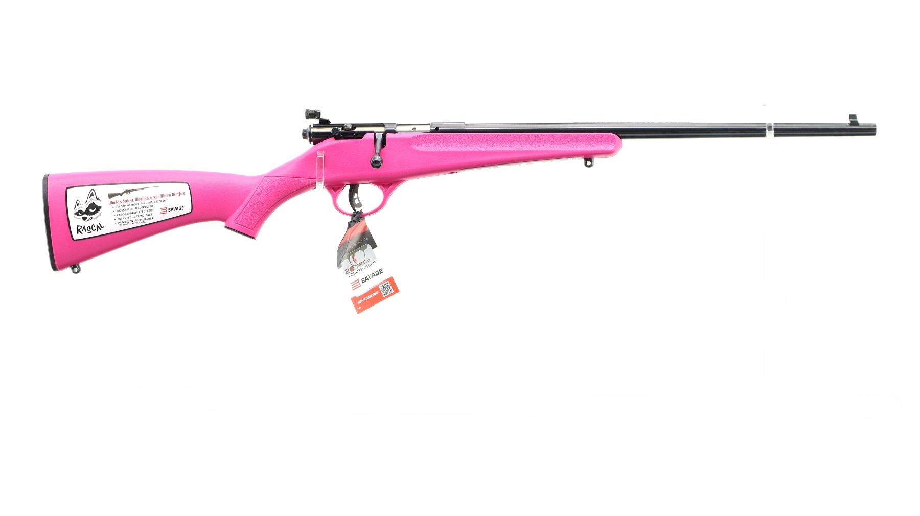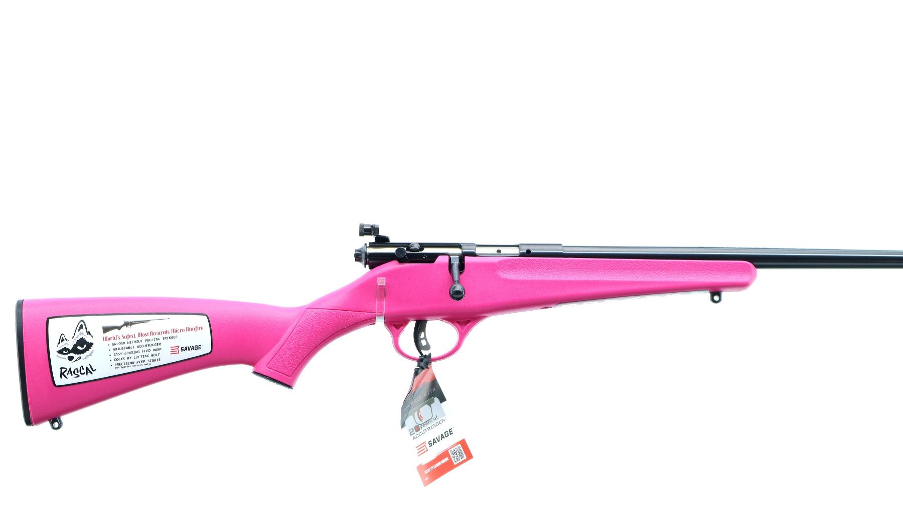 Main Description: Blade front sight, adjustable rear peep sight, blued finish, receiver drilled and tapped with no plug screws installed, smooth bolt knob. One piece pink synthetic stock, textured forearm and pistol grip, black polymer butt plate, 11.5" LOP, grip cap, accu trigger, swivel studs, retains factory stickers and hang tag.