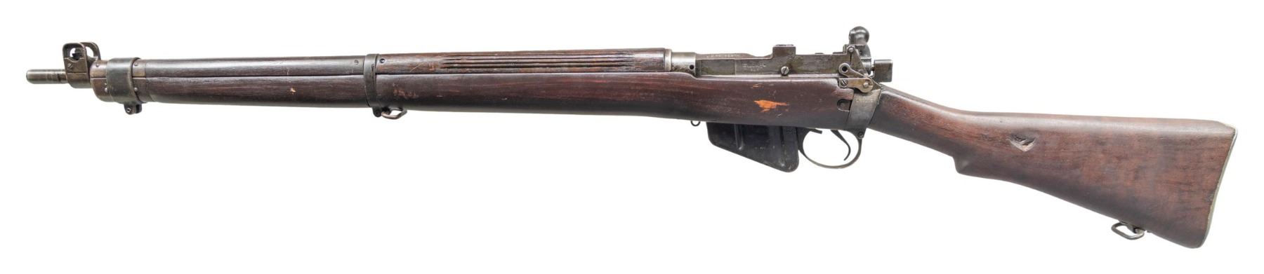 Cal. 303 Brit. S# 48C1137. Bbl. 25". Blade front sight with protective ears. Flip up aperture rear sight with 300 & 600yd settings. All visible parts are mismatched or unnumbered. Receiver ring has crown "BNP" proof. Left side rail has "US PROPERTY" marking. Left side of receiver has blocky Savage "S", No. 4 MKI* & 1943 date. Hardwood stock set with "FR" rebuild marking on right side of butt & bottom mounted sling swivels. MAGS: 1-10 rd. detachable. CONDITION: stock set has a refinished appearance with added finish, a heavy gouge on left side of butt, a couple smaller gouges, scattered dings, staining & handling wear. Metal is primarily a gray patina with traces of arsenal finish, scattered dried grease, oxidation & handling marks. Action functions properly when hand cycled. Bore shows scattered frosting but strong rifling. (25-2750/MJC). CURIO. $300-500.