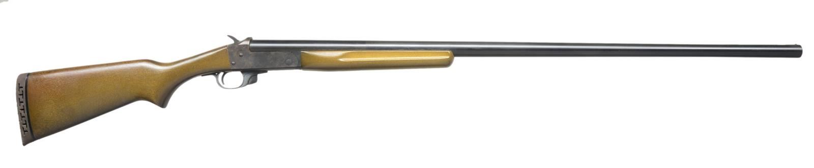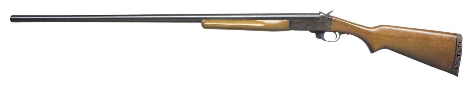Cal. 10 Ga., 3 1/2". S# D060710. Bbl. 36" plain w/ fixed Full choke & steel bead. Case colored exposed hammer break open action w/ release lever in front of plastic trigger guard. Finger grooved hardwood forearm & pistol grip stock w/ original pad. CONDITION: 98% blue & case colored metal finish. Stock has good original finish showing a few handling marks w/ sm. chips around action. Nice bright bore. (21-1665/DS). MODERN. $200-300.