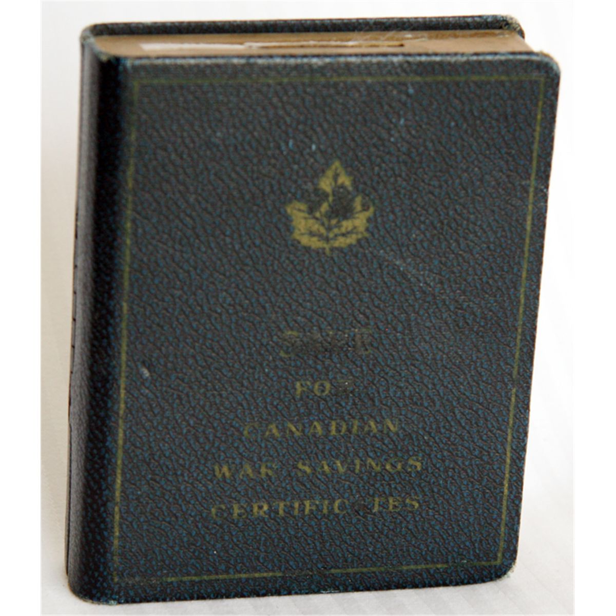 SAVE FOR CANADIAN WAR SAVINGS CERTIFICATES. Slot for coins on top. No serial number. Key lock. No key. 9cm x 11cm x 2cm. Black cloth or leatherette cover. Maker unknown. Believed to be a Gillette Safety Razor Co. of Canada war time premium. No patent information. VF.