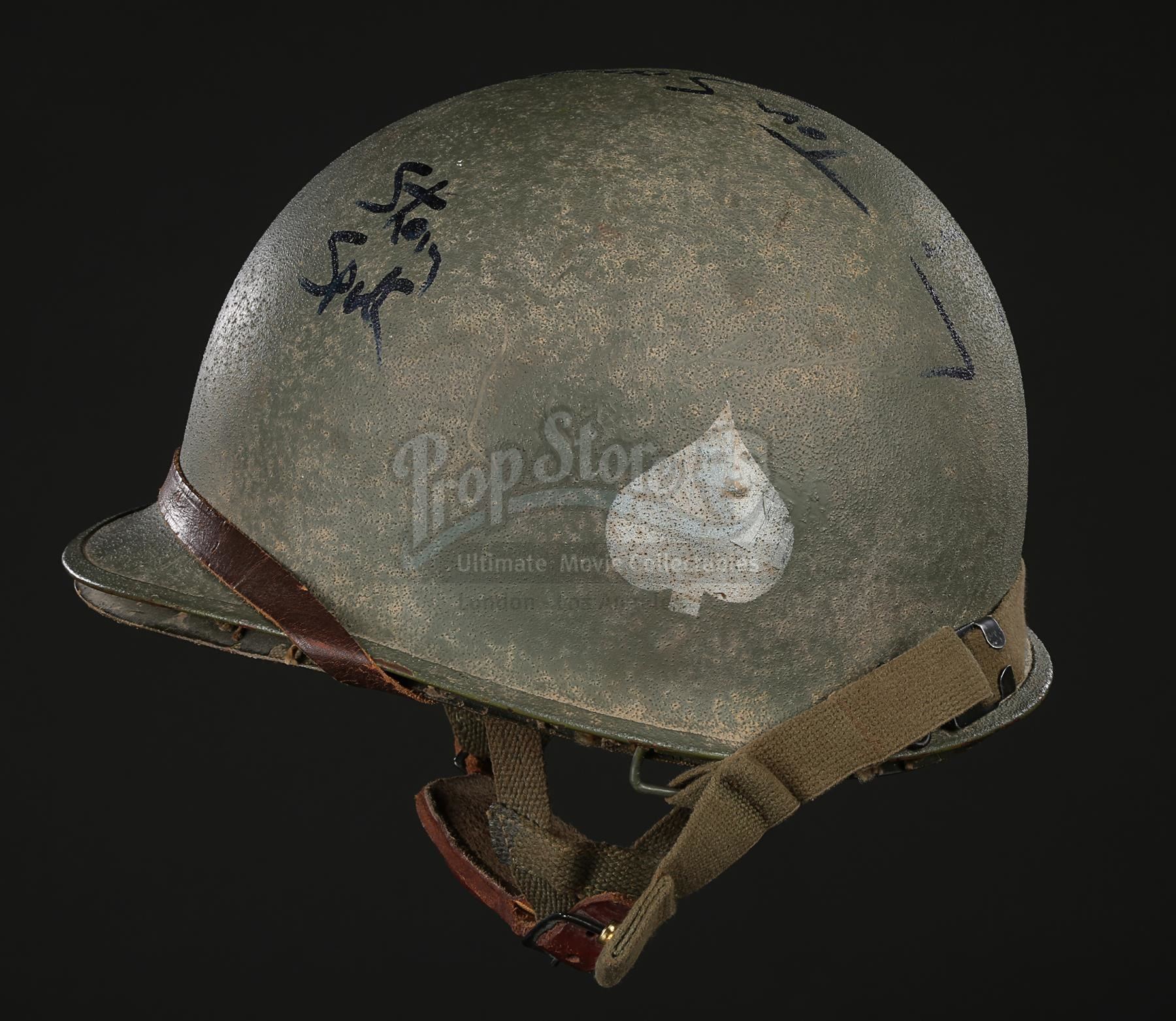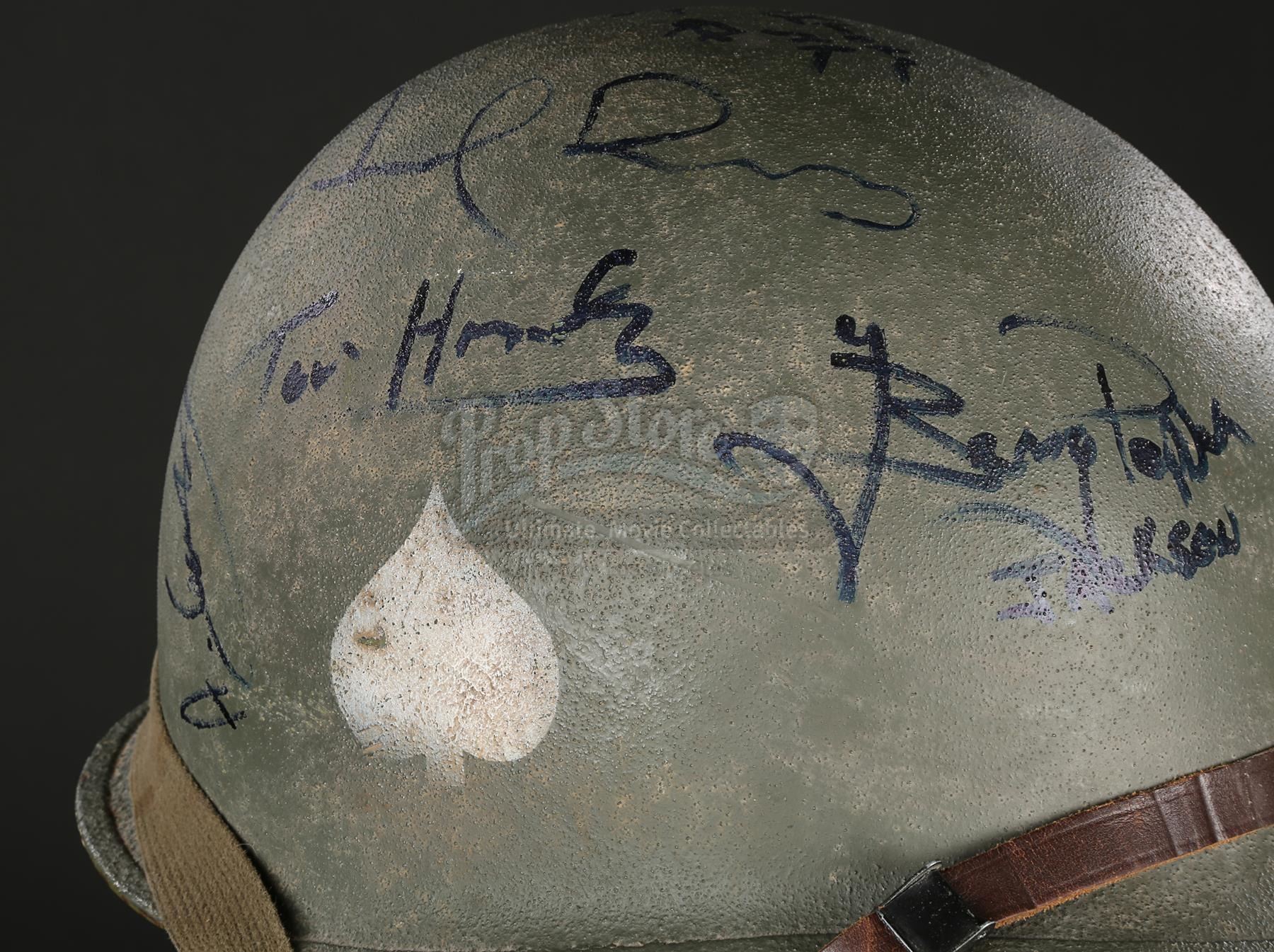 The steel M1 helmet features a specialist paratrooper liner with a leather chin strap secured within. A white 'spade' insignia is painted on either side, indicating it was worn by a member of Ryan's unit, the 506th Parachute Infantry Regiment. The helmet features autographs written in blue marker, which were gathered by a senior crew member on set; it bears the autographs of director Steven Spielberg and cast members Tom Hanks, Tom Sizemore, Barry Pepper, Adam Goldberg and Jeremy Davies. A final autograph is believed to be that of Giovanni Ribisi. Distressed for use, the helmet remains in very good condition. Dimensions: 29 cm x 23.5 cm x 20 cm (11 1/2'' x 9 1/4'' x 8'')