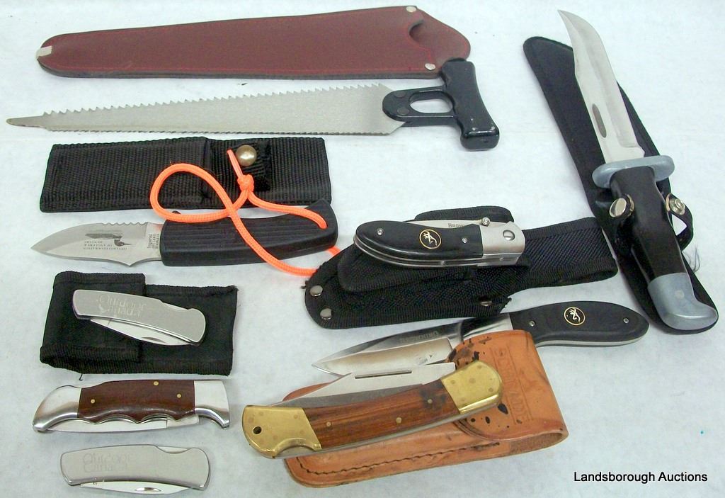 HAND SAW IN SHEATH, IMPERIAL, BROWNING COMBINATION SET, THREE POCKET, SIX INCH STRAIGHT, FOLDER.