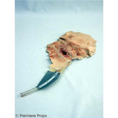 SAW III -Amanda's (Shawnee Smith) Hero Bloody Bullet Wound Neck Prosthetic with Pump (approx. 16" x 6.8"). This was worn the moment she got shot. This was rigged on her neck and is still covered in stage blood. Attached to the bullet hole on the backside is the tubing used by the prop department to pump the blood through the prosthetic to make it seem like the blood was spurting out. (3SAW2002)