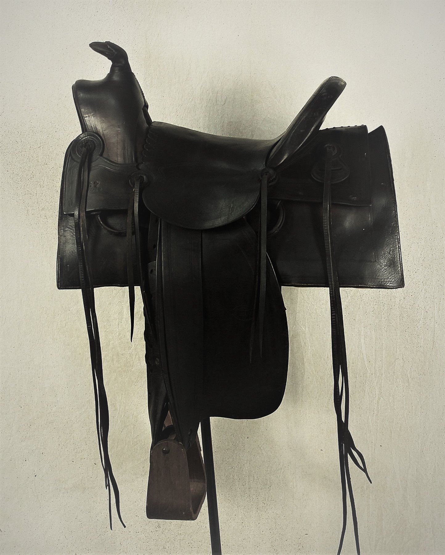 Scarce 15" slick fork saddle with tall Cheyenne rolled cantle with large square skirts and unique front end wrap. Well marked on both fenders.