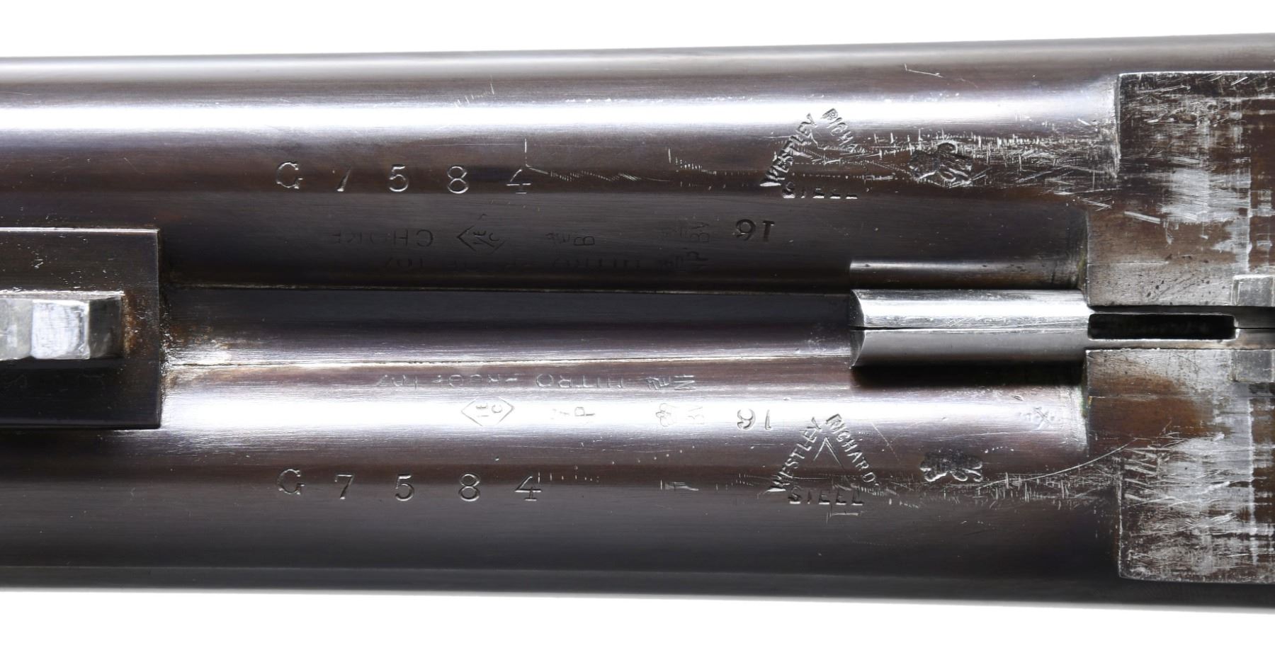 BOXLOCK EJECTOR GAME GUN. Cal. 16 Ga. 2-3/4". S# G7584. The 29-1/2" dovetailed barrels are engraved "Westley Richard & Co London" on slightly raised game rib. Barrel flats are unmarked. Bottoms of barrels are stamped with S#'s and Birmingham nitro proofs for 16 Ga. 2-1/2" chambers. Case hardened hand detachable action patent use # 3163 with removable floorplate features automatic safety, Westley Richards patent third fastener which engages long dolls head rib extension and double triggers. Detachable locks are engine turned, have cocking knobs on hammers and are engraved "L" and "R" on tops of housings. Action is engraved with near full coverage large well cut open scroll. "Westley Richards & Co" is on each side of action. Blued top lever, floorplate and trigger guard are engraved with matching scroll. S# is on trigger guard tang. Straight grip buttstock made of dark broadly marbled and somewhat stump figured European walnut measures 14-1/2" over Westley Richards embossed checkered horn buttplate. Stock features checkered side panels, drop points, fancy pattern checkering at grip and vacant silver oval. Matching splinter Deeley ejector forend with horn tip has Deeley release. MEASUREMENTS: BBLS: Bore Diameter: L .671. R .671. Restriction: L .035 (full). R .014 (light mod). Wall thickness: L .025. R .022. STOCK: DAH: 2". DAC: 1-1/2". CAST: about 3/4" off. LOP: 14-1/2". WEIGHT: 5 lb. 14 oz. CONDITION: fine as reconditioned. Barrels retaining nearly all of an attractive re-black. Action shows a good quantity of its very light case hardening color. Top lever, floorplate and trigger guard retain most of their re-blue. Engraving is softened. Stocks retain nearly all of an oil refinish with some minor later marks; checkering re-cut. Bores are bright and shiny throughout without noted problems. Action is tight. Barrels on face. Ejectors strong and in time. A dynamic gun. (25-938/MGM). CURIO. $6,000-10,000.