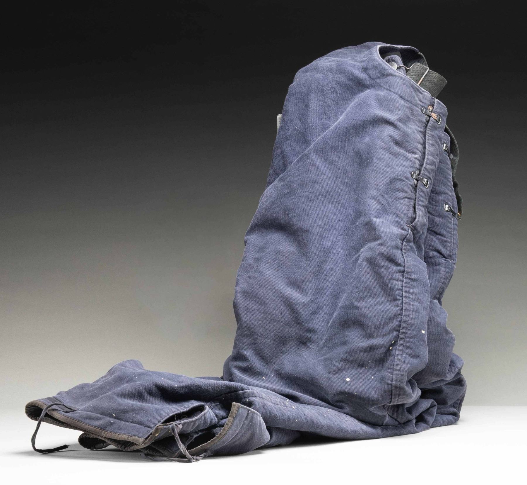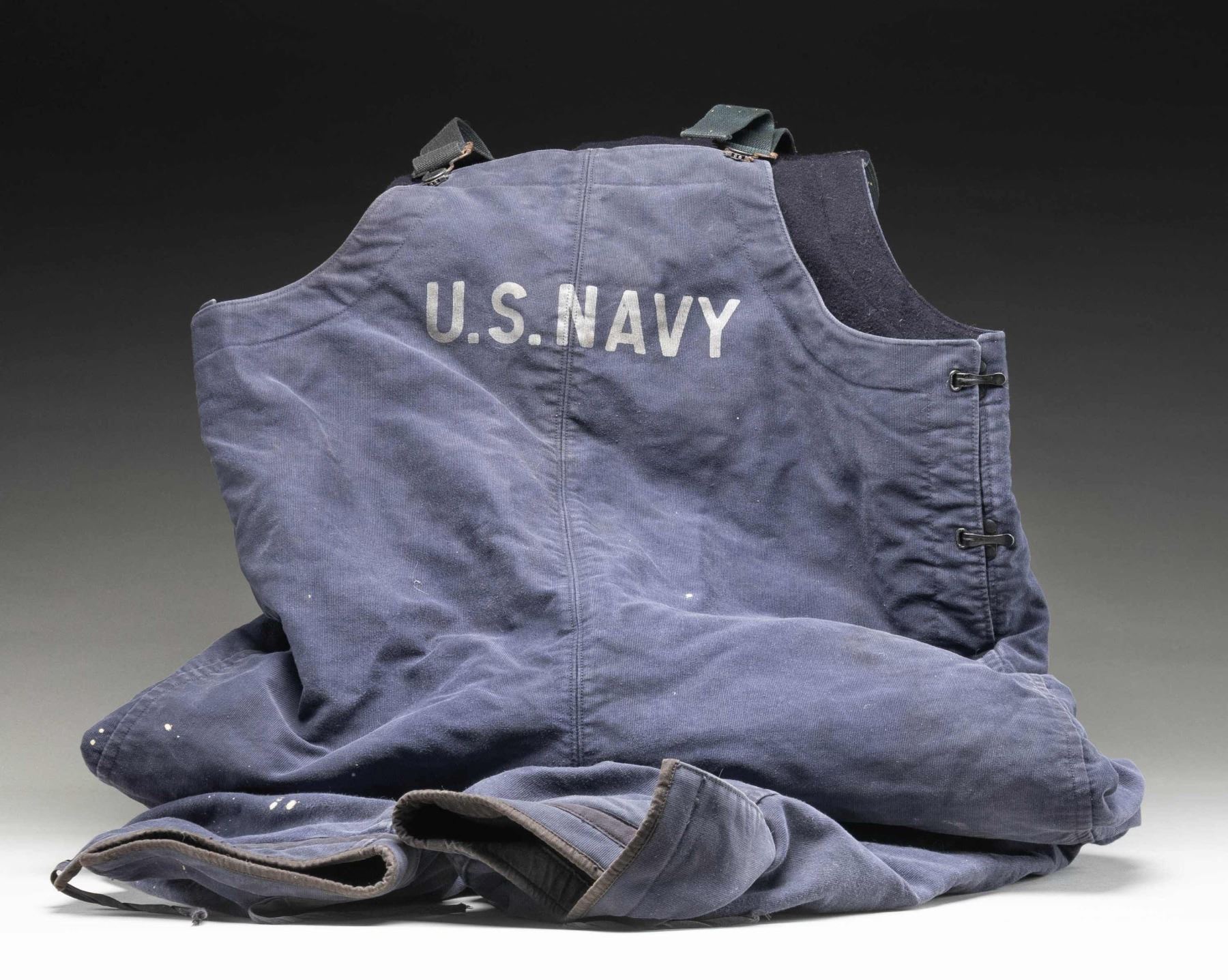 These heavy blue cotton coverall type pants are stenciled " U. S. NAVY " on the front and were produced to be worn with the 1943 U.S.Navy deck jacket. The 1943 jacket has the rare hook closures that only lasted for one year and these pants have the same hook closure. The hook closure was developed because the zipper on the previous model was difficult to use with gloves on and often became frozen in foul weather. The large white stencil on the pants as well as the jacket was to prevent confusion with enemy forces during actions ashore. A tag in the back of the pants reads : NAVY DEPARTMENT Contract NXss25614 Size Large ". CONDITION: light wear overall with a clear stencil and good tag. (02-25122/BF). $150-300.