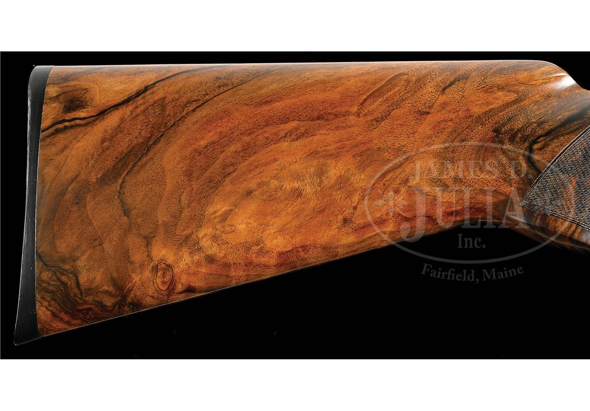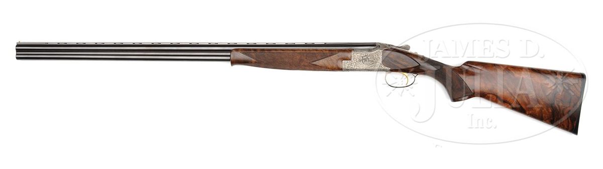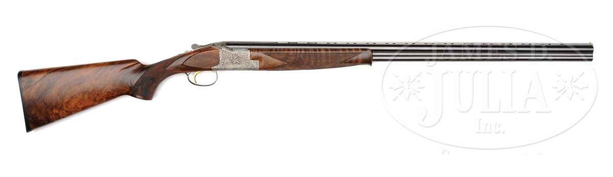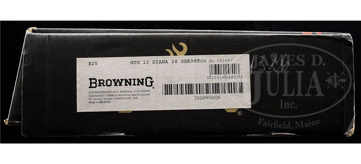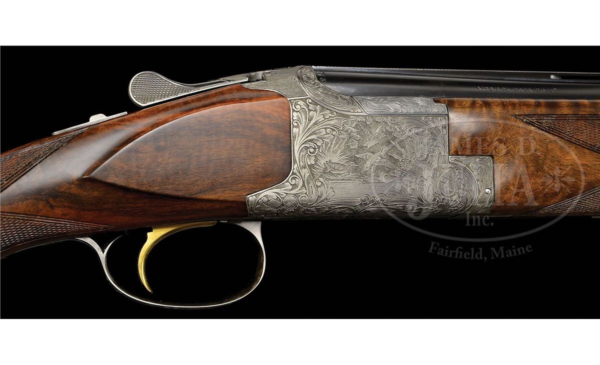 SN 324MW04326. Cal. 28 ga. 29-5/8" Ventilated rib bbls, choked I mod and I mod, have Browning S. A. marks on top bbl. Classic coin finished action is engraved with large, open, scrolled acanthus framing vignettes of pheasants on left side, ducks on right, with pair of bobwhite on bottom. A pair of rabbits is on trigger guard bow. Engraving is signed "C. BAERTEN" under left scene. Beautifully marbled and stump figured, oil finished European walnut, long tang, square knob buttstock measures 14" over composition Browning buttplate. Fiddle figured one piece forend has schnabeled tip. Drop at heel: 2-7/16", drop at comb: 1-1/2". Weight: 6 lbs. 8 oz. LOP: 14". Orig black, gold, and red Browning box with red plastic handle, has end label matching this gun, and contains paperwork and wrapping tissue. CONDITION: Near new, with evidence of very little firing. Essentially all orig finishes are intact and unmarred. Box is excellent with a few minor creases and slight rubs. Interior shows some compressions in foam. Paperwork is excellent. 4-49171 MGM250