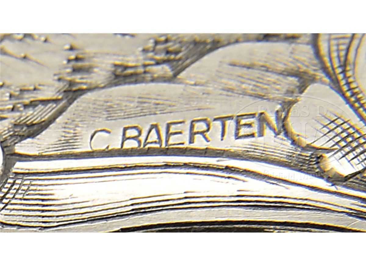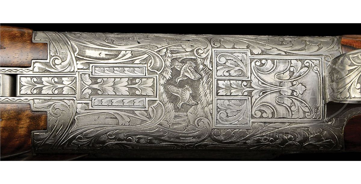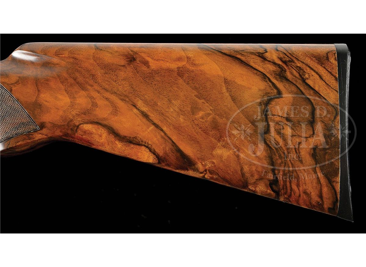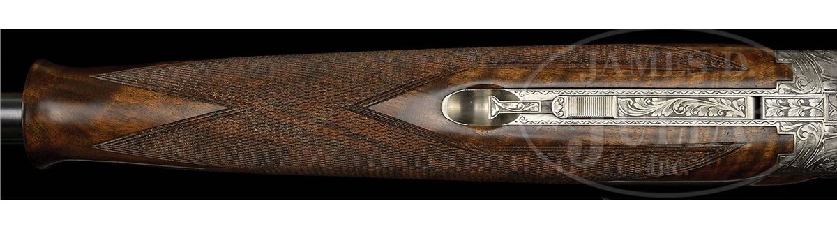 SN 324MW04326. Cal. 28 ga. 29-5/8" Ventilated rib bbls, choked I mod and I mod, have Browning S. A. marks on top bbl. Classic coin finished action is engraved with large, open, scrolled acanthus framing vignettes of pheasants on left side, ducks on right, with pair of bobwhite on bottom. A pair of rabbits is on trigger guard bow. Engraving is signed "C. BAERTEN" under left scene. Beautifully marbled and stump figured, oil finished European walnut, long tang, square knob buttstock measures 14" over composition Browning buttplate. Fiddle figured one piece forend has schnabeled tip. Drop at heel: 2-7/16", drop at comb: 1-1/2". Weight: 6 lbs. 8 oz. LOP: 14". Orig black, gold, and red Browning box with red plastic handle, has end label matching this gun, and contains paperwork and wrapping tissue. CONDITION: Near new, with evidence of very little firing. Essentially all orig finishes are intact and unmarred. Box is excellent with a few minor creases and slight rubs. Interior shows some compressions in foam. Paperwork is excellent. 4-49171 MGM250