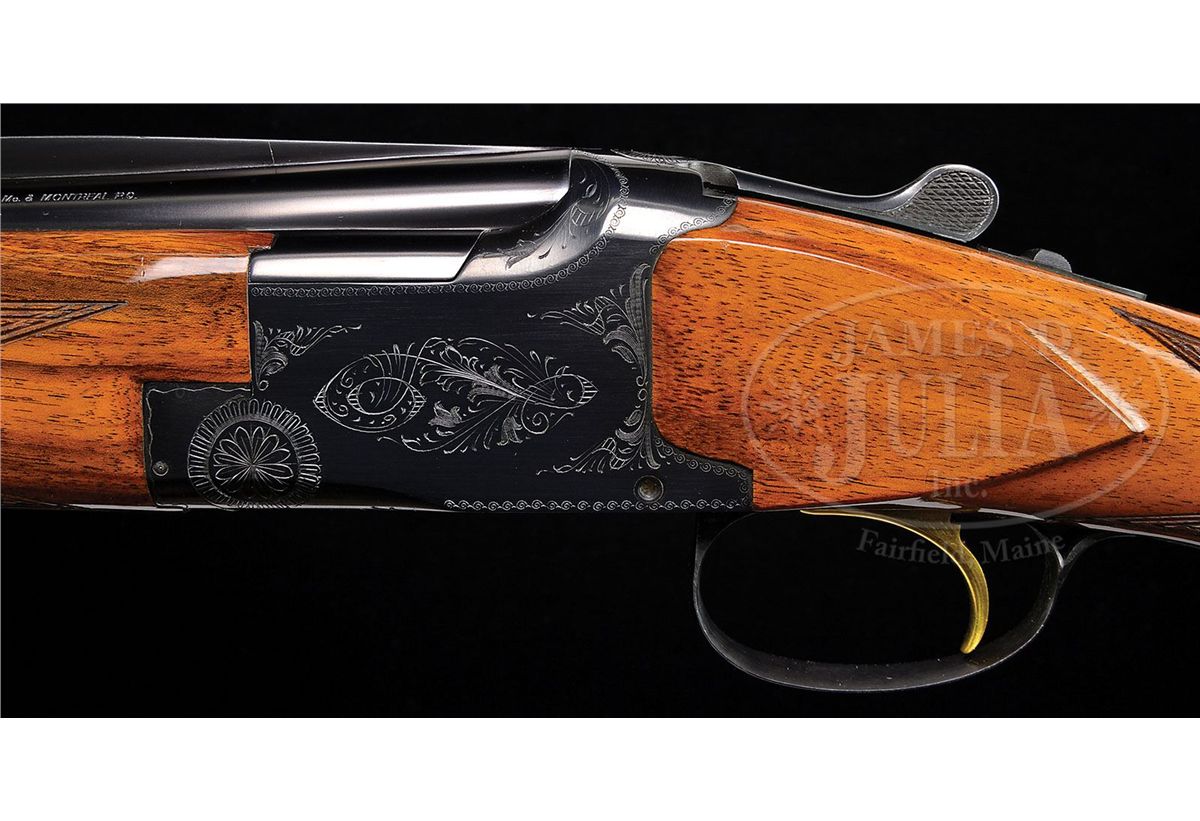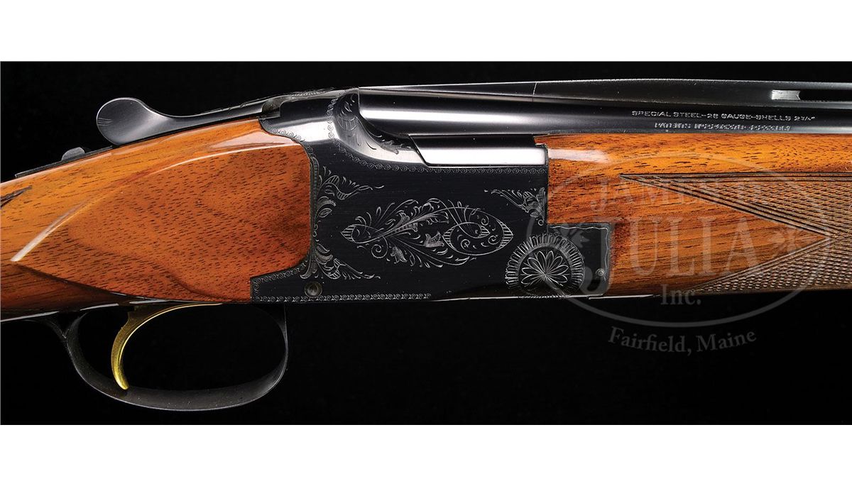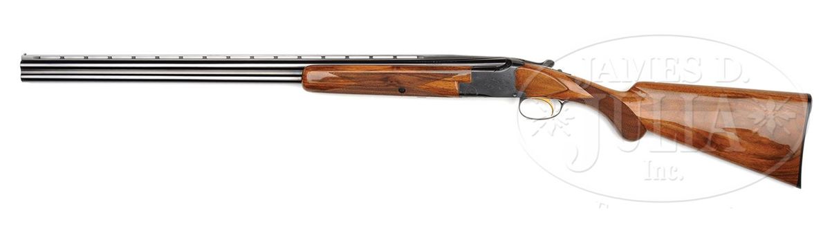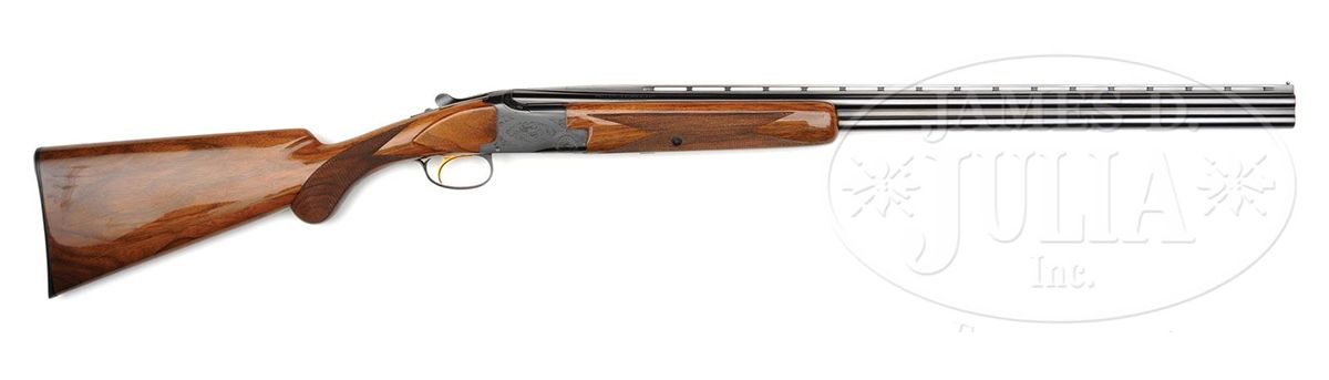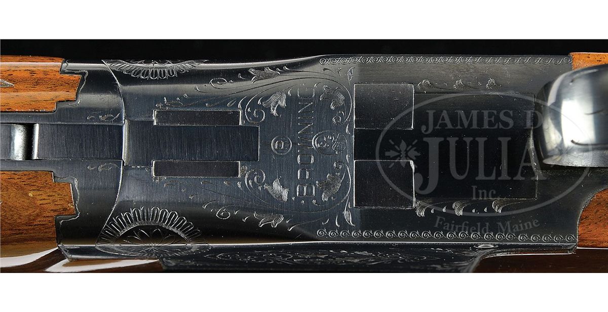 SN 1221F6. Cal. 28 ga. 2-3/4" Chambers. This 1966 production gun has 28" ventilated rib bbls with correct nomenclature on either side of rib, and is choked modified and full. Typical blued standard grade action has classic open scroll engraving. Relatively plain American walnut long tang, round knob buttstock has Browning composition buttplate, and gun is fitted with small rounded field forend. Drop at heel: 2-3/16", drop at comb: 1-1/2". Weight: 6 lbs. 12 oz. LOP: 14-1/4". CONDITION: Excellent, nearly unfired, with only a few slight marks on bbls, mostly from sliding of forend, and some marks around safety from its operation. There are a few light marks and scratches in orig varnish, most noticeable being a small ping between checkering and comb on left side of buttstock. Checkering is slightly darkened. Bores are excellent. Mechanically crisp. 4-48885 MGM205