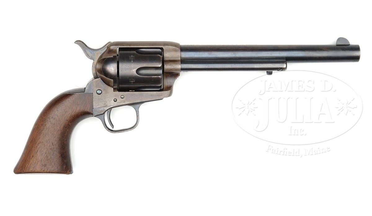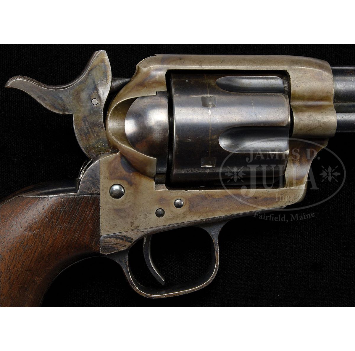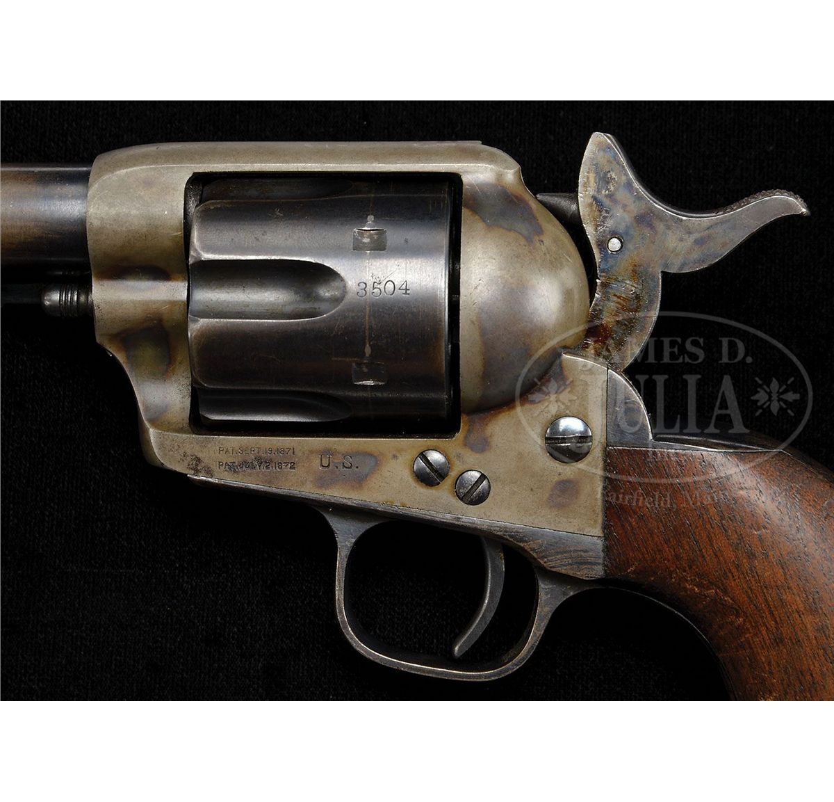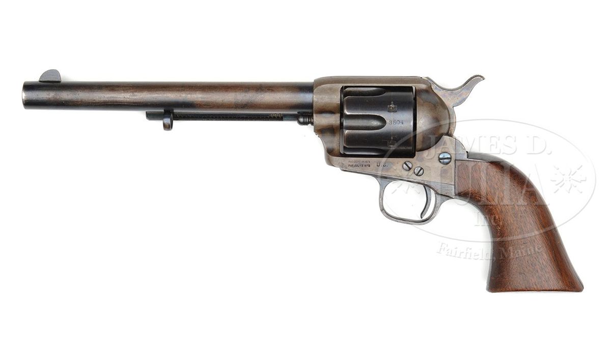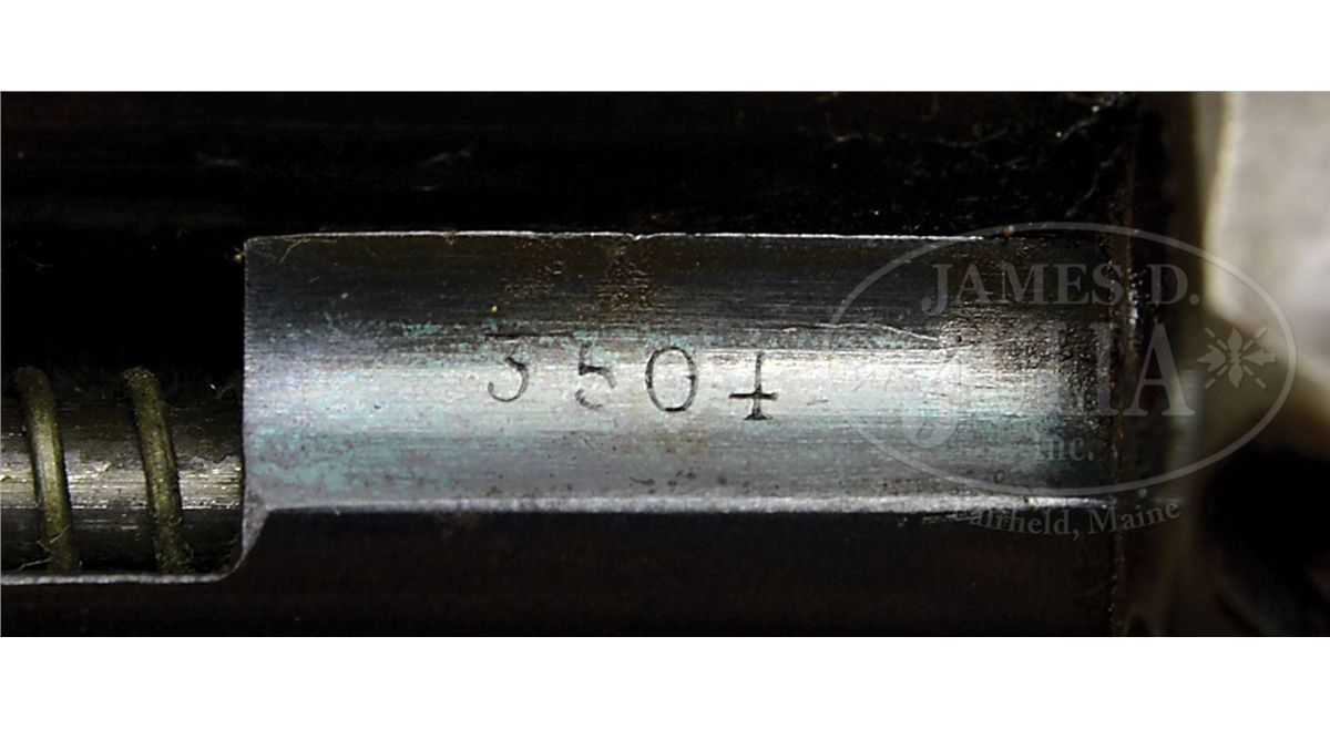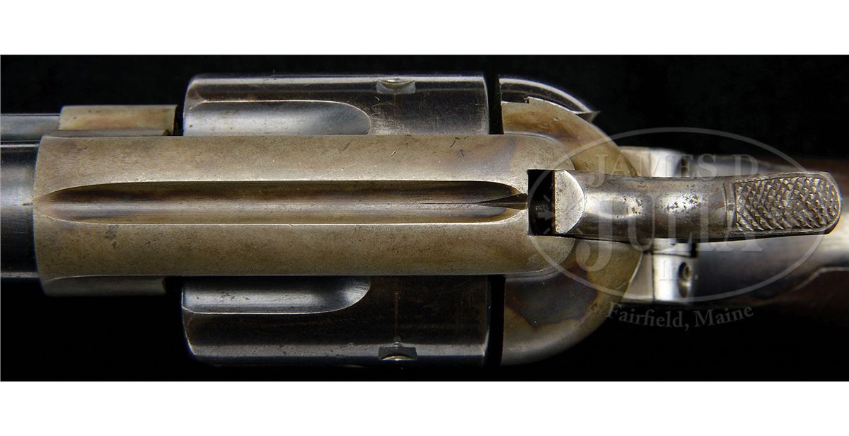 SN 3504. Cal. 45 Colt. Blue & color case hardened with 7-1/2" bbl, full front sight and 1-line script address with serifs at each end. Left side of frame has 2-line, 2-patent dates and "U.S.". Mounted with what is probably a field replacement 1-pc walnut grip that has the SN "3604" in the backstrap channel and a tiny "L.D." on right side. These initials apparently are those of sub-inspector Lewis Draper who worked only a short period of time in 1876, which indicates that since this revolver was manufactured in 1874, the grip could not have been replaced any earlier than 1876. The SN in backstrap channel is in pencil instead of India ink indicating that it was added later. Various parts, including bbl, trigger guard, cylinder & backstrap have the tiny inspector initial "A" (Orville W. Ainsworth). Base pin is correct type with dimpled ends and the ejector housing is first type with bull's eye ejector rod head and has the extremely rare feature of matching SN in the left gullet at the frame. Page 270 of A Study of the Colt Single Action Army Revolver, Graham, Kopec & Moore, as of that writing (1976), lists only ten such numbered ejector housings, now eleven, including this one. Obviously there may be others. Cylinder is of the earliest type with small stop notches and tiny approaches. Buttstrap appears to have had the toe beveled slightly. It is well documented that the vast majority of these early Cavalry Colts were issued to front-line units and saw continuous hard us on the frontier. They are rarely found with high orig finish and the majority of them were recalled in the 1890s and early 20th century where they were converted to artillery configuration. That this revolver remains in full Cavalry configuration attests to the theory that it was probably re-issued to a militia unit where it remained until sold as surplus. CONDITION: Very good to fine. Bbl retains about 60% strong orig blue with the majority of the losses on left side that appears to be from long term storage in a holster and is now a medium brown patina; frame retains case colors in sheltered areas being mostly a dark gray patina; hammer retains very bright case colors on sides & rear edge with top edge turned dark; cylinder retains bright blue in the flutes, somewhat dull on outer diameter and showing wear on the front & rear edges; trigger guard & backstrap retain strong, bright blue in sheltered areas with candy striping mixed with blue on front & back straps; ejector housing retains about 92-93% strong orig blue. Grip has chipped toes, otherwise is sound with a few light nicks & scratches and shows a handworn patina. Mechanics are crisp, bright shiny bore. 4-48808 JR363