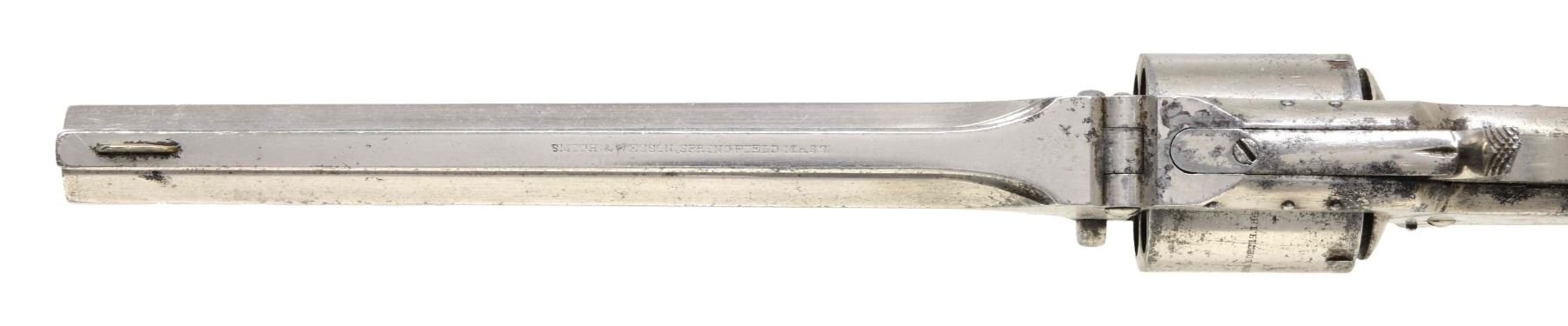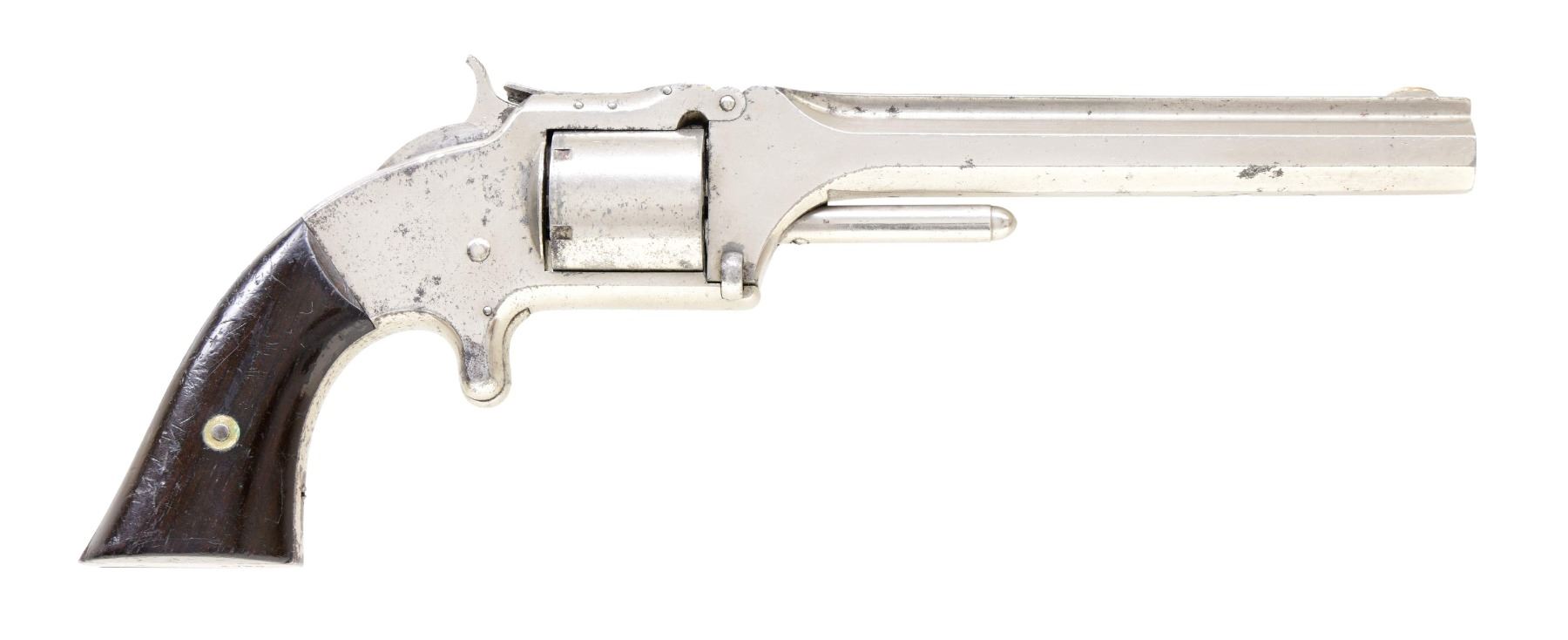 REVOLVER. Cal. 32. S# 47673. Standard configuration late 1865 manufactured S&W No. 2 revolver, 6" barrel, scarce custom all nickel factory finish. UNATTACHED ACCESSORIES: file with vintage collection photographs. CONDITION: very good to fine overall, all original, matching serial numbers and assembly markings, sharp edges, 90% original nickel finish. Hammer spur has broken tip, grips retain most of their factory varnish with moderate edge wear. Mechanically fine, good rifled bore. PROVENANCE: Lifelong collection of Robert "Mike" Bricker. (01-24977/JS). ANTIQUE. $500-700.