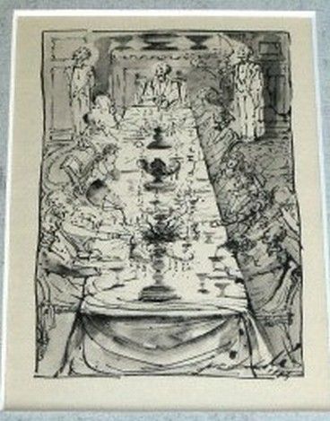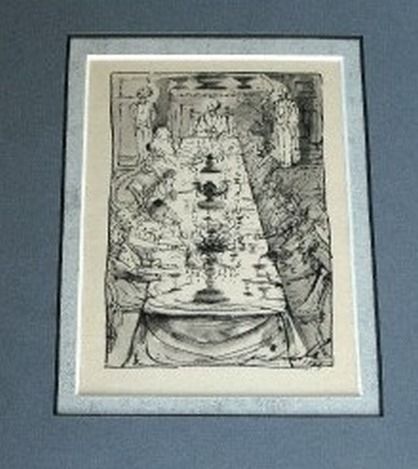 RARE ANTIQUE 1945 DALI LITHOGRAPH - ELONGATED DINING TABLE - PRINTED IN 1945 - SIGNED IN THE PLATE - BEAUTIFULLY FRAMED AND DOUBLE MATTED - IMAGE APPX 3.5" X 6" - FRAMED APPX 12" X 10" --