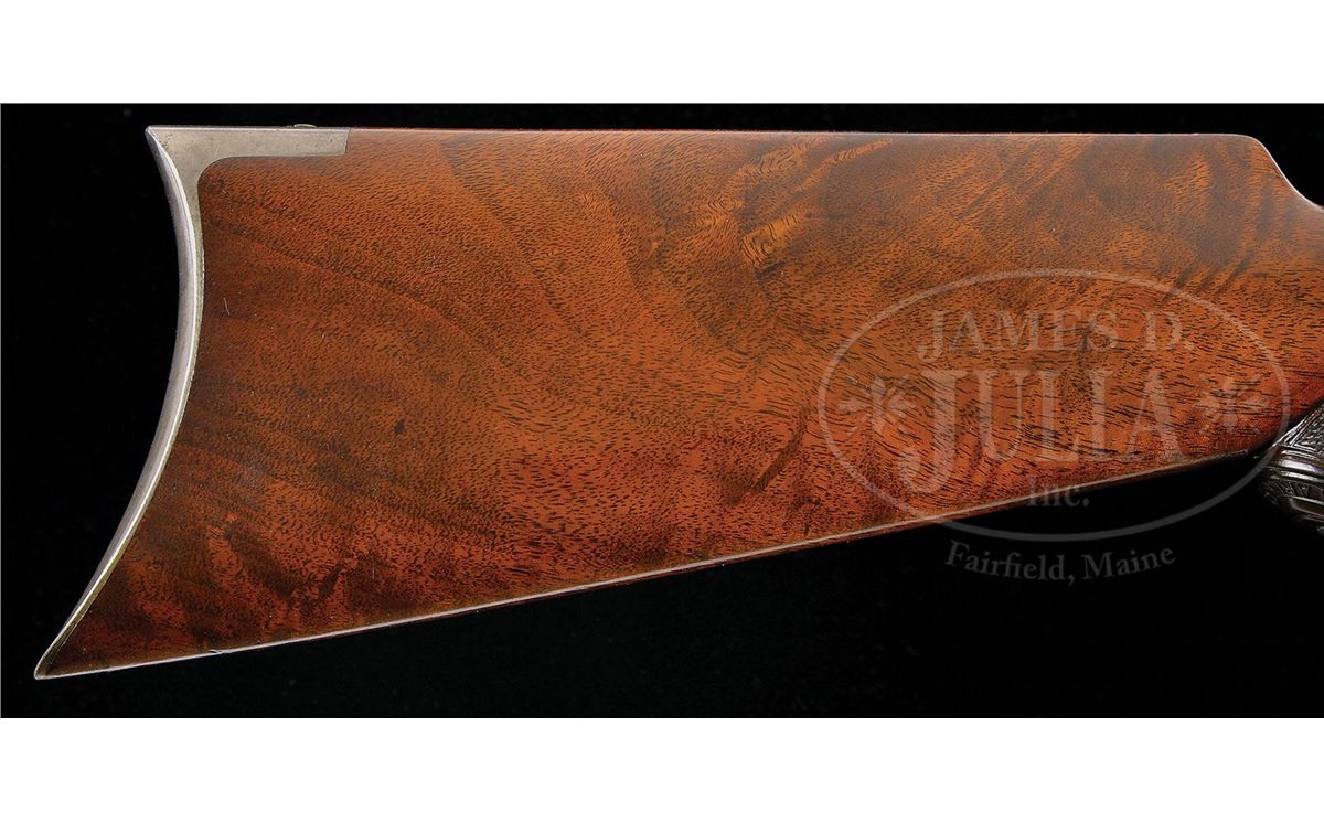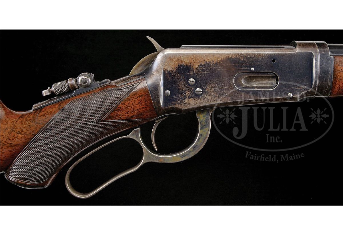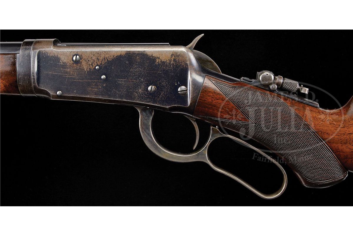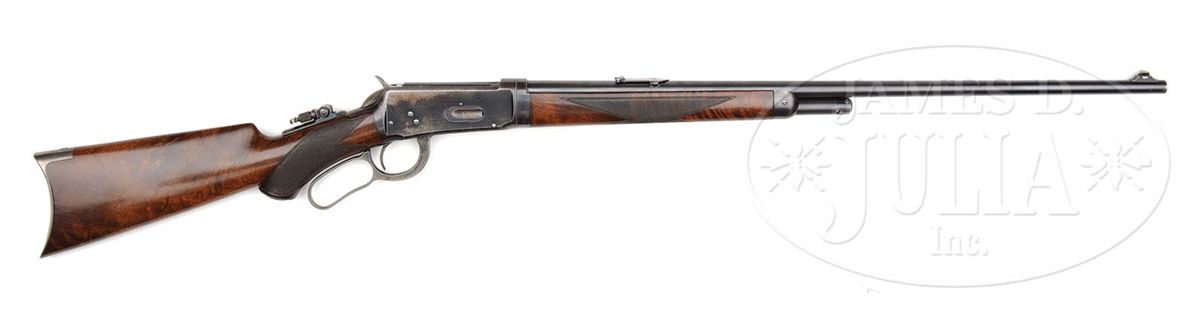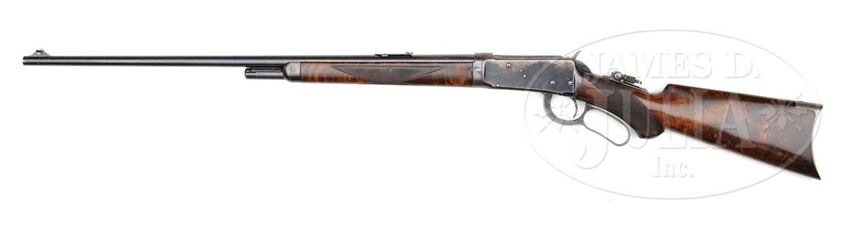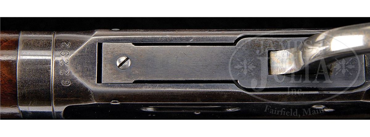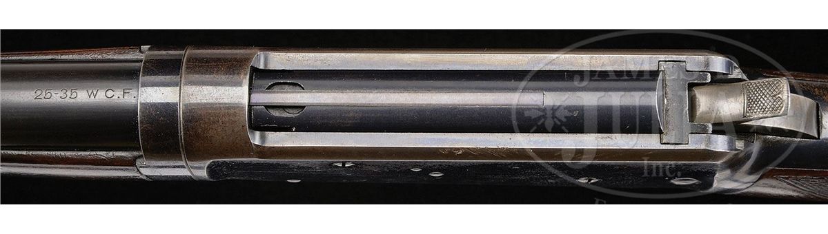 SN 62292. Cal. 25-35. Beautiful and scarce deluxe '94 with 26" extra light, tapered rnd bbl with pedestal mounted sporting front sight, Marble's folding leaf rear sight & a locking Lyman tang sight. It has half magazine and is a takedown. Mounted with extremely beautiful burl & flame grain American walnut with H-style checkered forearm and capped pistol grip stock with crescent buttplate. Left side of the lower tang is marked with assembly # "7484" which number is also found on the rear face of the buttstock and inside toe of buttplate. This is a fine second yr production deluxe 94 in a scarce configuration in an equally scarce caliber. CONDITION: Very fine, all matching. Bbl, magazine tube & forend cap retain most of their bright orig factory blue with some thinning on the forend cap and a couple of small spots of wear and a scratch around the front sight. Takedown ring retains most of it's orig blue, slightly thinned on the bottom. Receiver retains 65-70% orig blue with the loss areas flaked, not worn, to a light patina. Bottom edges of the rifle and floorplate show thinning. Lever & hammer retain strong, bright case colors on the sides faded to silver on the outter faces. Buttplate retains smoky case colors. Wood is sound with a few minor nicks & scratches and retains most of a fine professionally restored finish. Mechanics are crisp. Bright, shiny bore. 4-49014 JR158