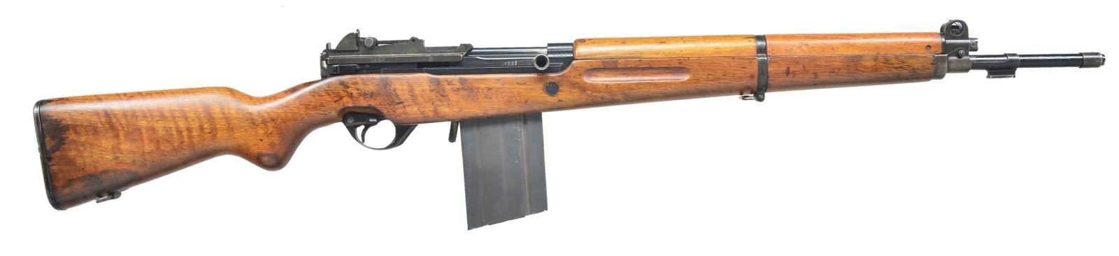 Cal 7.62x51 NATO. S # 1837. Bbl. 23". Right side of bolt, top cover & stock have matching numbers. These rifles were converted from 7.65 Argentine to 7.62 NATO in the 1960's & given 20 rd. magazines. The magazines are similar to FAL magazines but are not interchangeable. Receiver ring marked w/ Argentine crest. Left side marked w/ boxed "ARA" for Argentine navy. Left side rail marked "FABRIQUE NATIONALE D"ARMES DE GUERRE HERSTAL BELGIQUE". Tangent aperture rear sight graduated to 1000 meters. Blade front sight w/ protective ears. Bbl. has muzzle cap installed. Walnut stock set w/ trap buttplate. Left side of butt marked w/ boxed "ARA" navy cartouche. MAGS: 1 20 Rd. detachable mag. CONDITION: refinished walnut stock set shows added oil finish, a 2" crack on left side of wrist, a couple other repaired cracks, a putty repaired gouge in right side of grasping groove & scattered handling marks. Metal retains 60% arsenal rework black paint w/ a few areas turning to brown patina most notably on front sight assembly & scattered flaking. Very good bore. (22-2473/MJC). CURIO. $500-800.