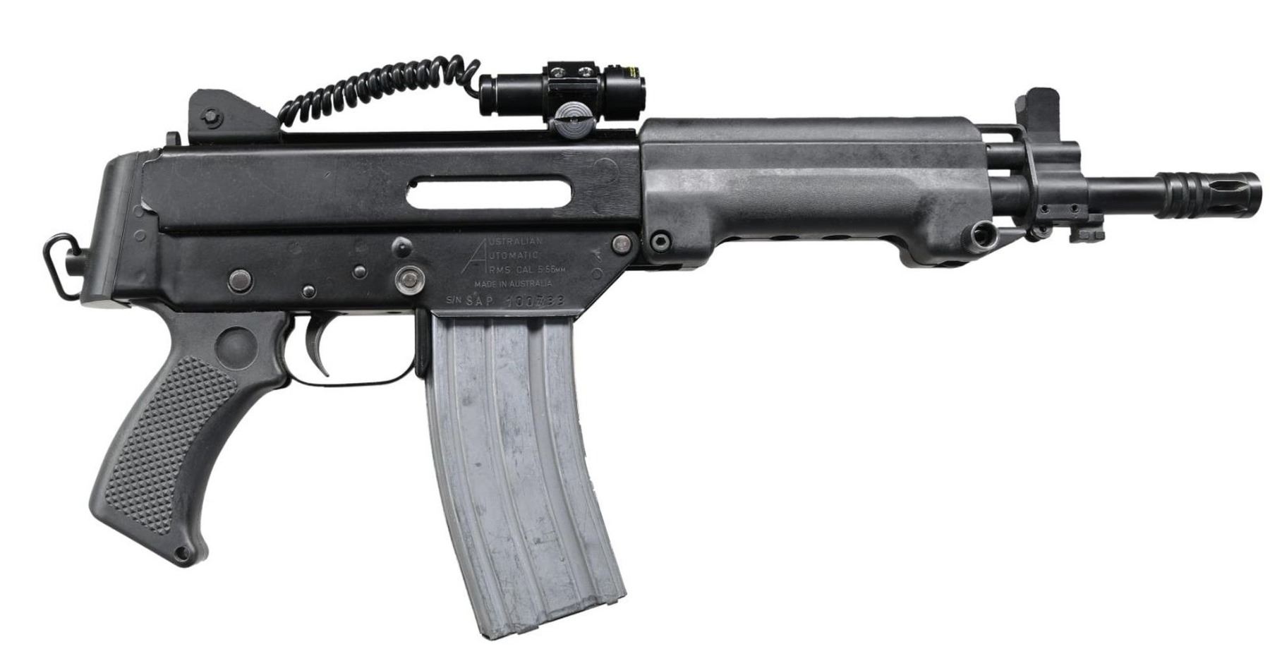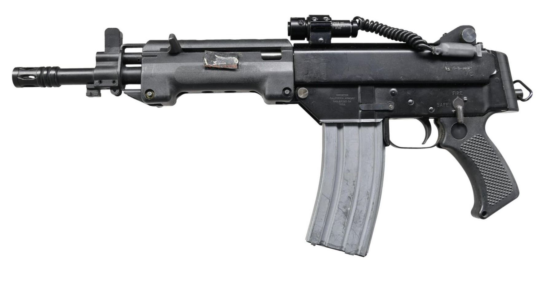 SEMI-AUTOMATIC PISTOL. Cal. 5.56mm. S# SAP100733. Bbl. 10". 1 of only approximately 700 "Tasmanian Devil" SAP pistols mfg. by Australian Automatic Arms that were imported into the United States prior to the U.S. assault weapons importation ban. The right side of the receiver is marked with Australian Automatic Arms' mfg. information, as well as with the cal. designation and S#, with California Armory's importer information marked on the left. Metal components exhibit a black enamel type finish overall. Checkered black polymer pistol grip, with textured 2-piece handguards. Adj. aperture rear sight. Front sight is not present. Receiver is mounted with a red laser sight. MAGS: 1 aftermarket 30-rd. mag. CONDITION: metal components retain bountiful amounts of their original factory finish, exhibiting some light superficial handling marks, as well as some very light wear on edges. Mirror bore, exhibiting well defined rifling throughout. Polymer furniture is excellent, showing some minor marks from handling and storage. A high condition example of a scarce "Tasmanian Devil" SAP pistol. PROVENANCE: Lifelong Collection of Terrance McCarty. (24-290/MLW). MODERN. $1,200-2,000.