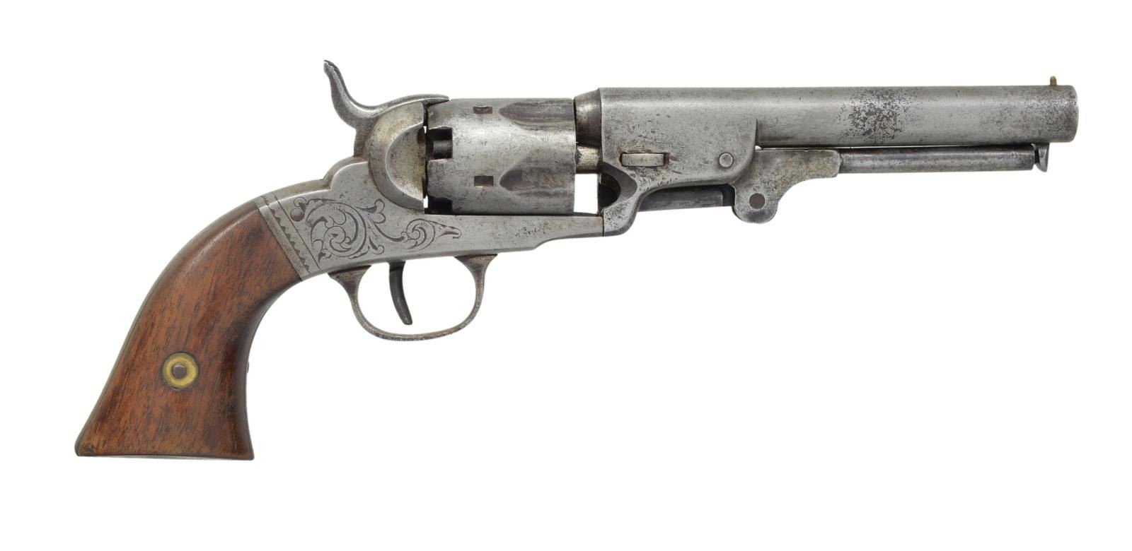 Cal. 31. S# 235. 10 1/4" Overall. Bbl. 5" rnd. marked "BACON MF'G. CO NORWICH, CONN". Fluted cyl. Engraved frame w/ 2 piece walnut grips. CONDITION: good overall, appears all matching & original. Mechanically fine w/ well defined rifled bore. PROVENANCE: Estate Collection of Dan Poppen. (01-17844/JS). ANTIQUE. $300-500.