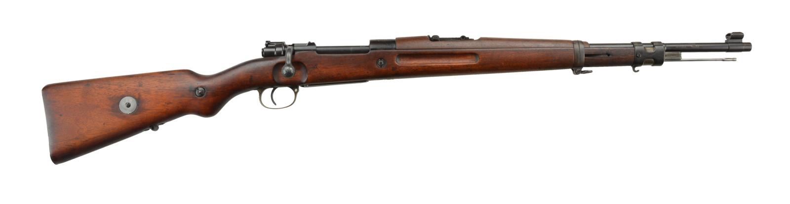 Cal. 7mm Mauser. S #1295. Floorplate and triggerguard matching but other parts unnumbered or mismatched. Bbl 22" w/ import marking. Receiver ring marked on top w/ Brazilian crest. German "BUGN" proofs on left side of receiver. Left side rail marked w/ Mauser Oberndorf markings. Right side of receiver marked "MOD 1935". It is estimated that only 1000 of these Brazilian 1935 short rifles were produced. Turned down bolt handle is a CZ replacement. Rear sight graduated to 1400 meters. Inverted V front sight w/ protectors. Chilean 1935 replacement cleaning rod. Upper band w/ parade hook. Rear band is missing band keeper. Provision for bottom & left side swivels. Flat steel buttplate. Walnut stock set w/ grasping grooves. Unmarked stock disc. CONDITION: stock set appears cleaned w/ 4" crack on both sides of wrist, some dings, stains and handling marks. Stock disc and buttplate appear cleaned. Metal shows an original blue finish fading to brown w/ a spot of pitting on rear band, pitting on bolt and scattered oxidation. Fair bore showing scattered frosting and some patches of pitting. (22-2525/MJC). CURIO. $300-500.