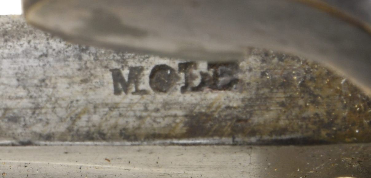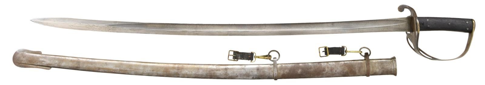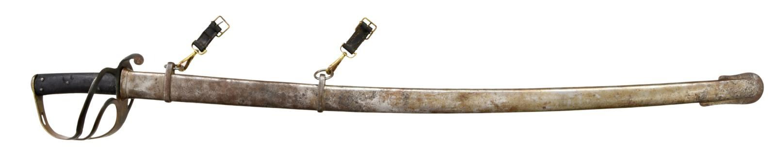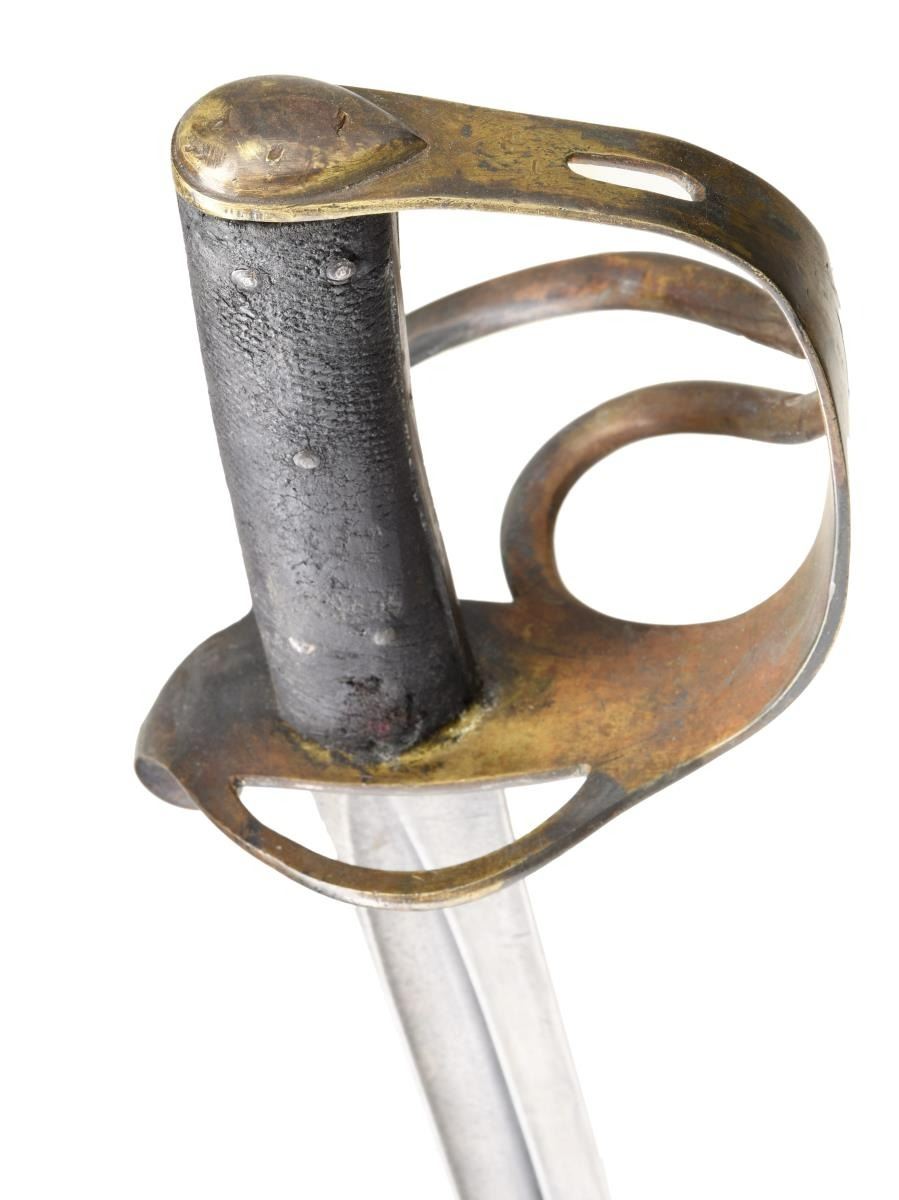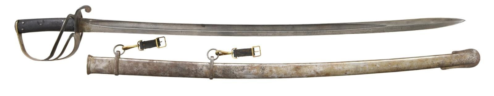 SABER BY MOLE. This fine P1853 cavalry saber measures 41" overall with a 34 1/2" blade. The plain blade has a single medium sized fuller and is boldly stamped on the spine "MOLE". British P1853 sabers, similar to this one, were extensively imported by the Confederacy during the Civil War. Many were supplied by Isaac & Co of London and are so marked. Other variants, including brass hilted examples, that are generally marked "MOLE" on the spine, may have also been supplied by Isaac & Co. Brass hilt with plain 2-branch guard and downturned quillon. Plain brass knuckle bow & simple teardrop shaped brass pommel cap. 2-Piece pressed leather grip with 5 rivets on each side. Iron scabbard with 2 brass suspension clips attached. CONDITION: blade has a medium gray patina with no nicks or pitting. Hilt has a dark mustard patina. Grips show moderate to heavy wear but remain 90% complete. Iron scabbard has a medium gray patina and is free from dents. (02-20028/BF). $2,200-2,800.